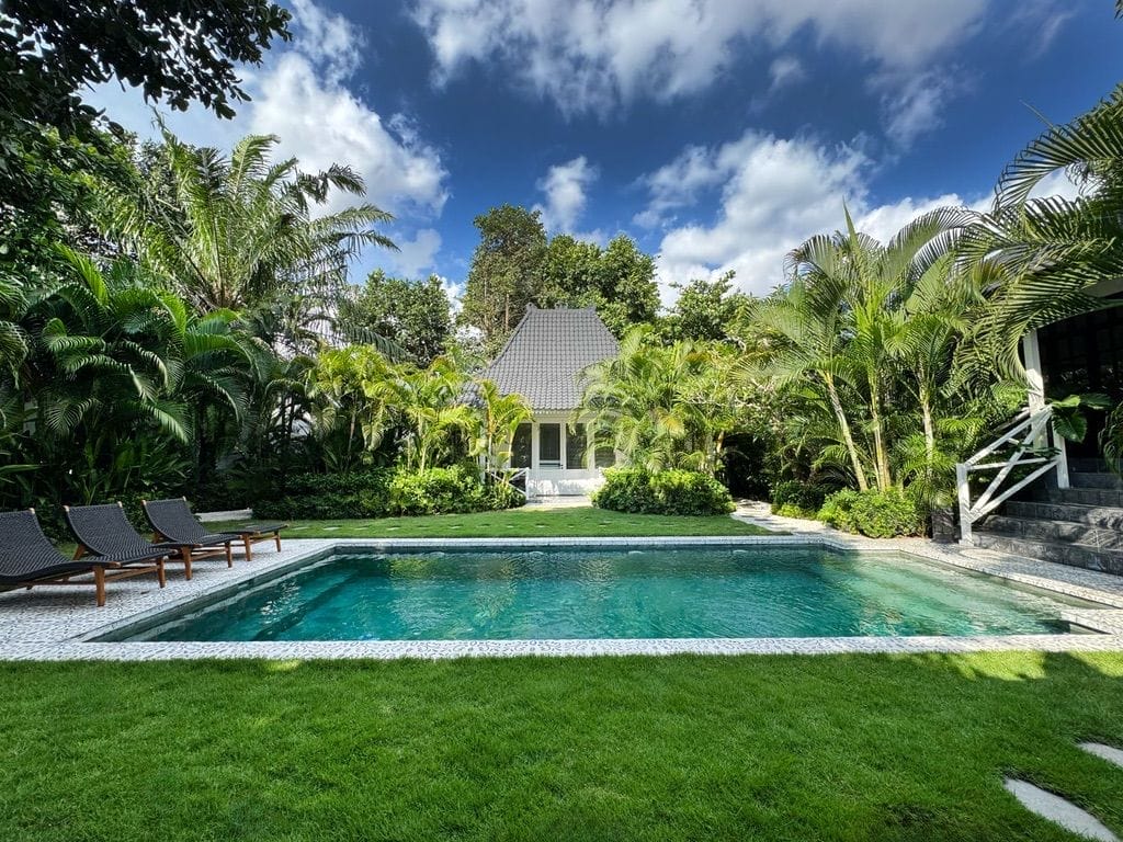 Profitez de l’espace extérieur avec une piscine privée entourée de plantes tropicales — l’endroit parfait pour se détendre et profiter du soleil.