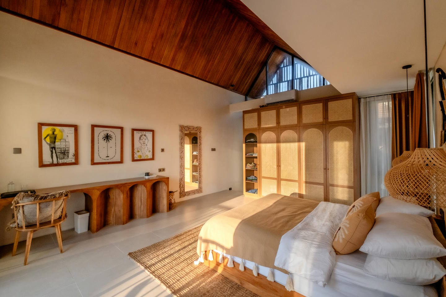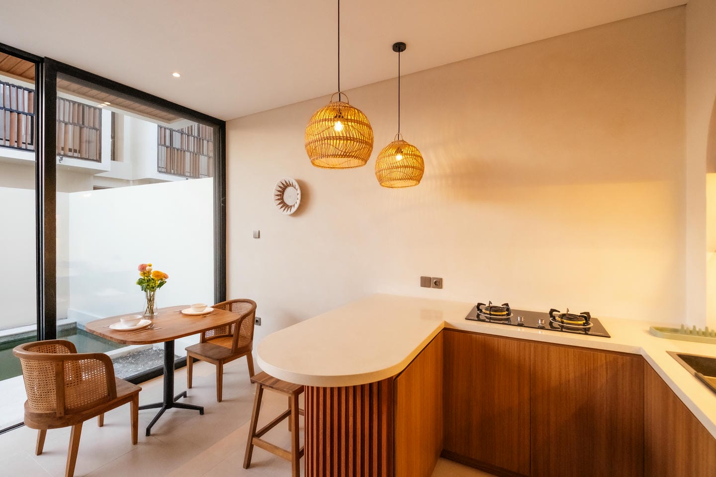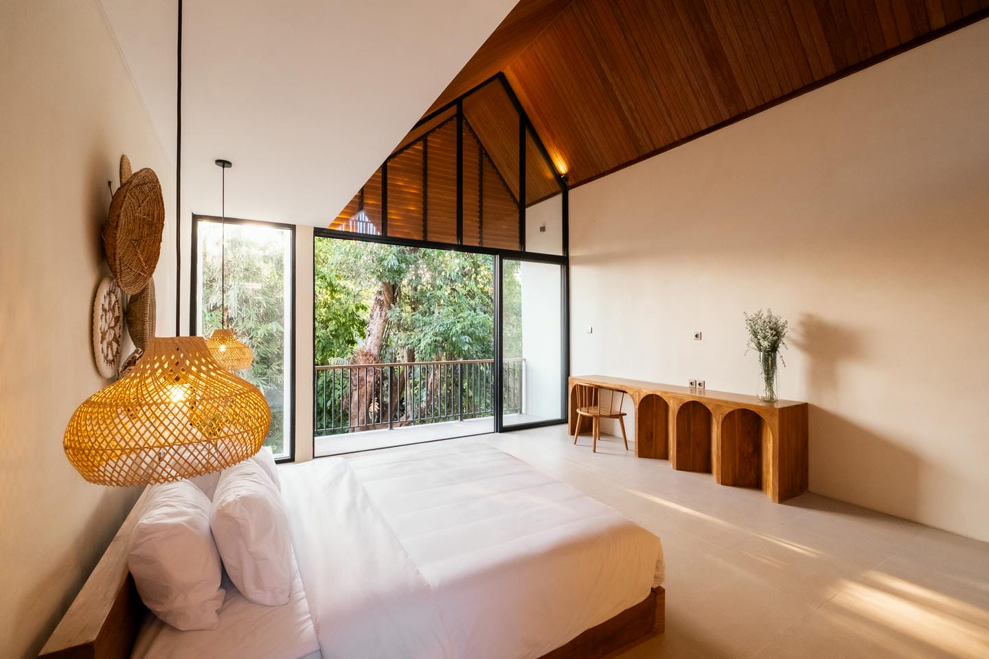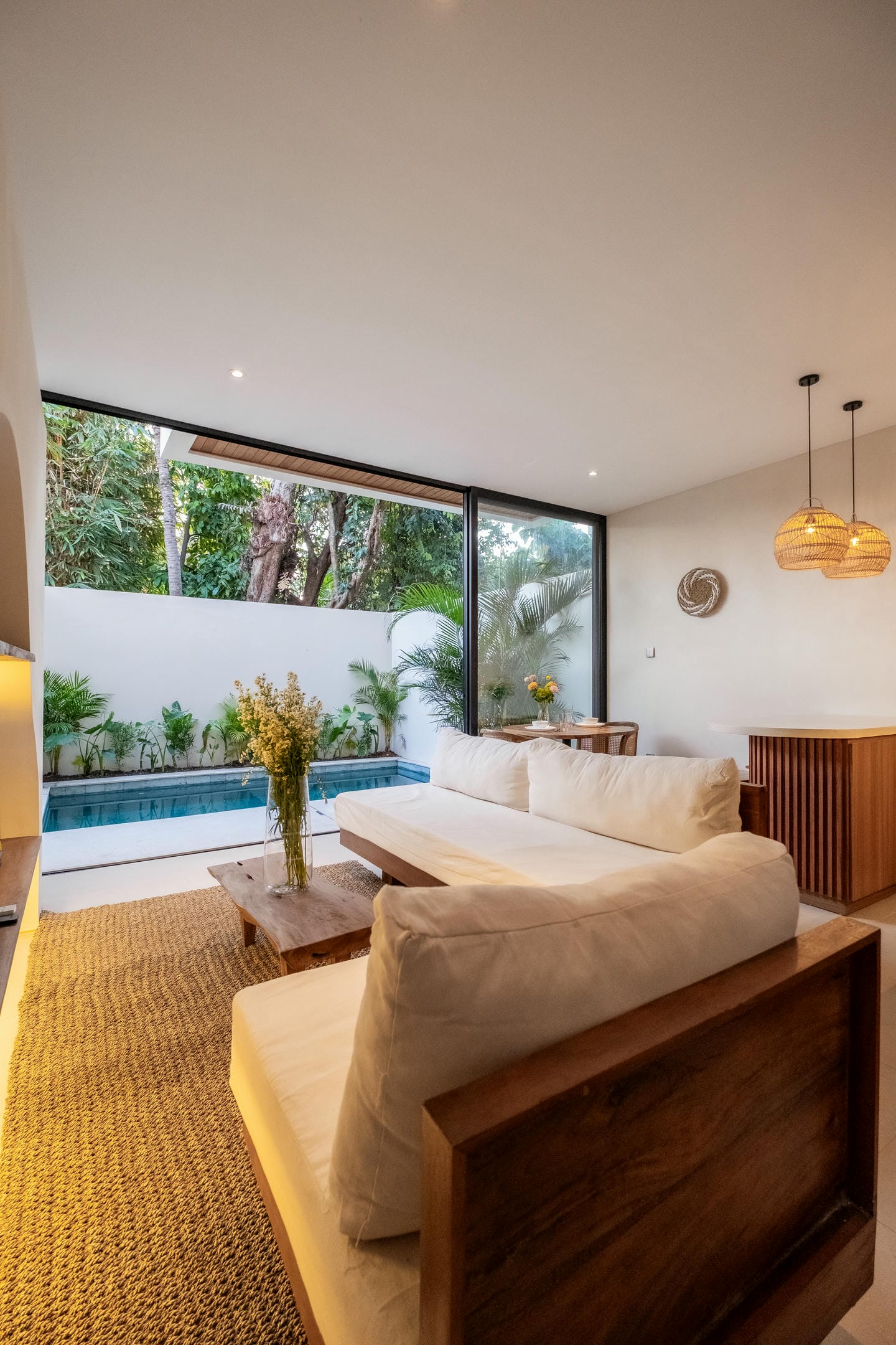 Cette villa minimaliste arbore un style intérieur en bois et dispose d’une cuisine ainsi que d’un salon confortable avec de grandes fenêtres laissant entrer une abondante lumière naturelle. Elle comprend une luxueuse suite d’une chambre. La villa est disponible en version entièrement meublée ou non meublée.