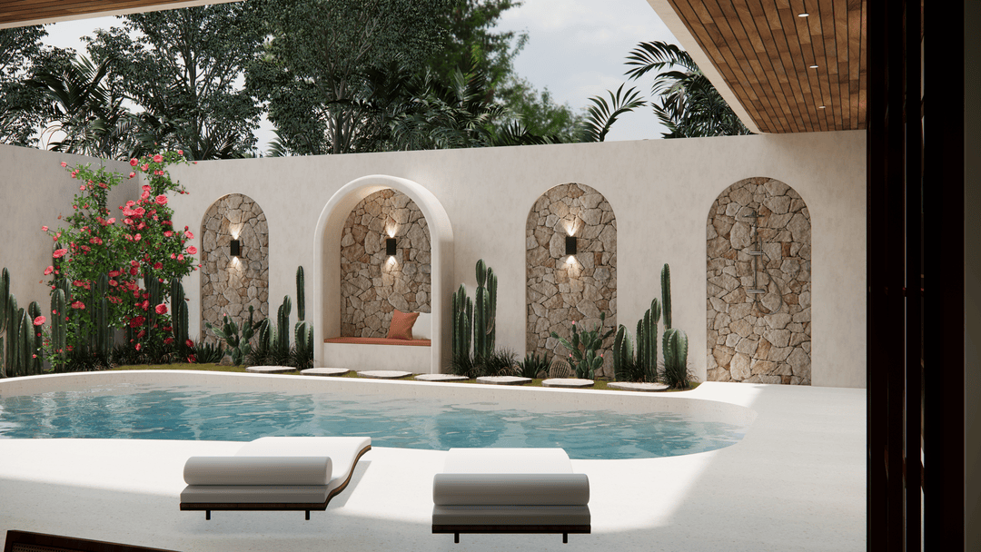 À l’extérieur, profitez d’une piscine privée avec un espace lounge, des chaises longues et une douche extérieure — l’endroit parfait pour savourer pleinement le style de vie de Berawa.