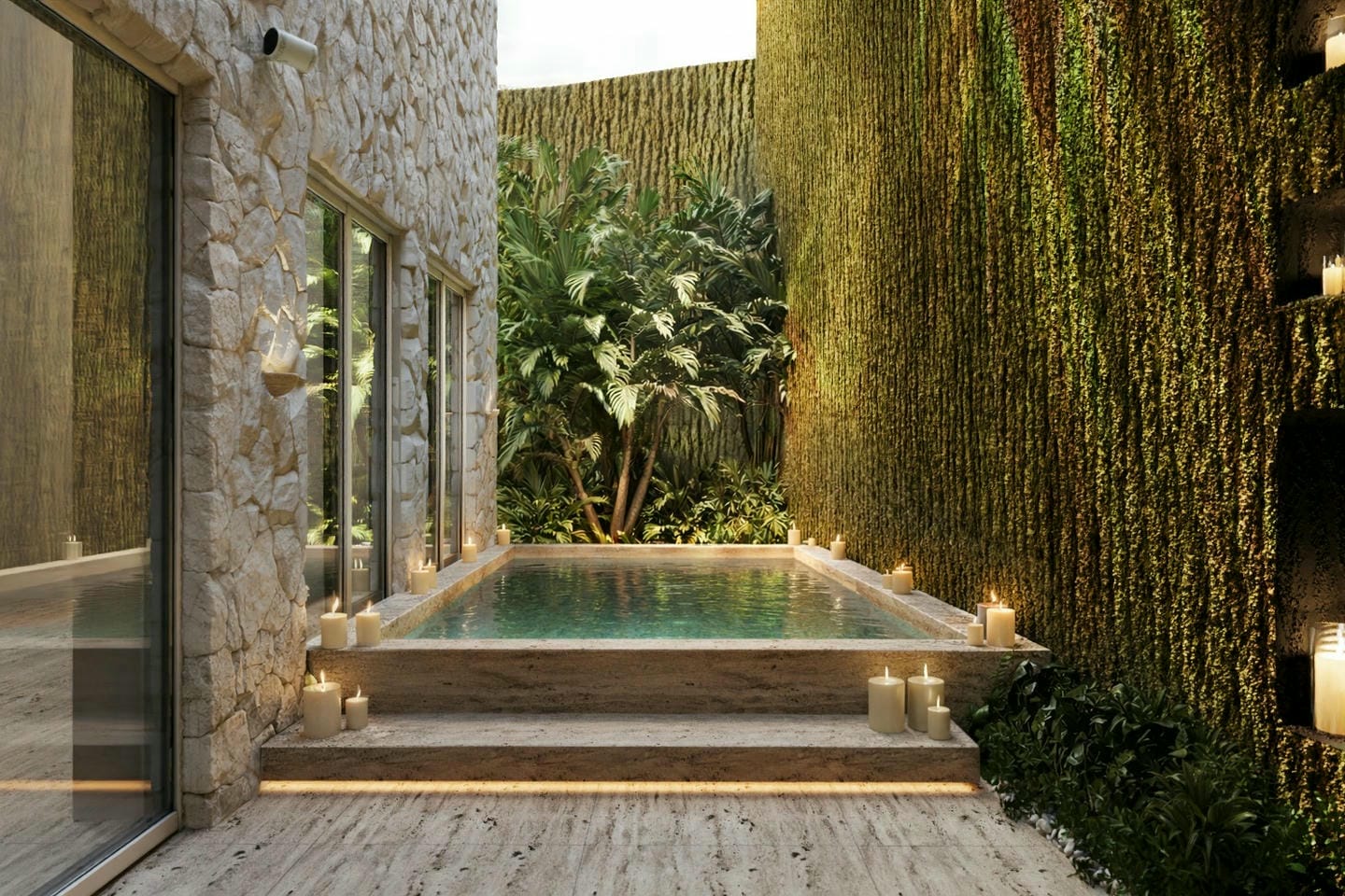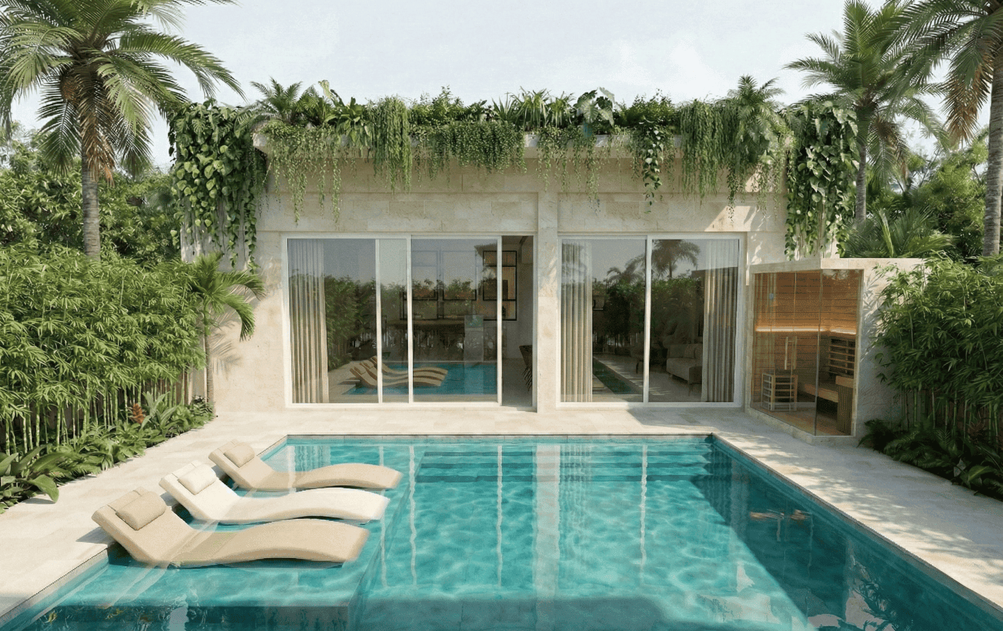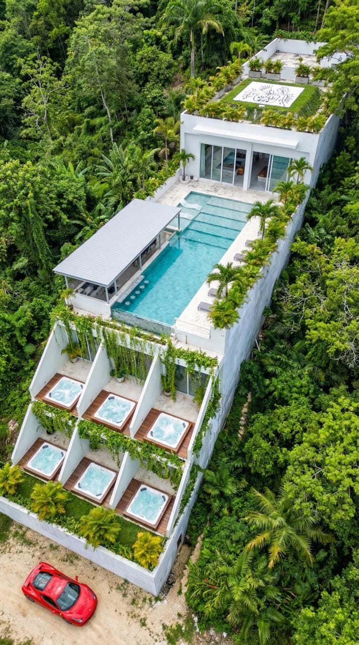 Les installations extérieures offrent une ambiance de type resort avec une longue piscine, des transats et des espaces lounge relaxants. Les résidents peuvent également profiter d’un jacuzzi privé et de magnifiques vues sur l’océan, créant un environnement paisible et exclusif, idéal pour se détendre ou socialiser.