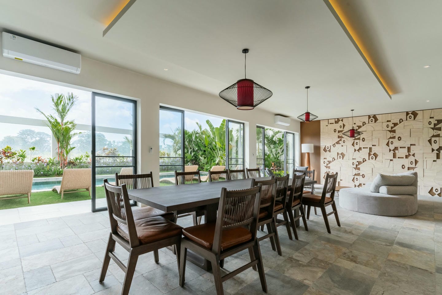 L’extérieur est tout aussi impressionnant, avec une superbe piscine offrant une vue panoramique sur les rizières environnantes. L’espace extérieur généreux est idéal pour profiter du climat tropical balinais, que ce soit pour des matinées paisibles ou des rassemblements animés entre amis ou en famille.