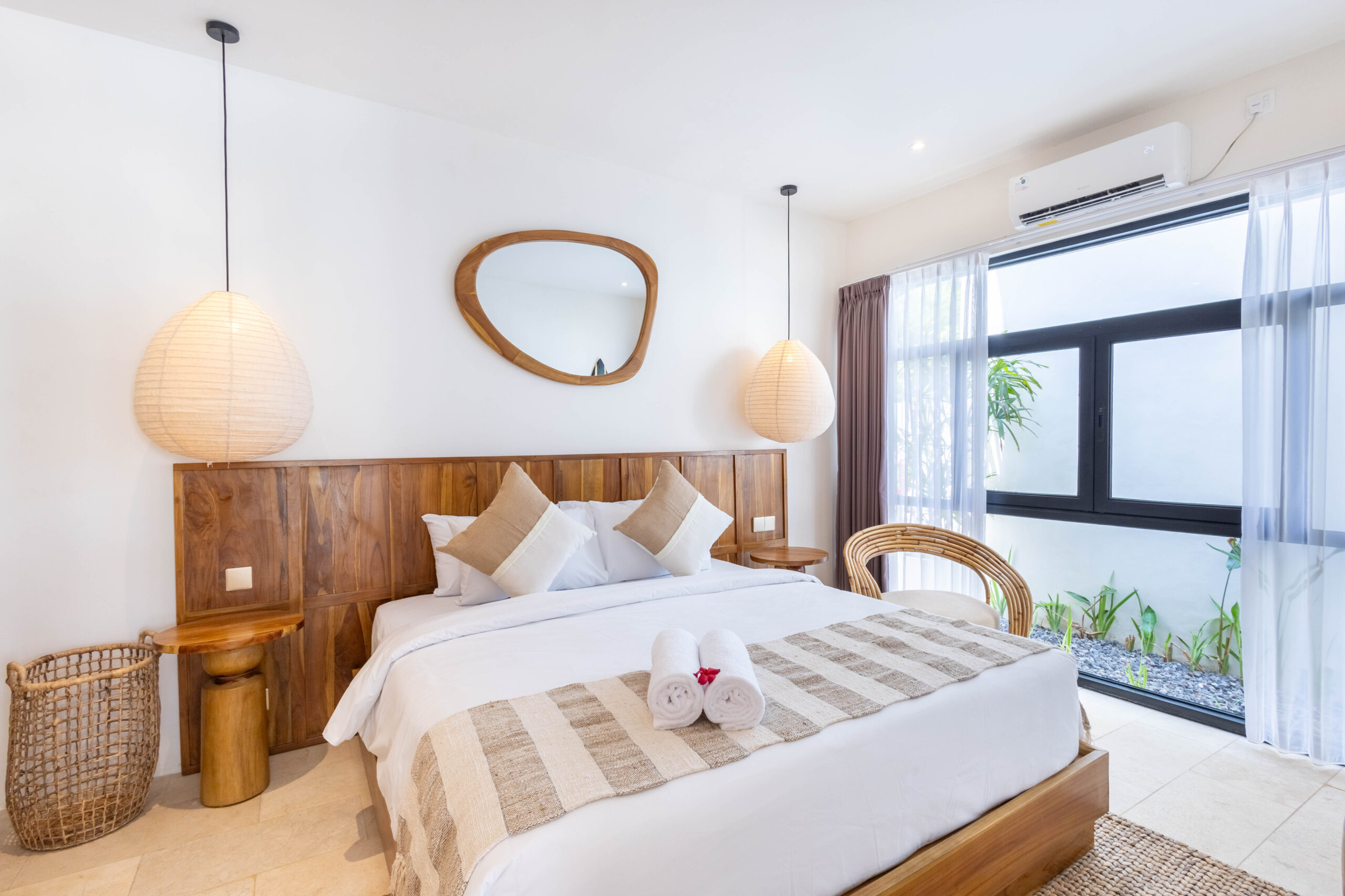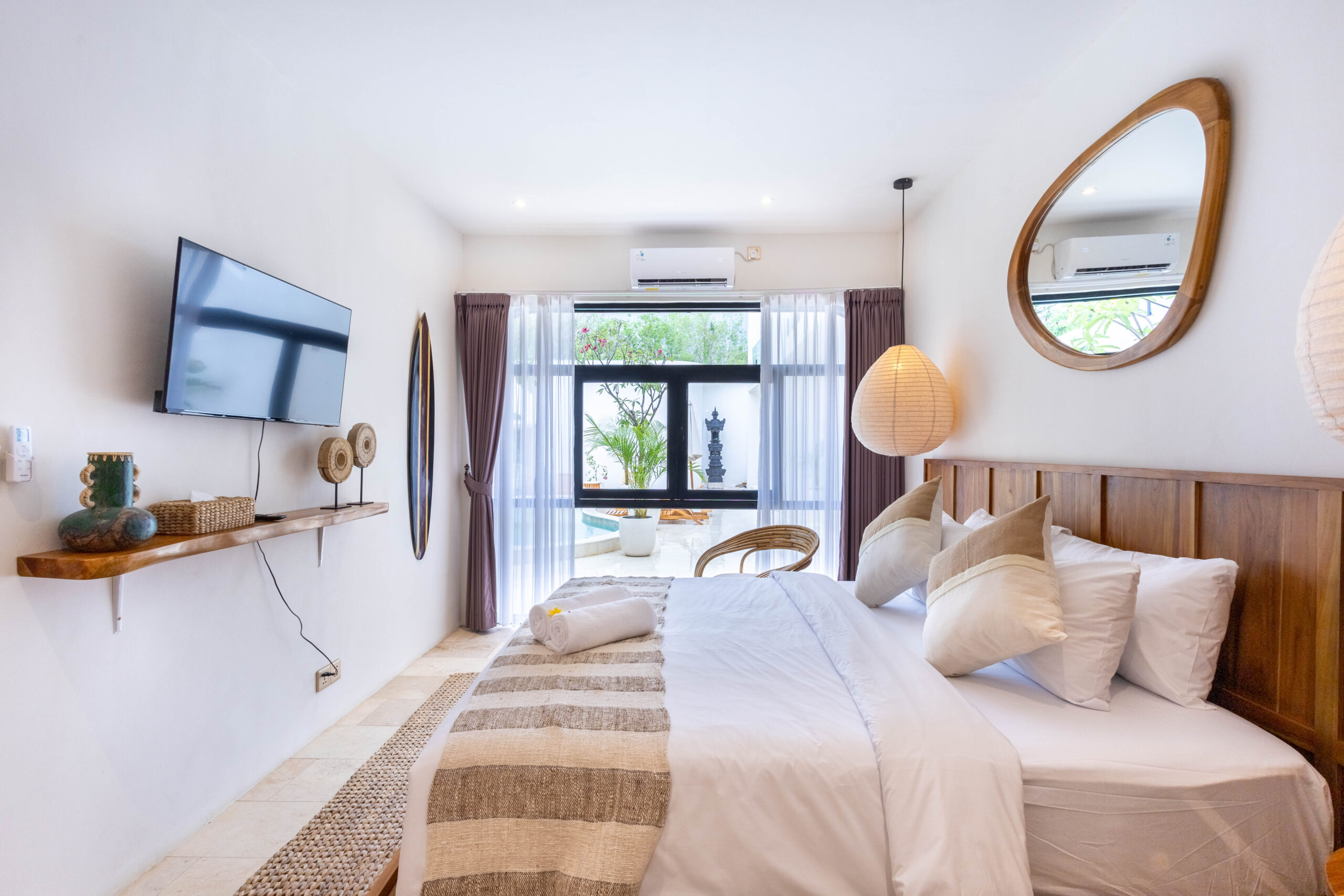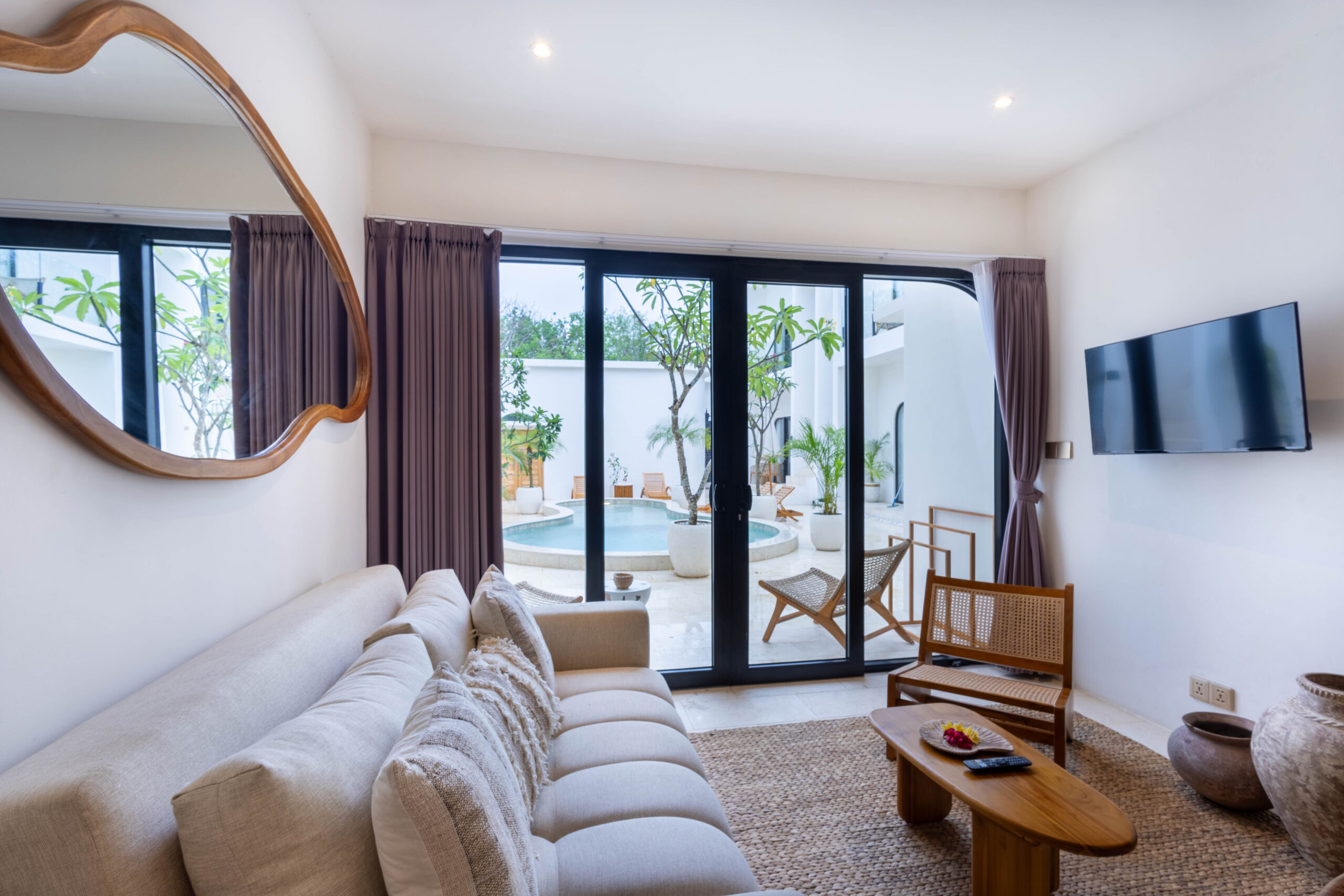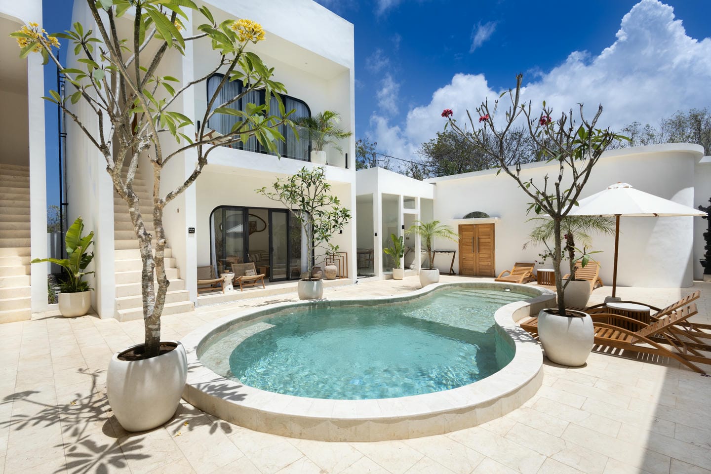 À l'extérieur, la villa présente une charmante piscine privée entourée d'une verdure luxuriante et d'une élégante architecture blanche. L'aménagement de style cour offre une vue paisible sur le jardin, rehaussée par des plantes tropicales et la lumière naturelle du soleil, créant une ambiance sereine et rafraîchissante.