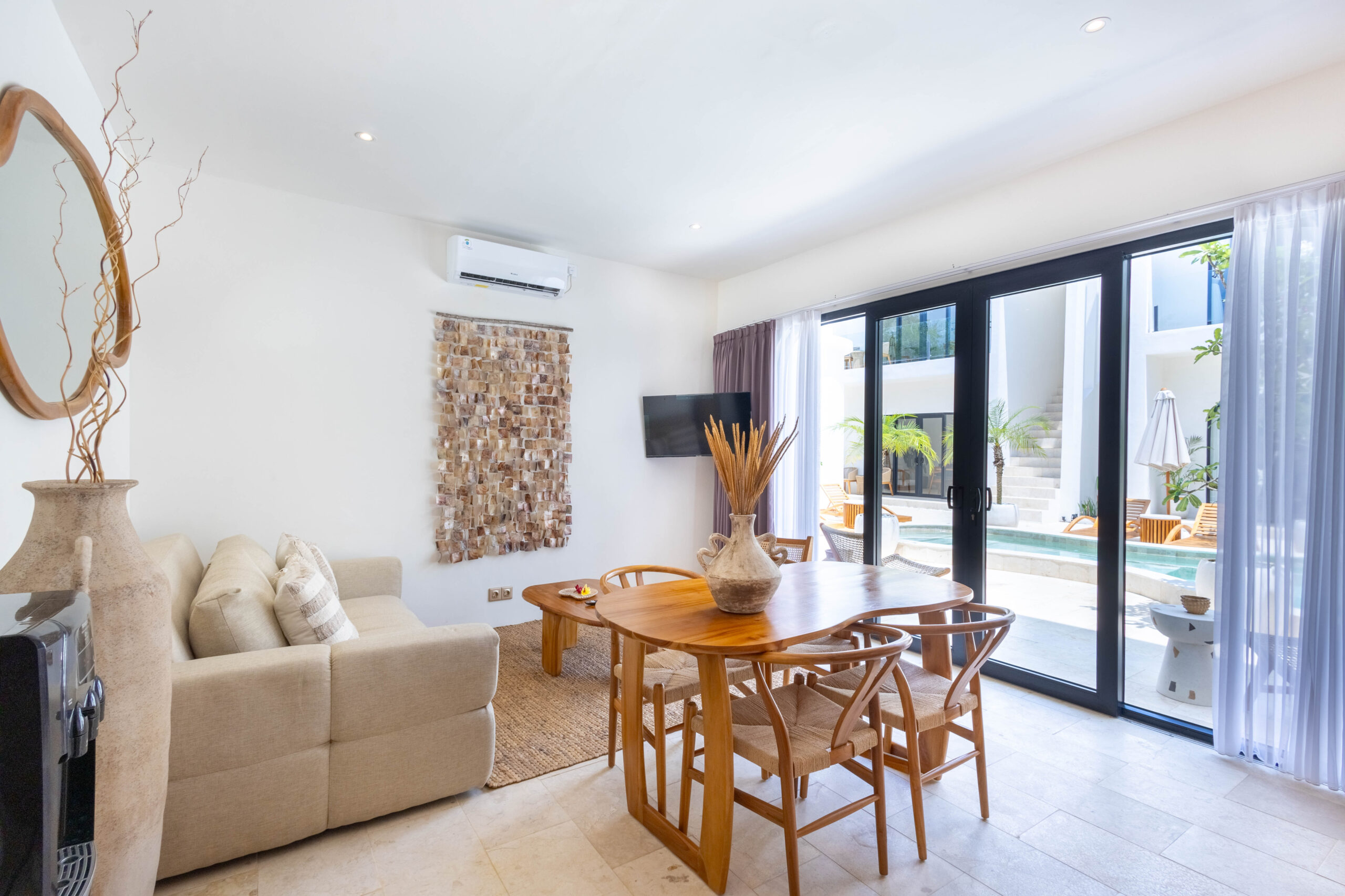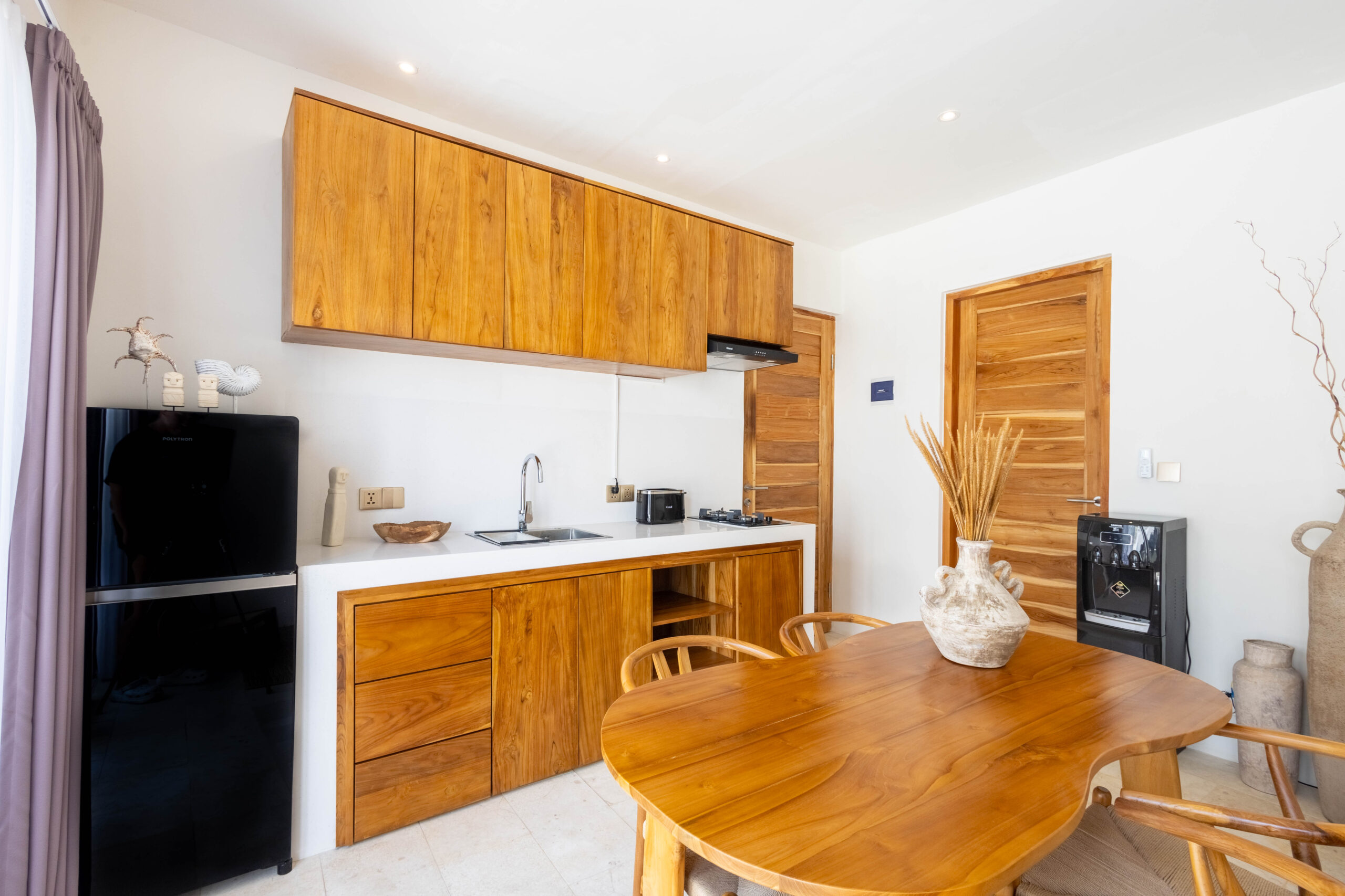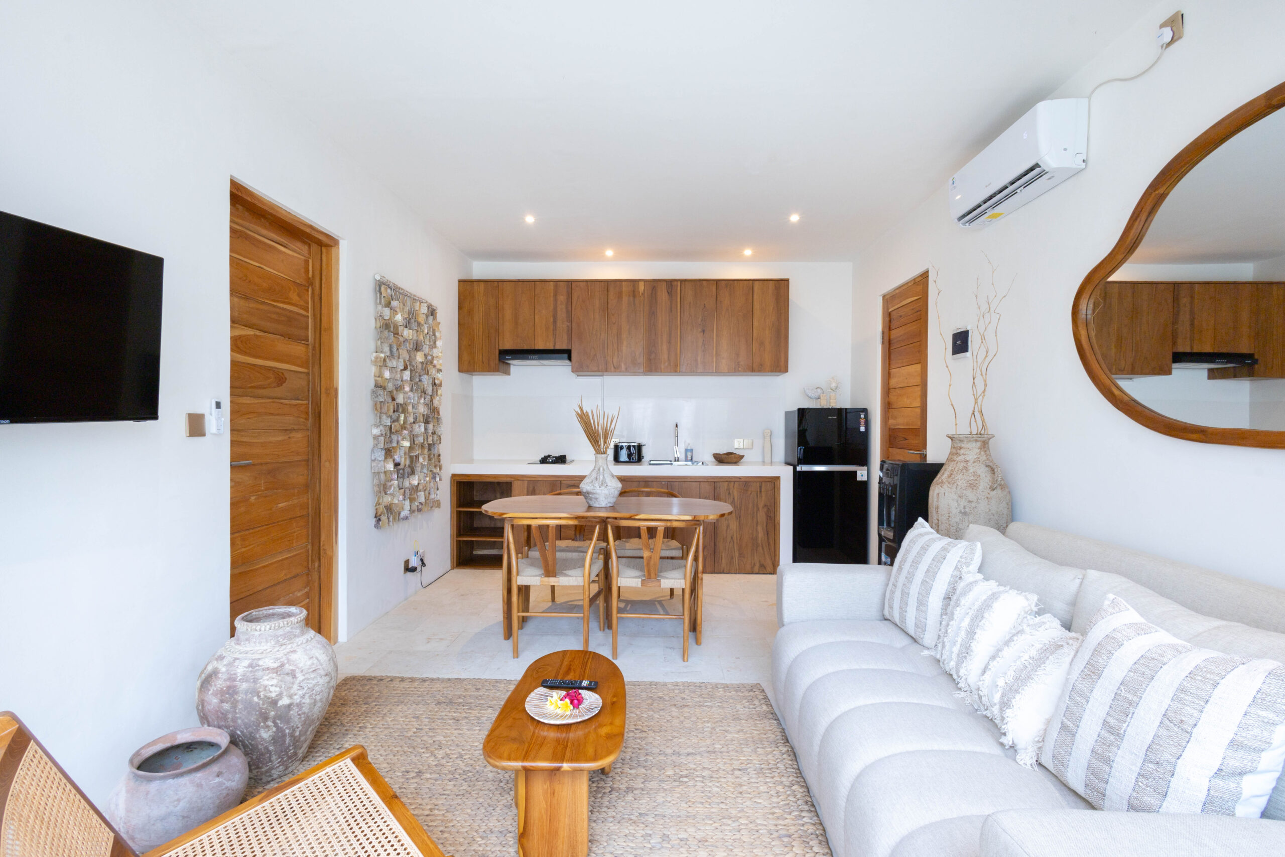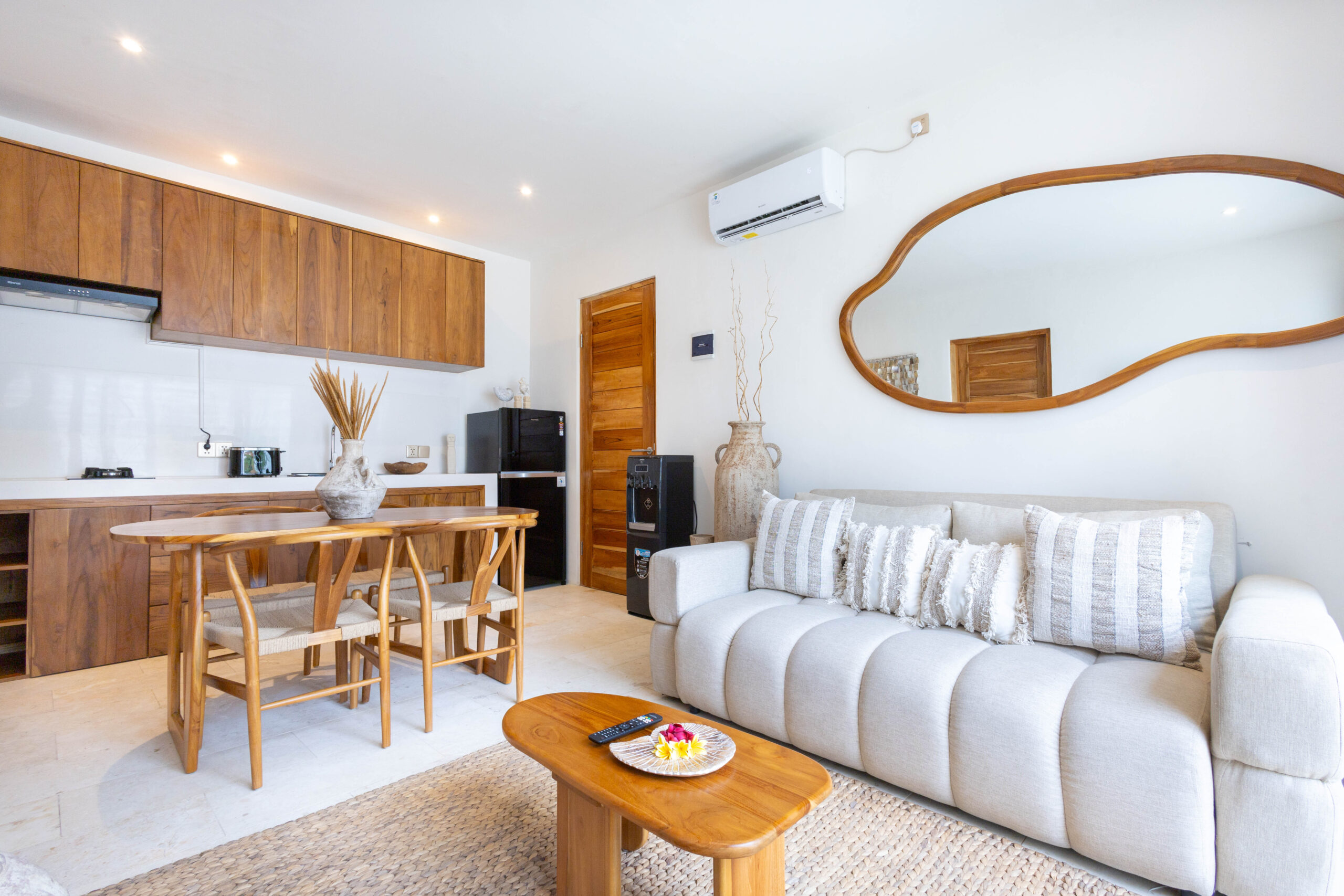 L'intérieur présente un style tropical chaleureux et minimaliste, combinant des éléments en bois naturel avec des tons neutres doux. L'espace est lumineux et aéré, avec des lignes épurées, un mobilier confortable et un aménagement ouvert fonctionnel qui crée une atmosphère confortable et relaxante.