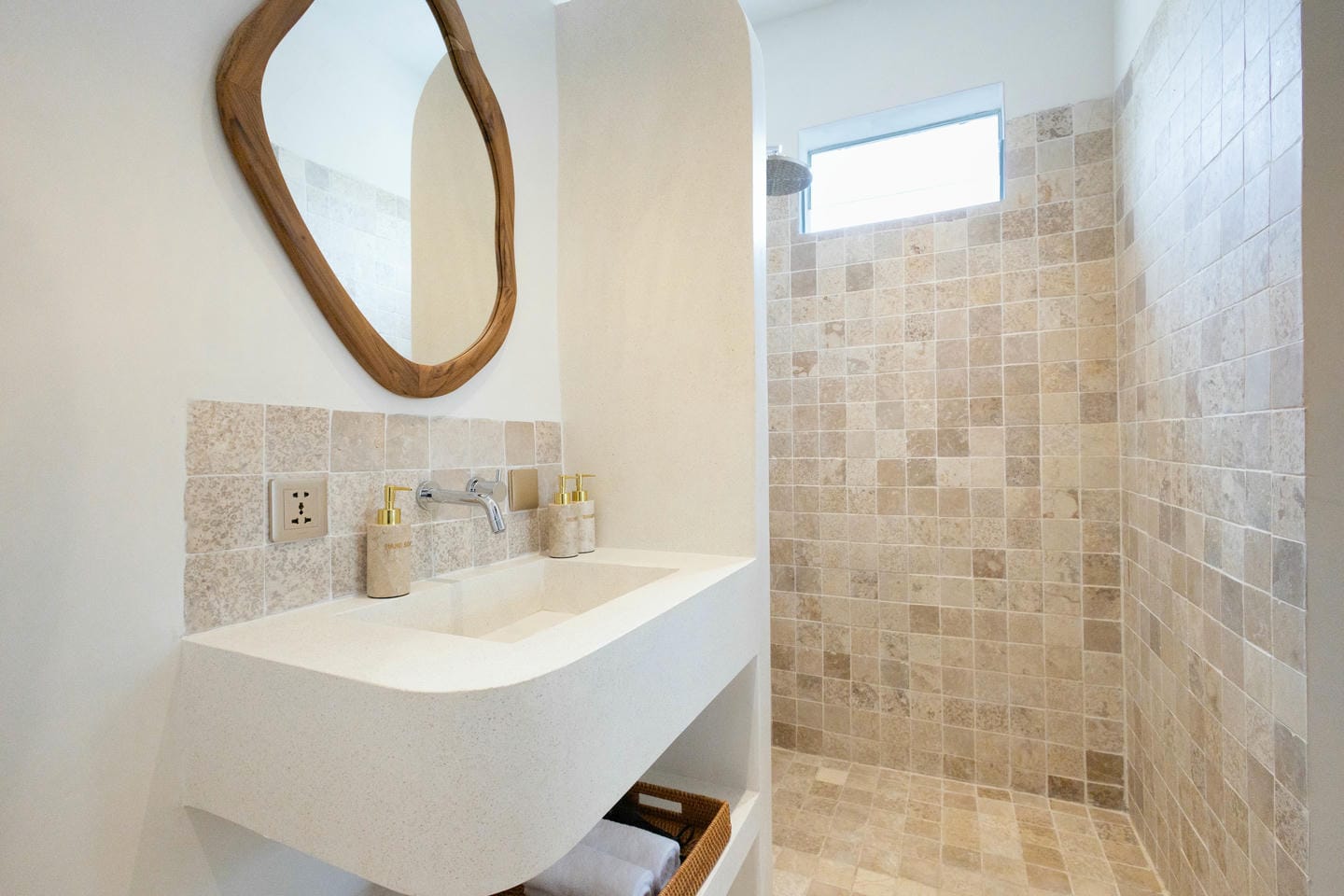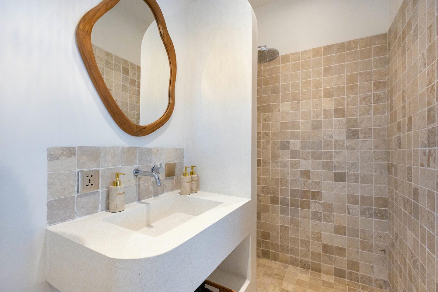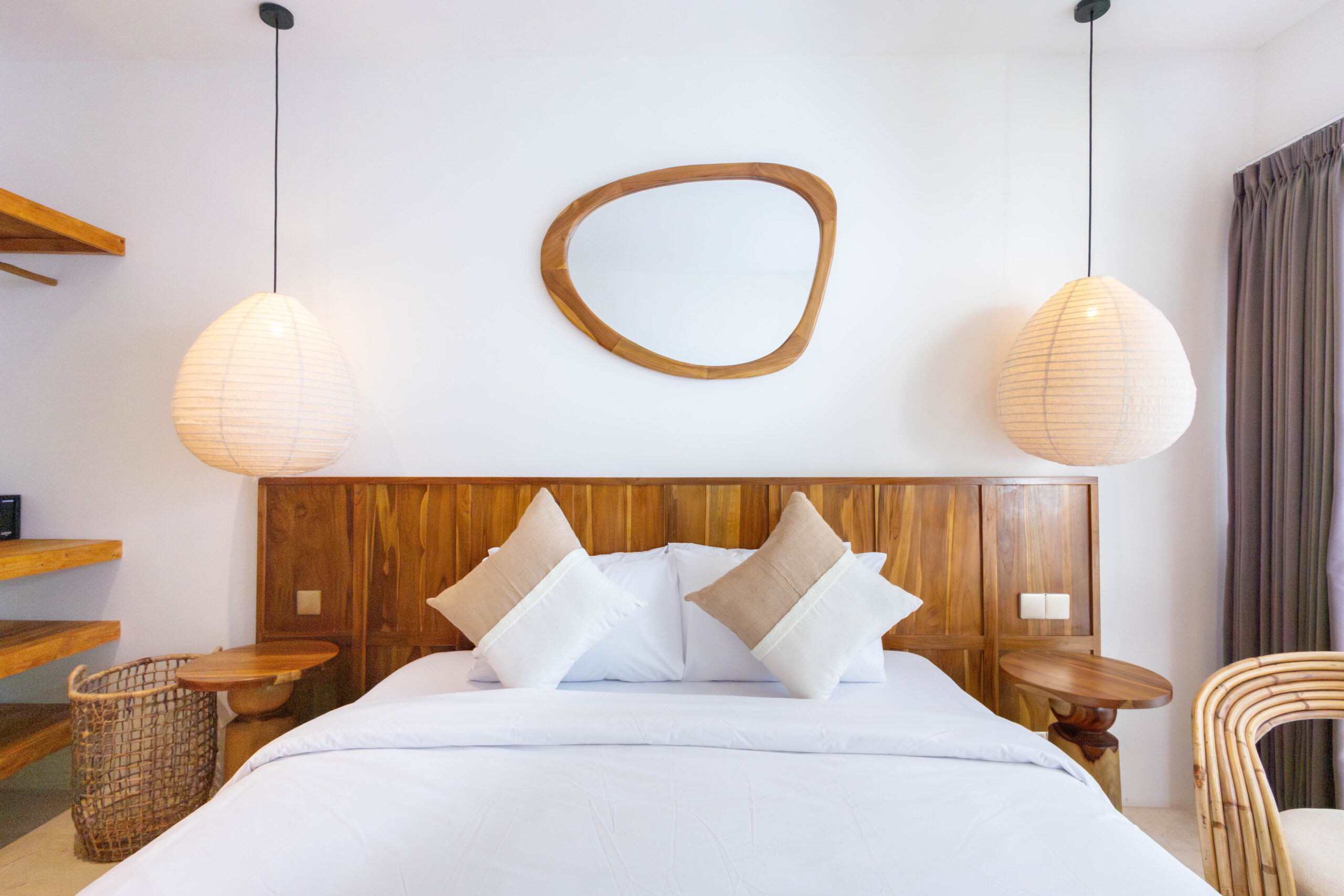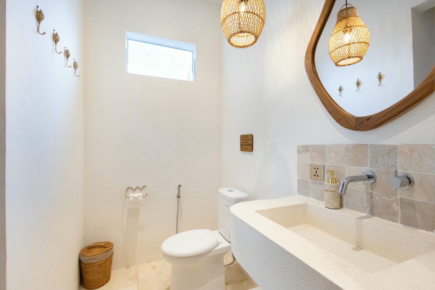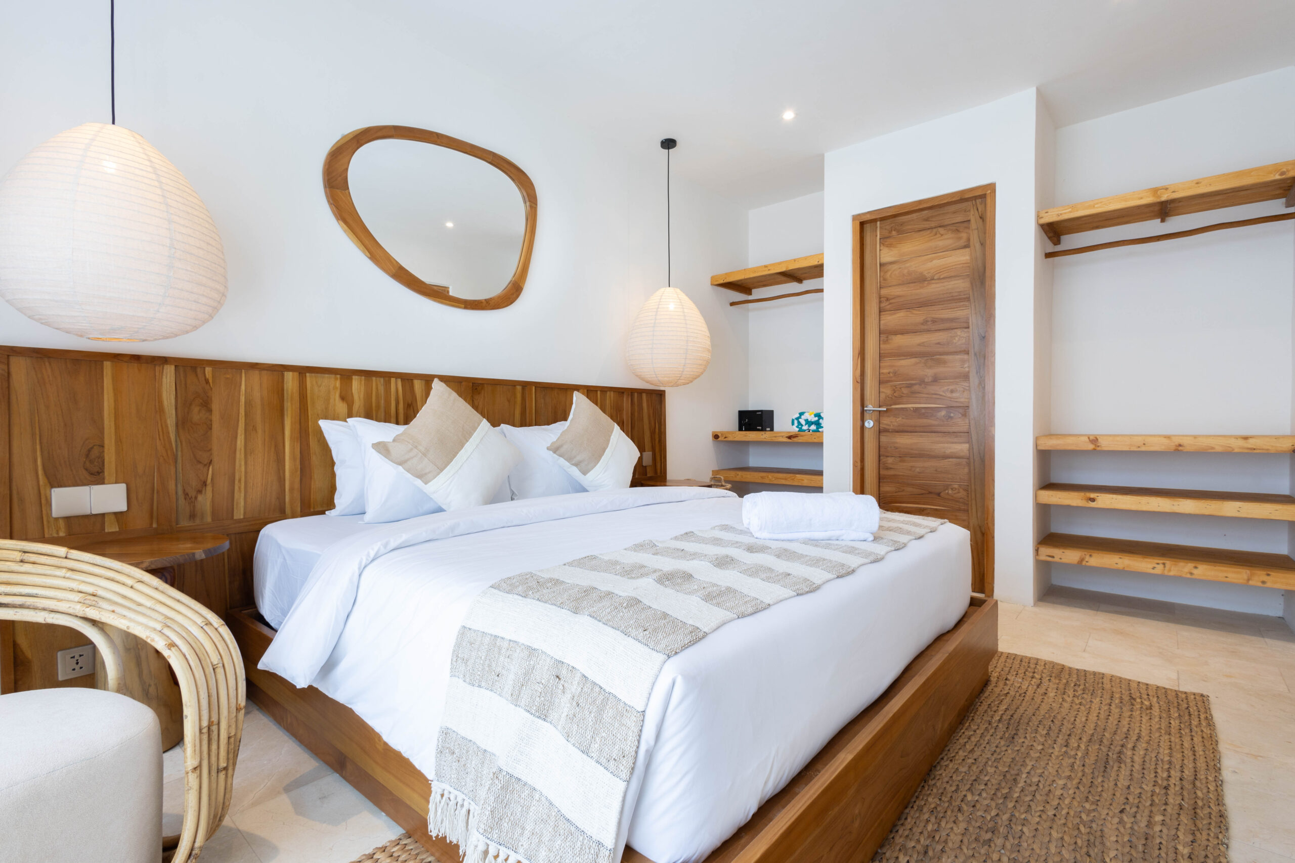 L'intérieur présente un style tropical chaleureux et minimaliste, combinant des éléments en bois naturel avec des tons neutres doux. L'espace est lumineux et aéré, avec des lignes épurées, un mobilier confortable et un aménagement ouvert fonctionnel qui crée une atmosphère confortable et relaxante.