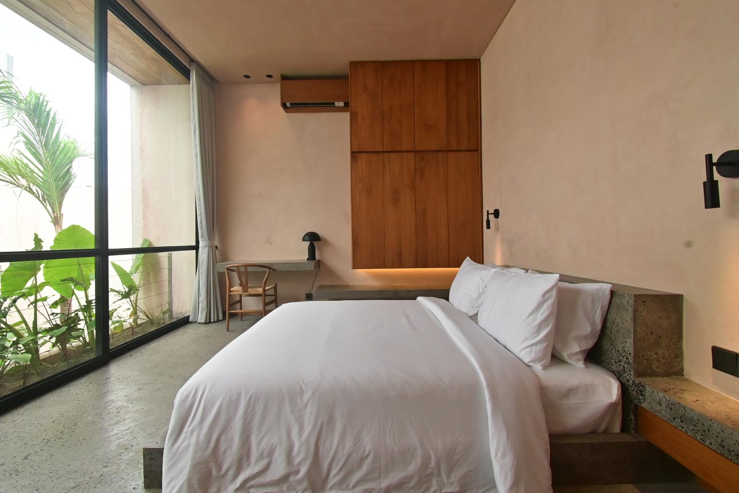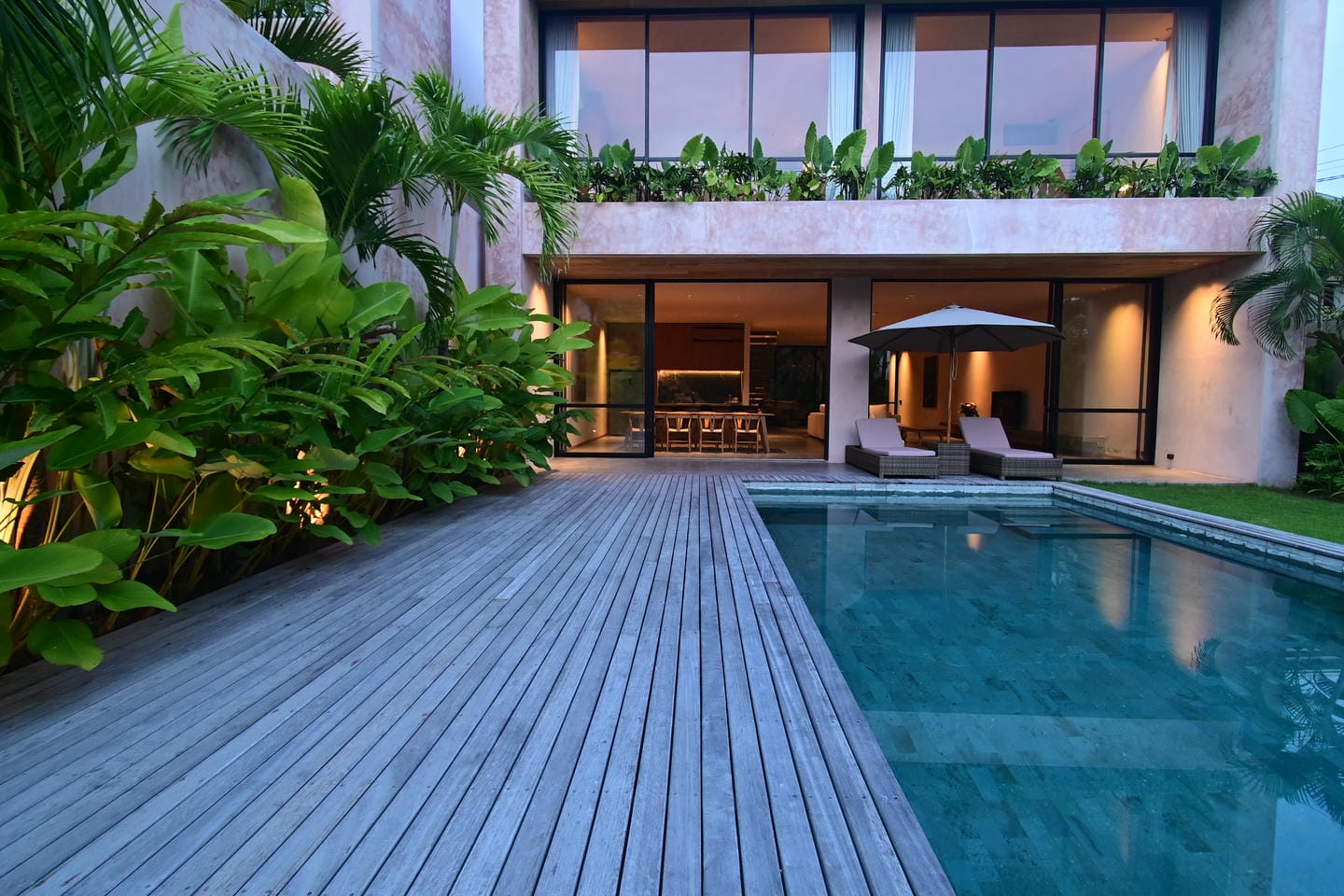 L'espace extérieur met en valeur une piscine privée entourée d'une verdure tropicale luxuriante, créant un espace serein pour se détendre et se relaxer. Une terrasse en bois avec chaises longues et jardin paysager rehausse l’ambiance tropicale, offrant un cadre idéal pour profiter du climat ensoleillé et du cadre paisible de Bali.
