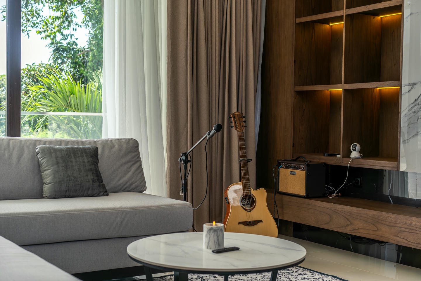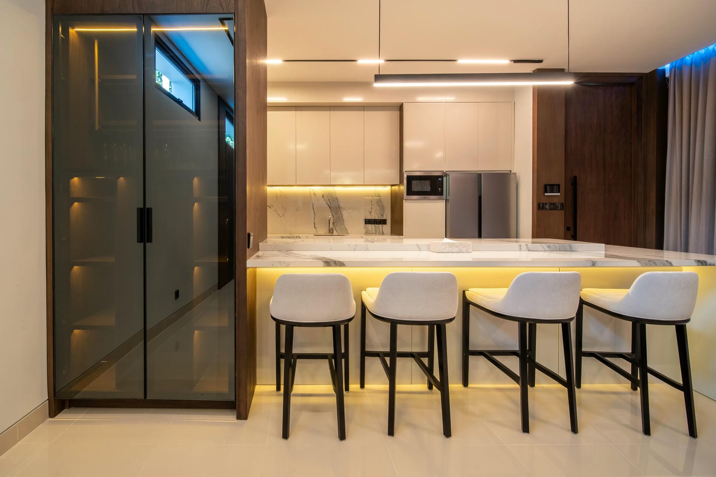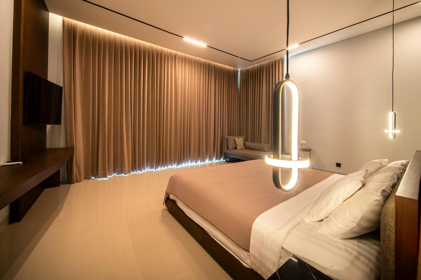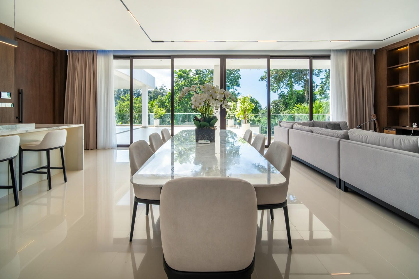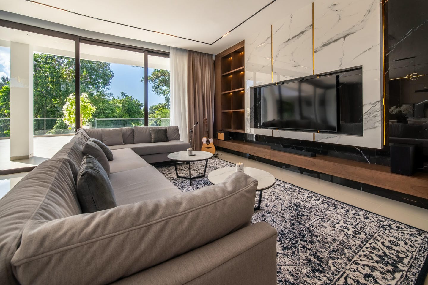 La villa présente une conception sur deux étages avec 4 chambres spacieuses, présentant un style contemporain moderne. L'intérieur est élégant et lumineux, mis en valeur par de grandes fenêtres vitrées qui permettent à la lumière naturelle de circuler dans tous les espaces de vie. Le salon dispose d'un élégant mur de télévision en marbre, de sièges confortables et d'une esthétique épurée et minimaliste qui se marie parfaitement avec des accents de bois chaleureux et des finitions de haute qualité.