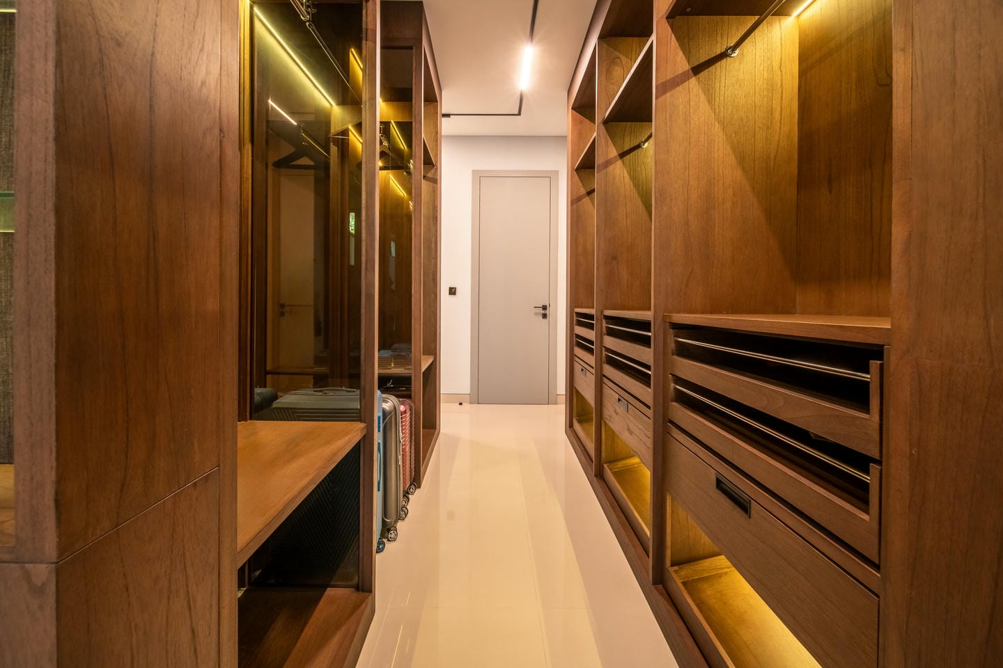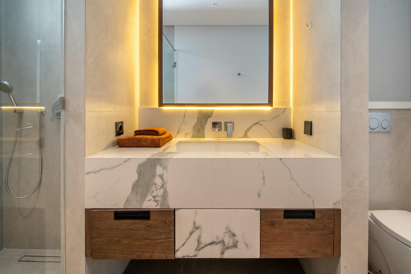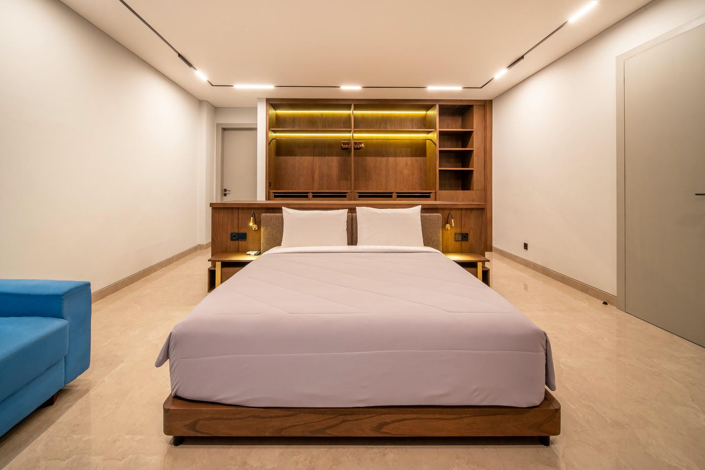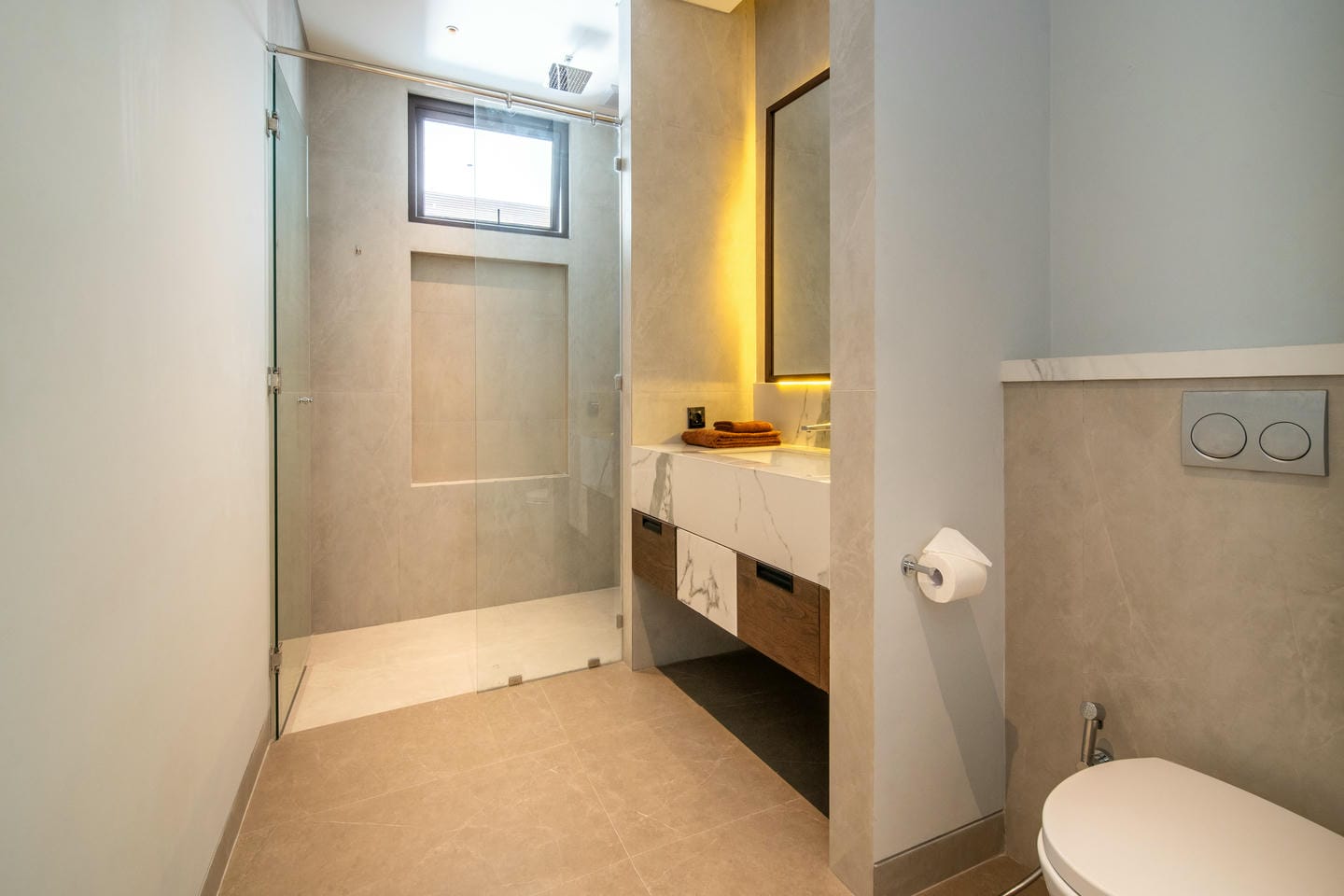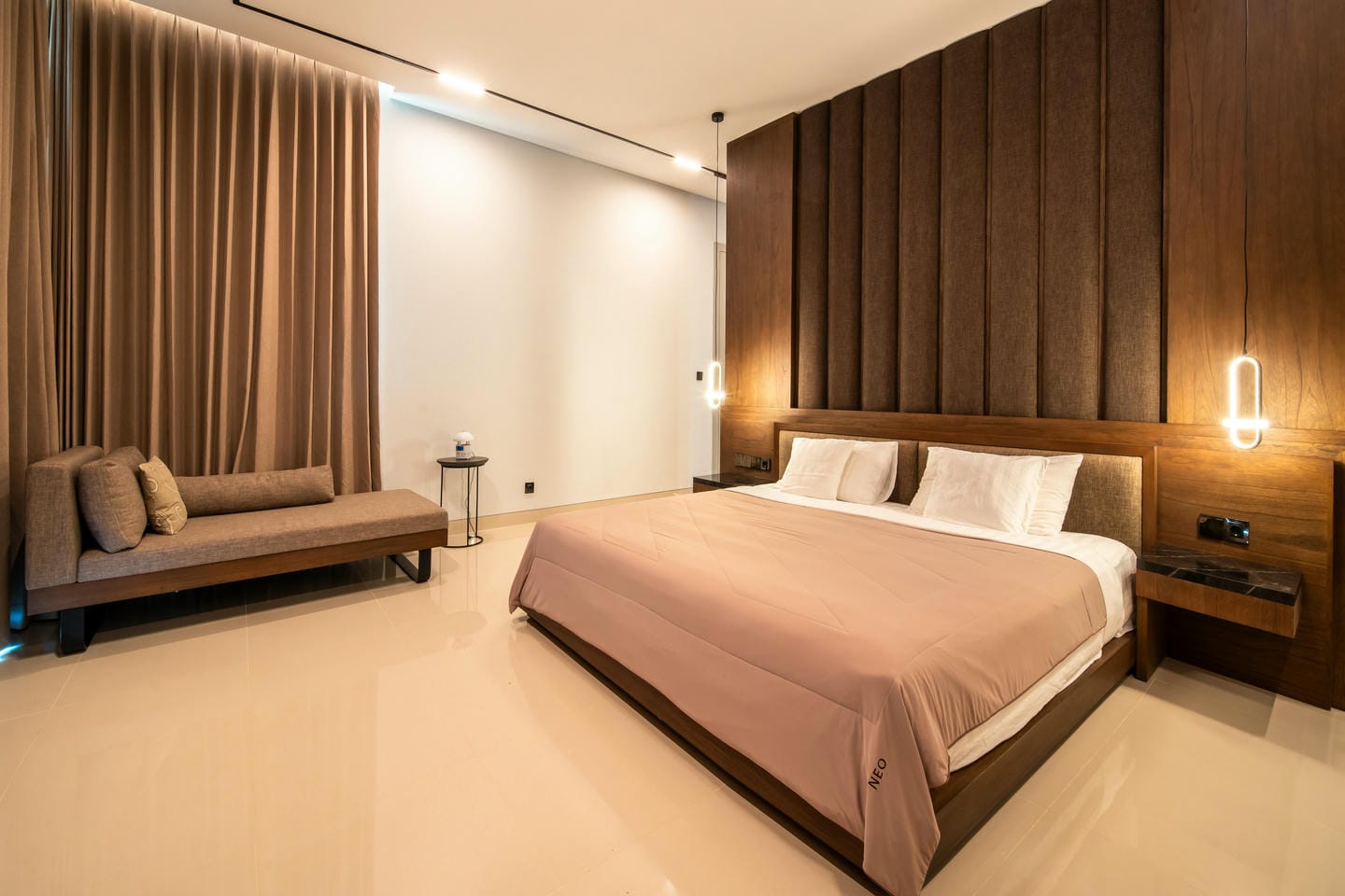 La villa présente une conception sur deux étages avec 4 chambres spacieuses, présentant un style contemporain moderne. L'intérieur est élégant et lumineux, mis en valeur par de grandes fenêtres vitrées qui permettent à la lumière naturelle de circuler dans tous les espaces de vie. Le salon dispose d'un élégant mur de télévision en marbre, de sièges confortables et d'une esthétique épurée et minimaliste qui se marie parfaitement avec des accents de bois chaleureux et des finitions de haute qualité.
