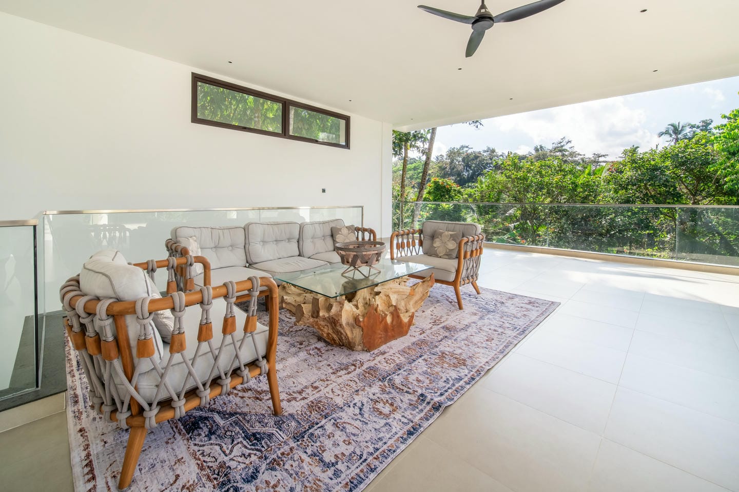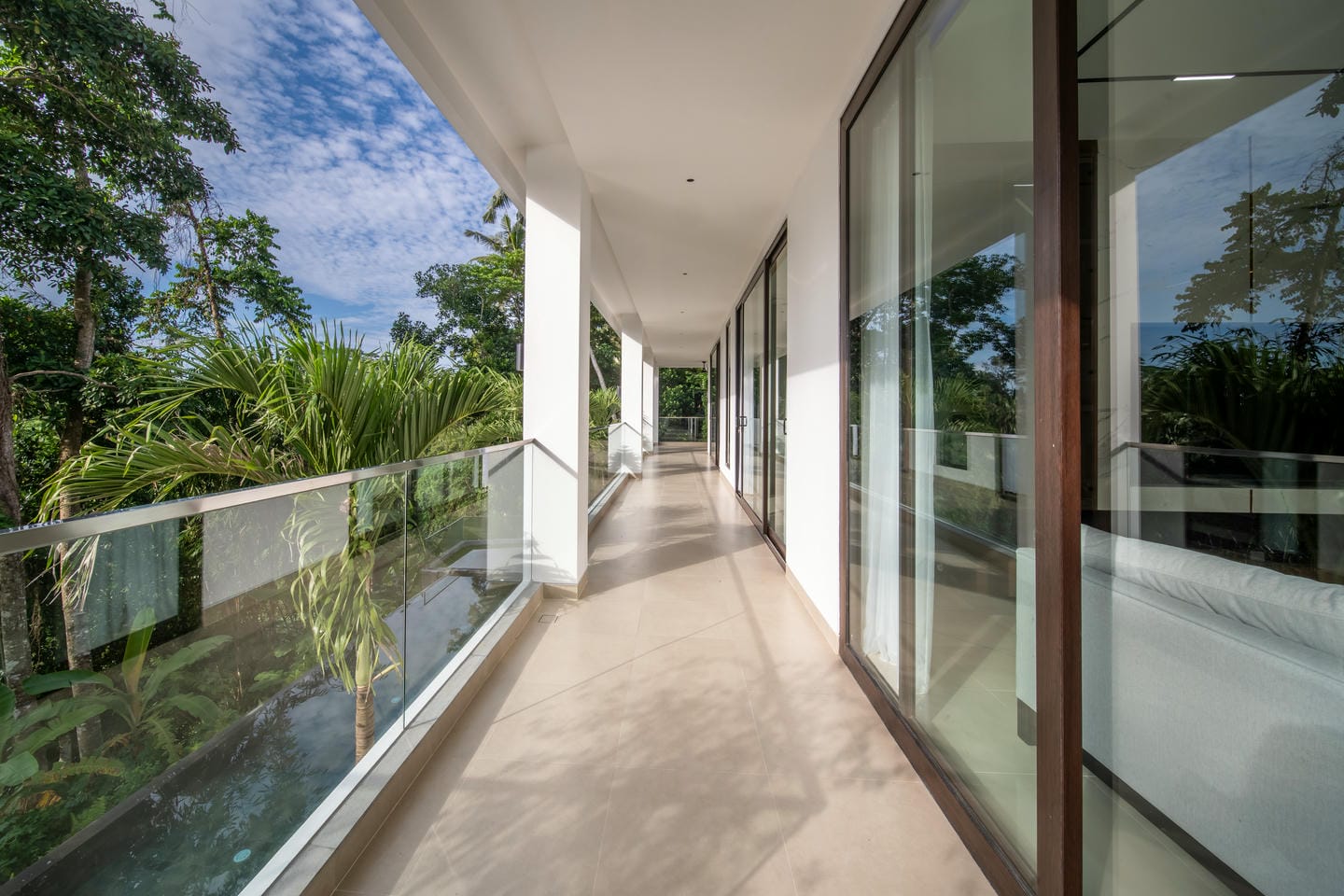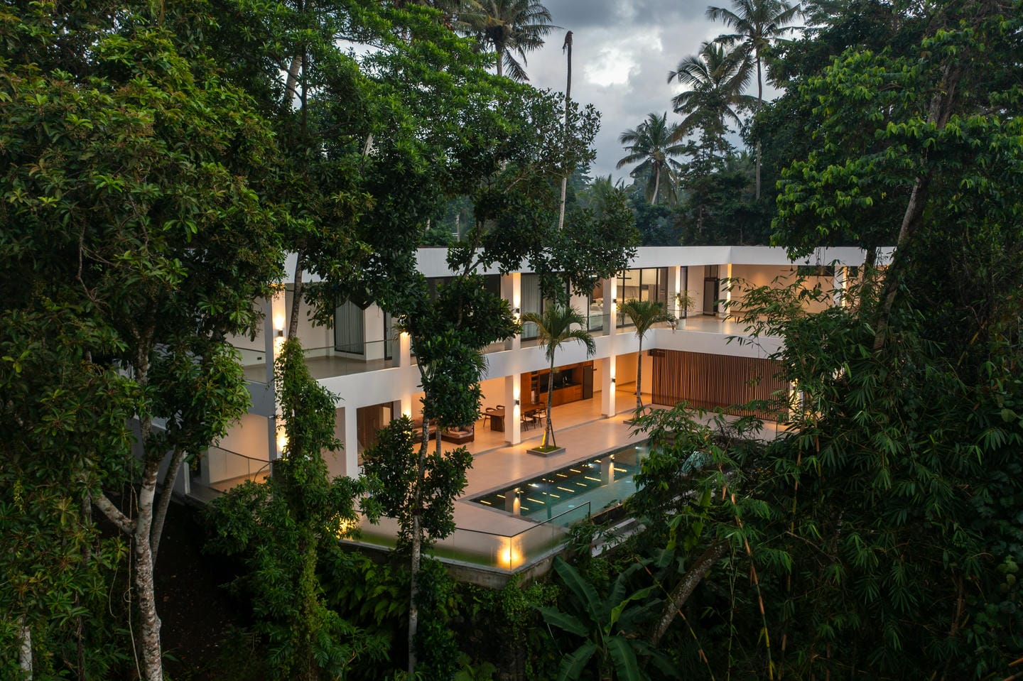 L'espace extérieur est conçu pour la détente et le divertissement avec des fonctionnalités telles qu'un sauna. Une grande piscine privée se trouve au centre de la propriété, entourée d'une terrasse ouverte et de verdure tropicale. La villa bénéficie d'une vue magnifique sur les arbres luxuriants et les environs tropicaux, créant une ambiance calme et privée qui ressemble à une retraite cachée dans la nature.