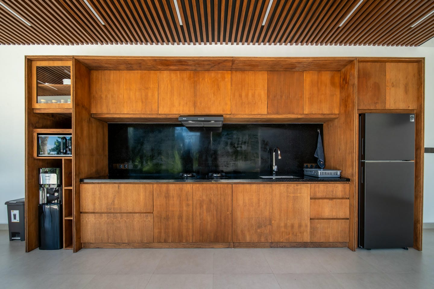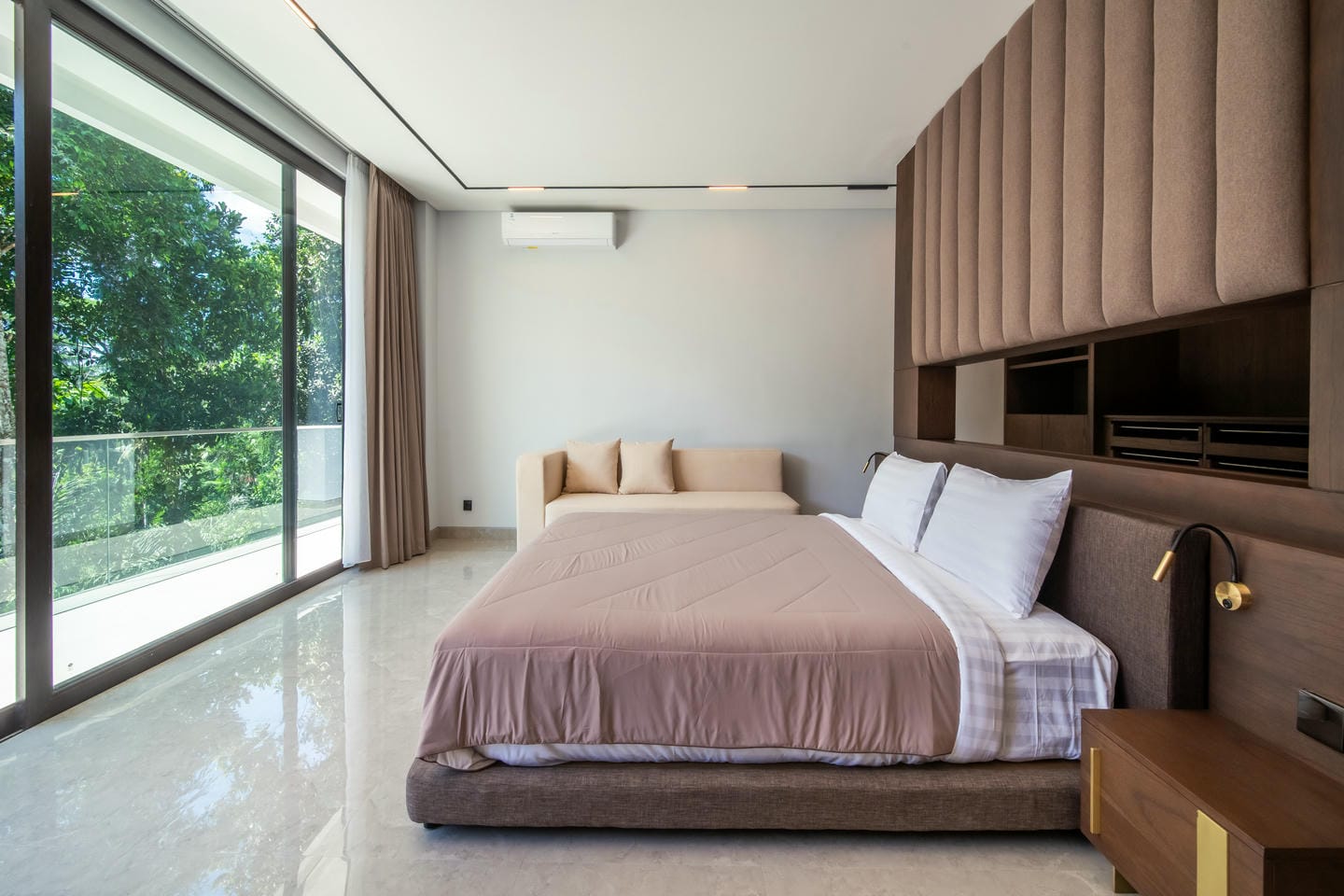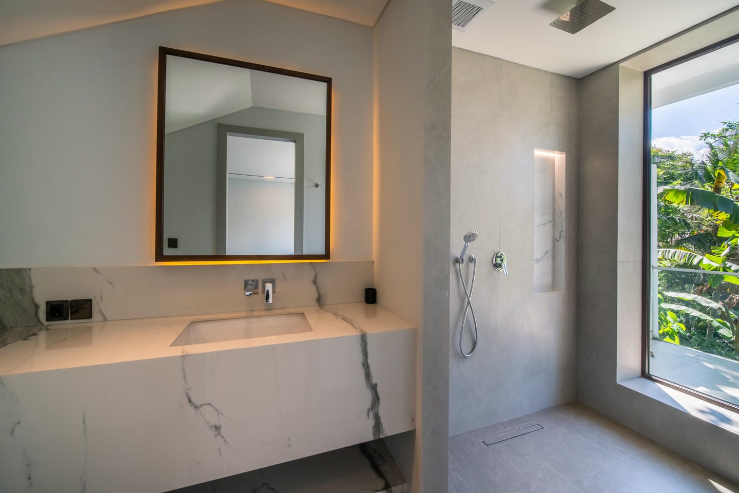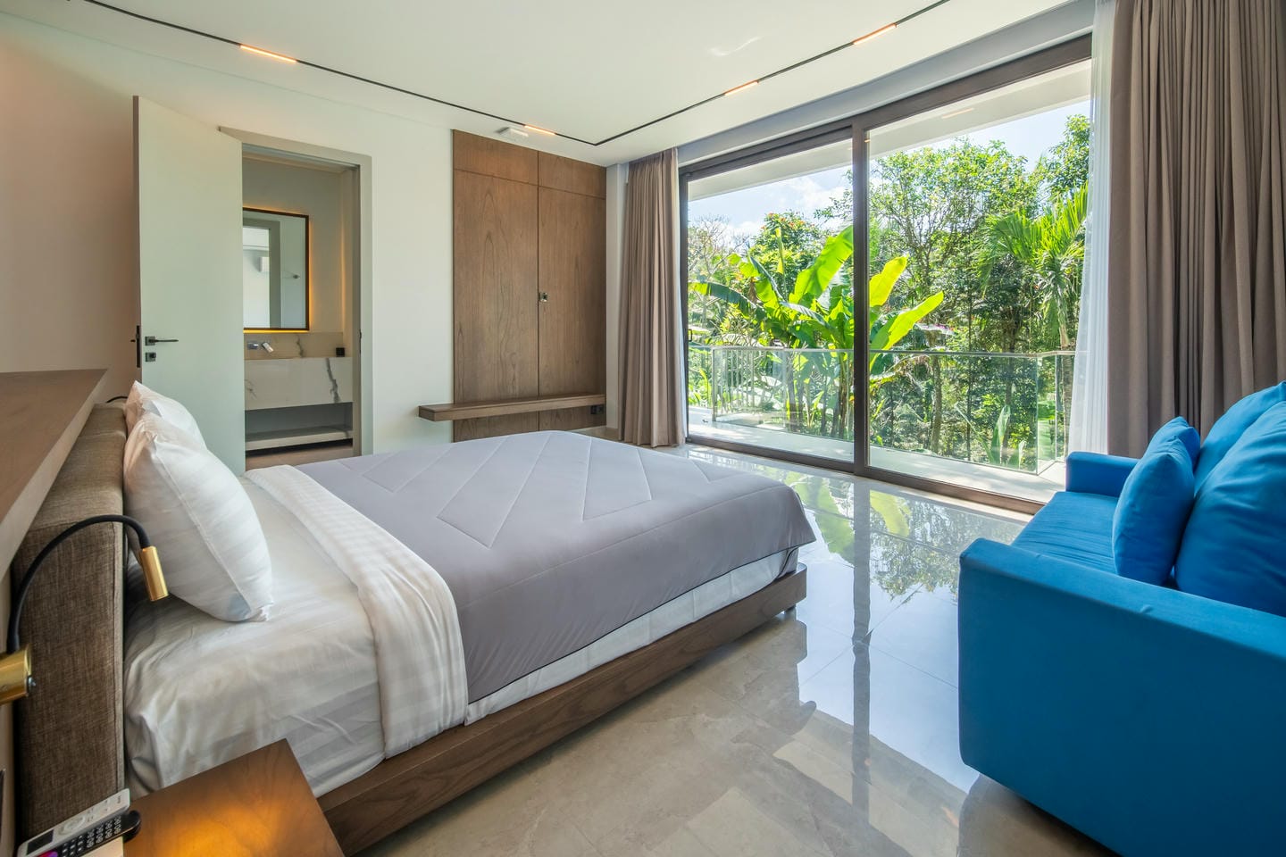 L'espace extérieur est conçu pour la détente et le divertissement avec des fonctionnalités telles qu'un sauna. Une grande piscine privée se trouve au centre de la propriété, entourée d'une terrasse ouverte et de verdure tropicale. La villa bénéficie d'une vue magnifique sur les arbres luxuriants et les environs tropicaux, créant une ambiance calme et privée qui ressemble à une retraite cachée dans la nature.