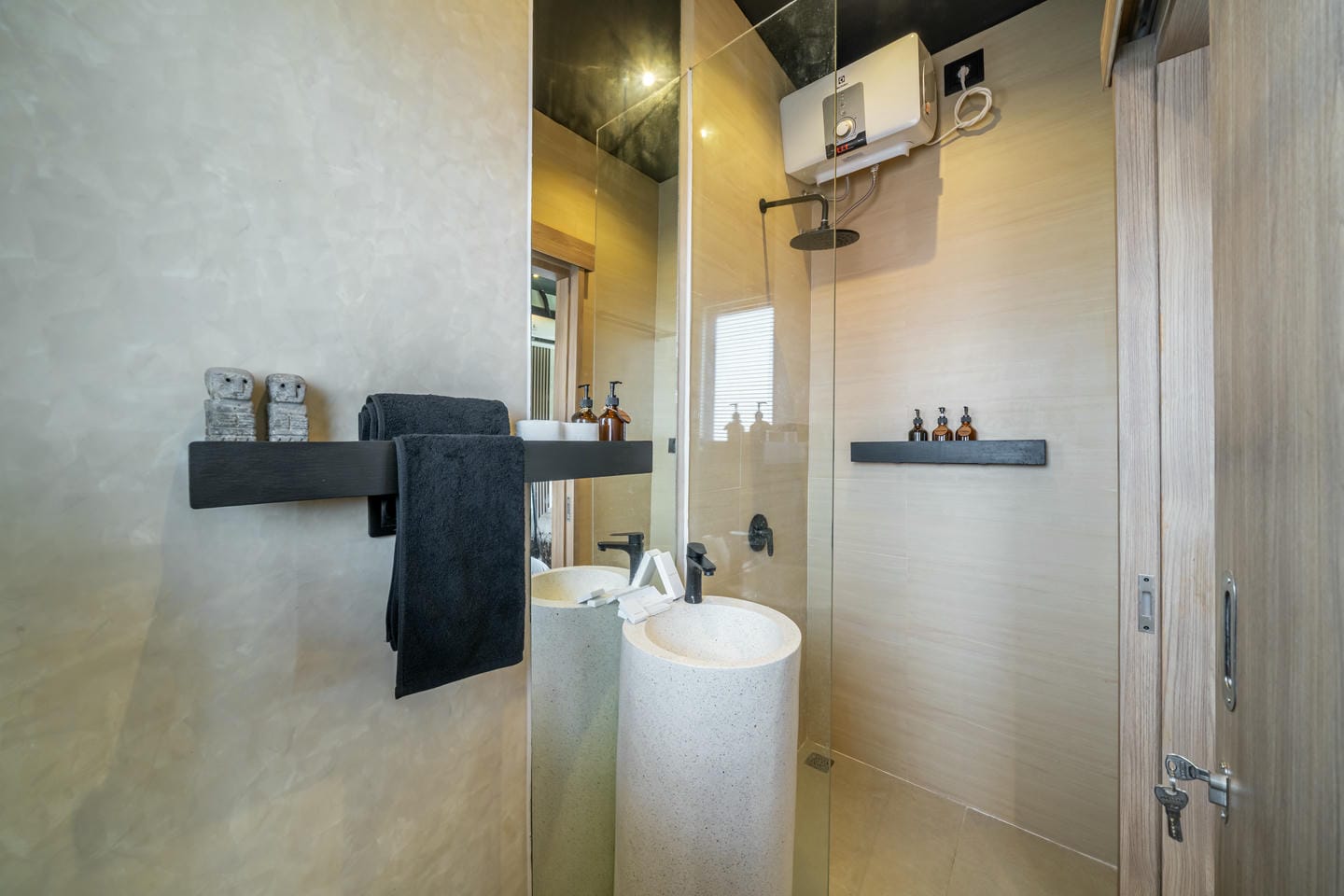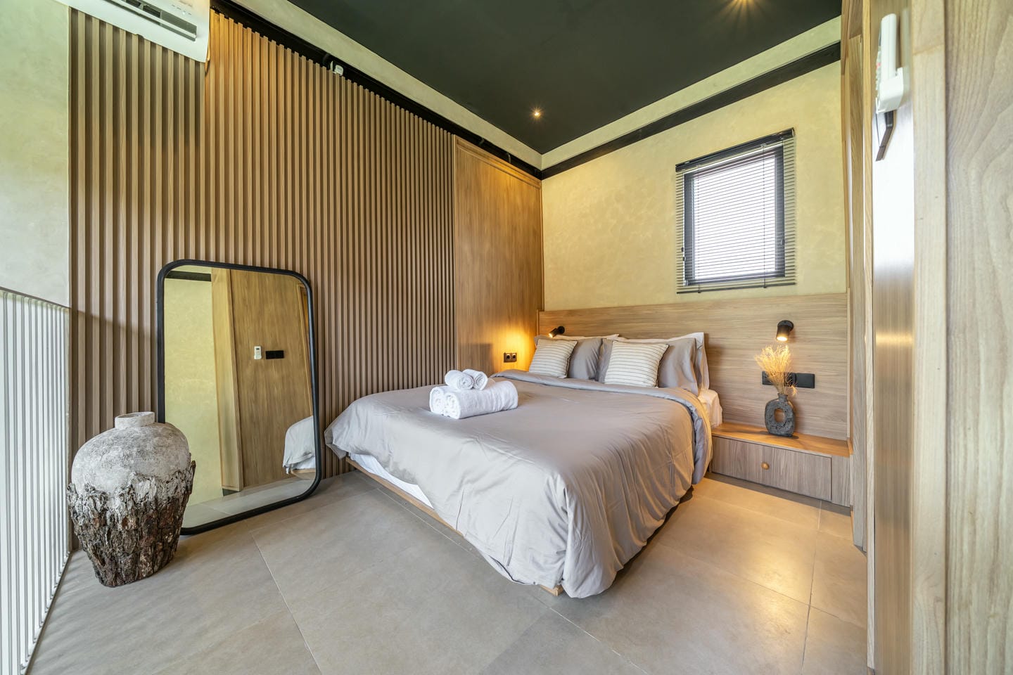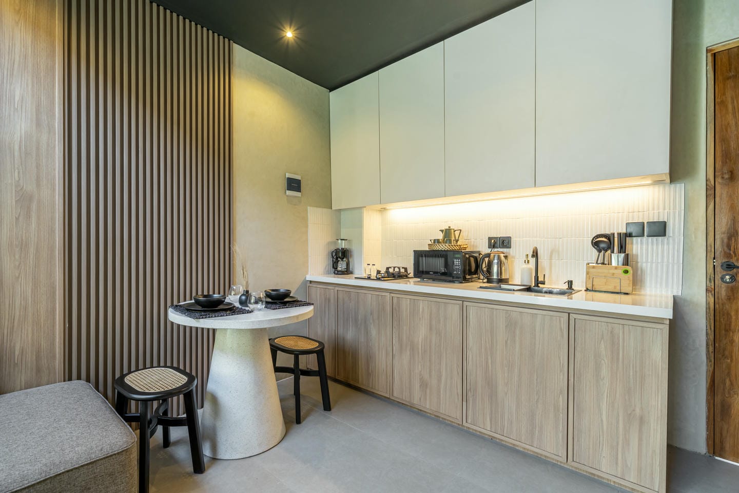 La villa comprend une chambre en mezzanine avec salle de bain attenante. L’espace de vie ouvert s’intègre harmonieusement à la salle à manger et à la cuisine entièrement équipée, créant un environnement spacieux et accueillant, idéal pour se détendre ou recevoir des invités.