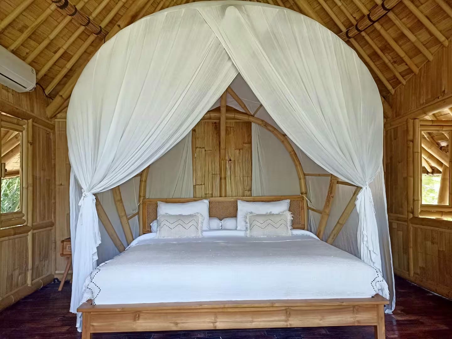 Entièrement meublé, l’intérieur dégage confort et élégance. Le spacieux salon s’intègre harmonieusement à la salle à manger et à la cuisine, créant une ambiance à la fois chaleureuse et luxueuse. La villa dispose d’une chambre superbement aménagée avec salle de bain attenante. La chambre met en valeur une magnifique structure en bambou et de délicats voilages, offrant un refuge paisible et féerique.