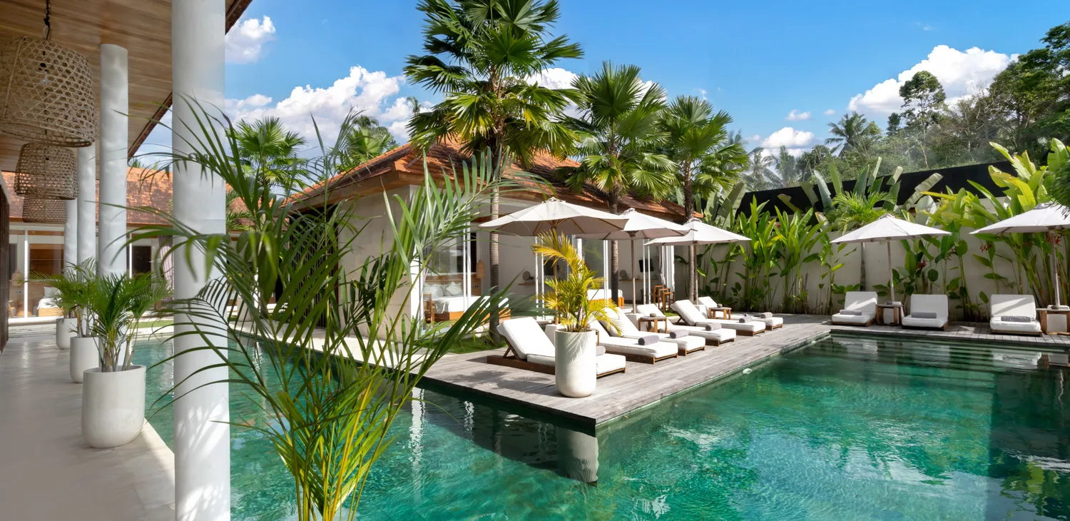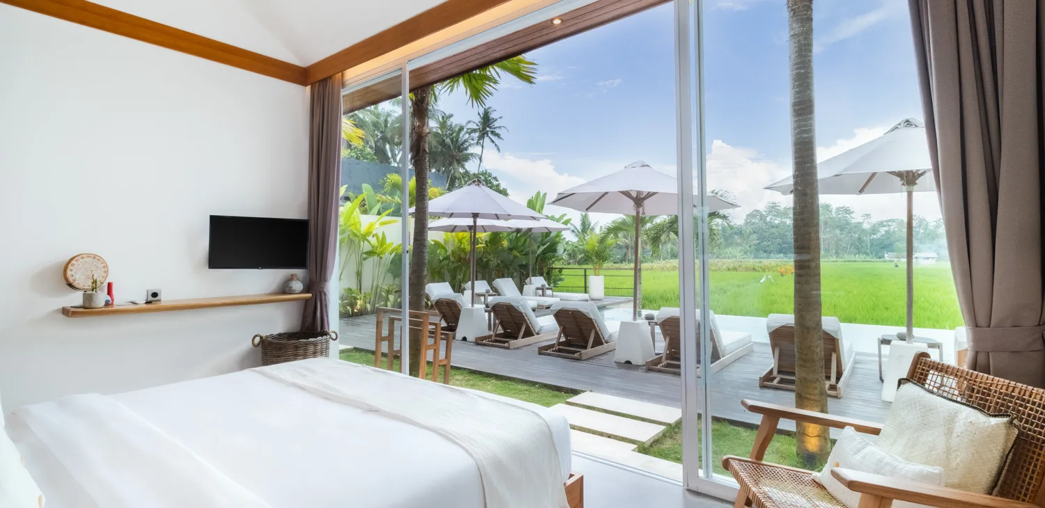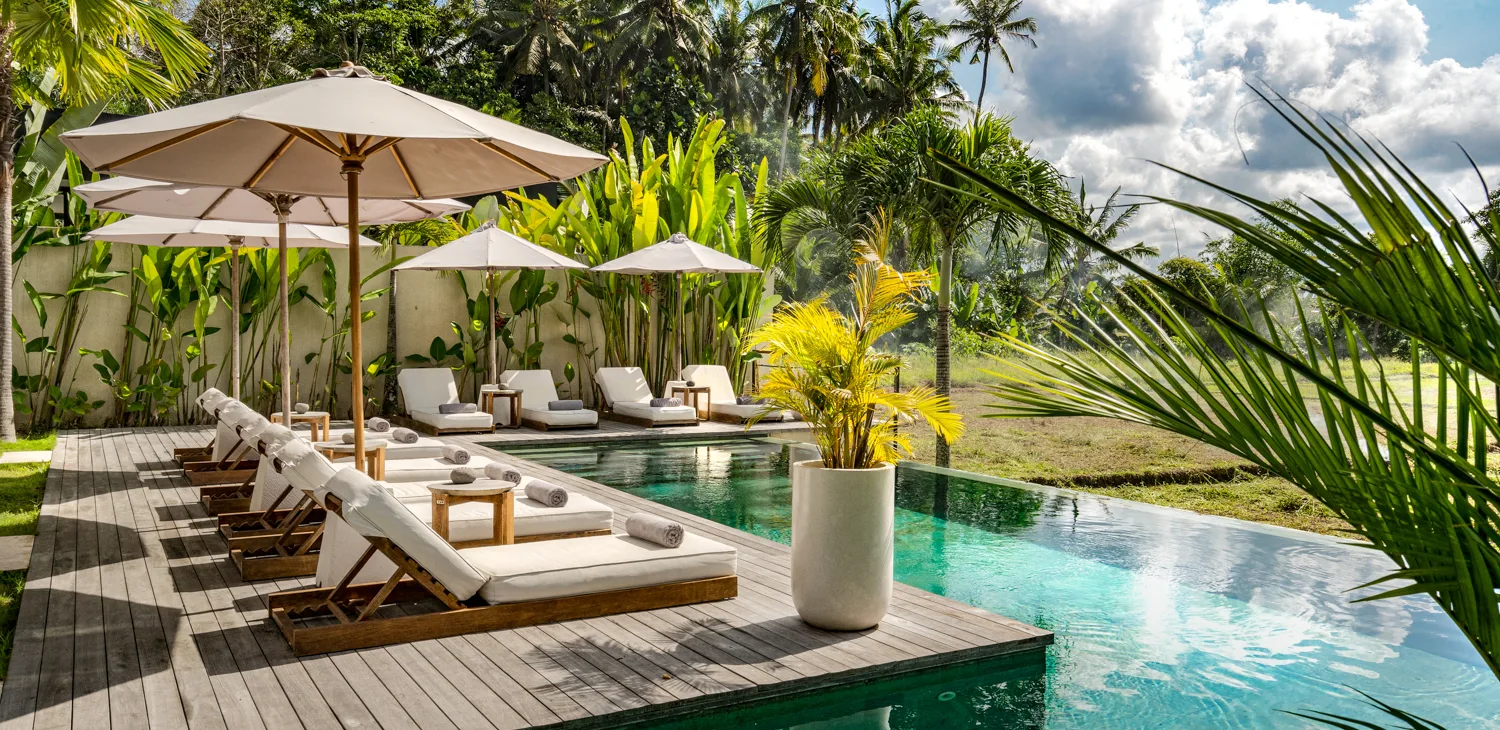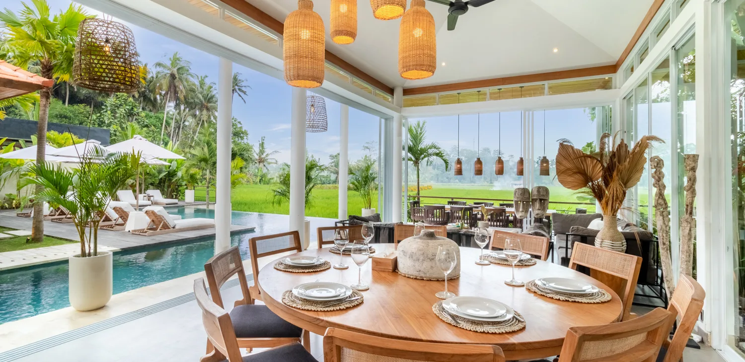 À l’extérieur, une piscine étincelante s’étend entre les ailes de la villa, bordée de palmiers et de confortables transats. La terrasse extérieure surplombe de verdoyantes rizières — un cadre parfait pour se détendre, dîner ou simplement admirer la beauté sereine du paysage d’Ubud.