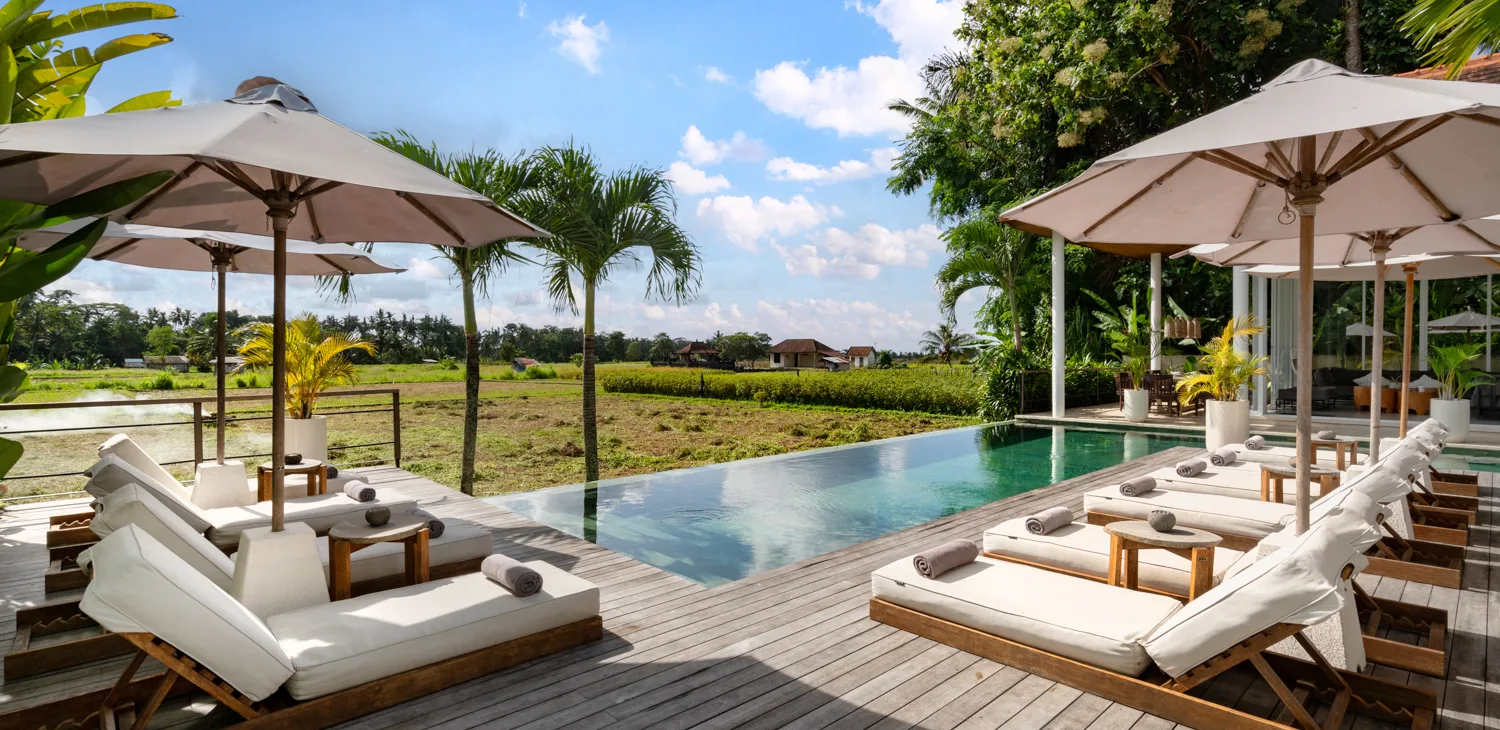 La piscine privée avec vue paisible sur les rizières et la nature environnante