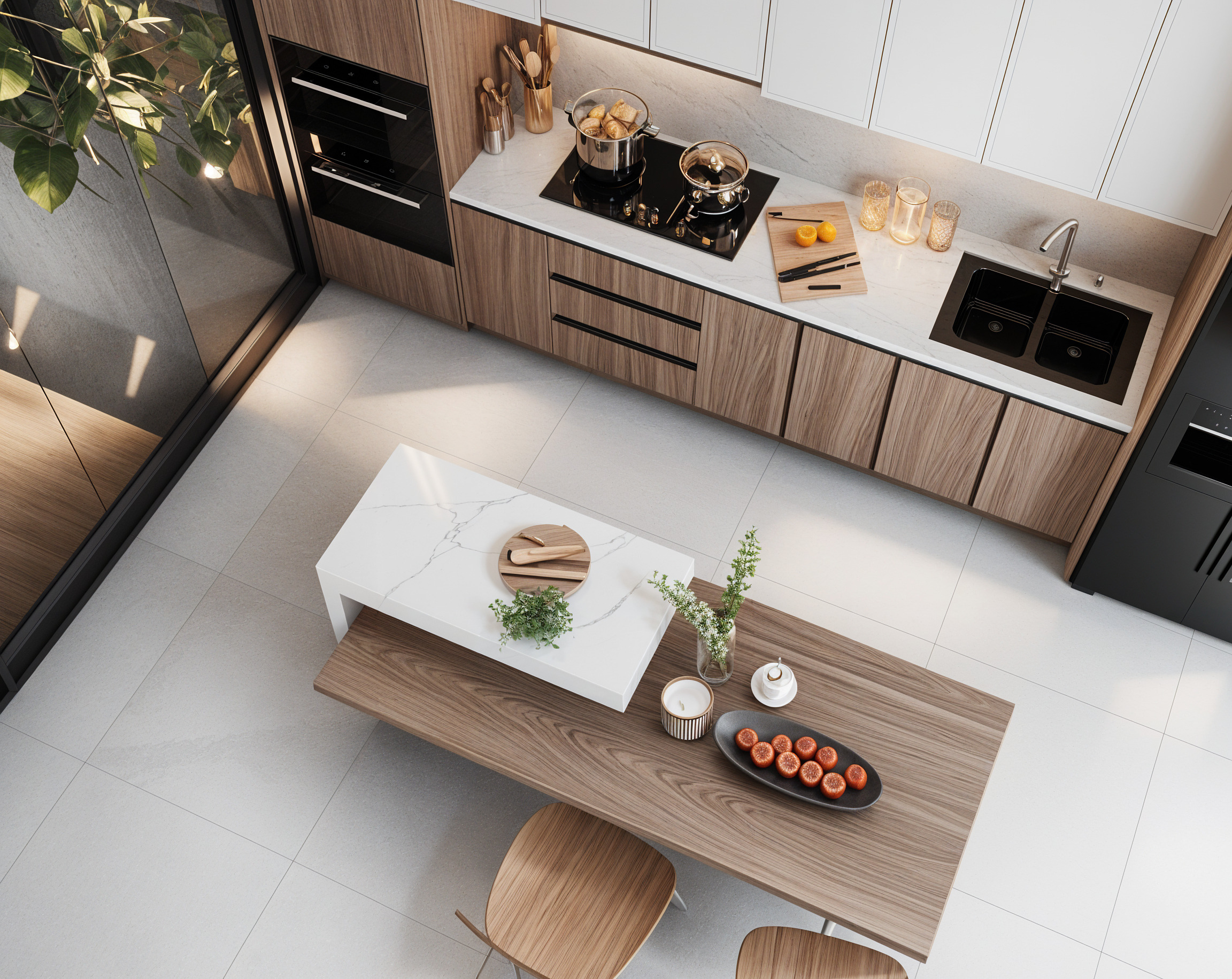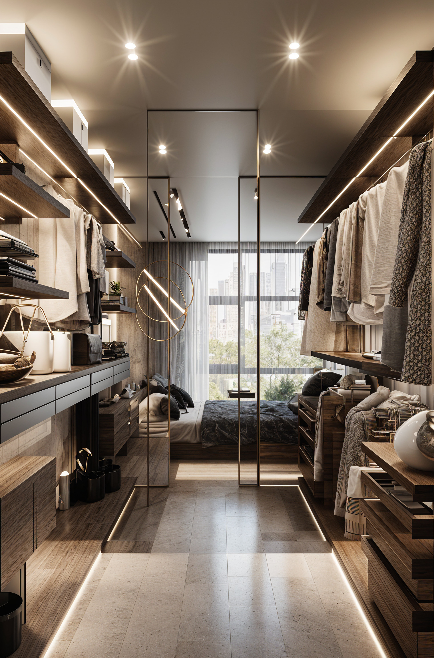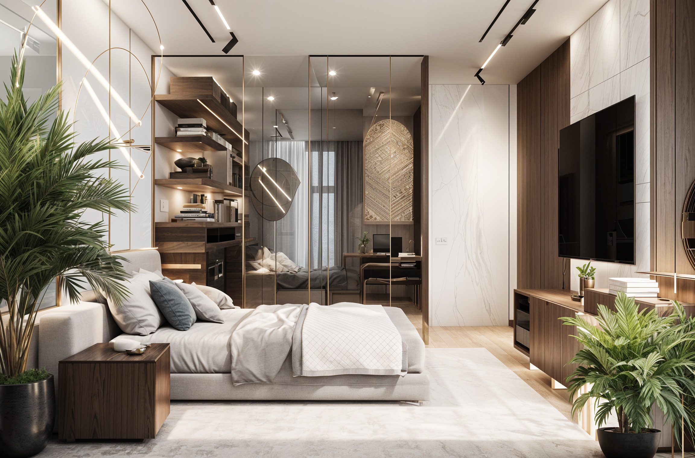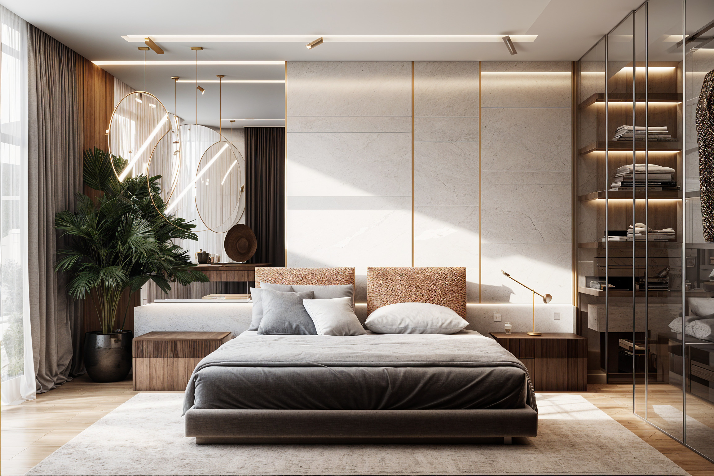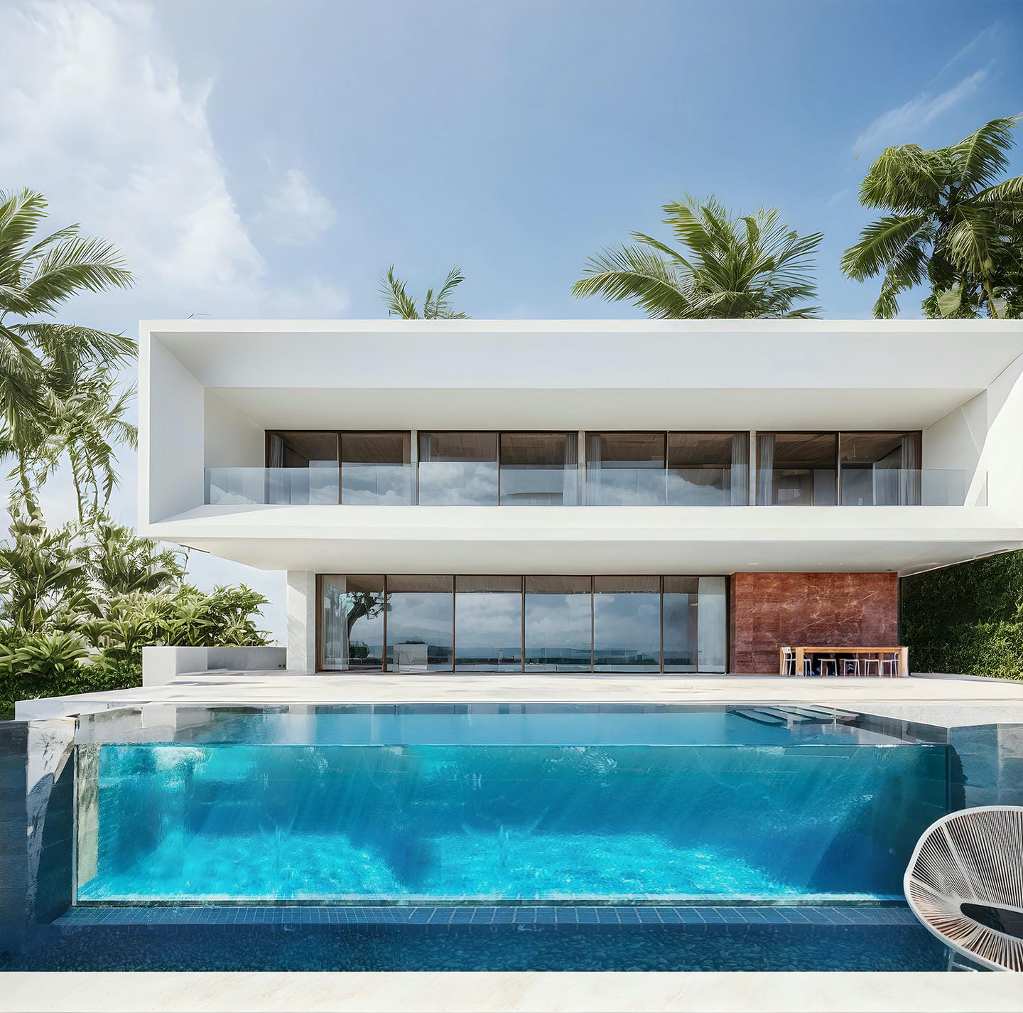 L’intérieur présente un design tropical moderne et luxueux, combinant des éléments en bois chaleureux, de la pierre naturelle, un éclairage doux et des lignes architecturales épurées. Les chambres sont spacieuses, lumineuses et élégantes, avec des dressings walk-in et des finitions raffinées créant une atmosphère de vie calme et sophistiquée.