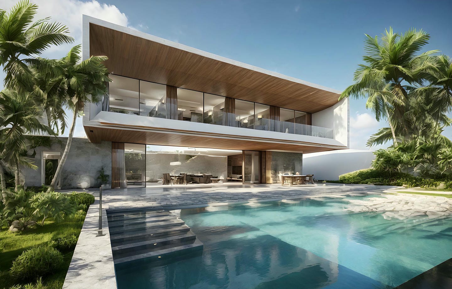 Les espaces extérieurs mettent en valeur une superbe piscine privée au design moderne, entourée d’un aménagement paysager tropical et de palmiers. La villa offre une vue apaisante sur le jardin et une ambiance de type resort, idéale pour la détente et la réception.