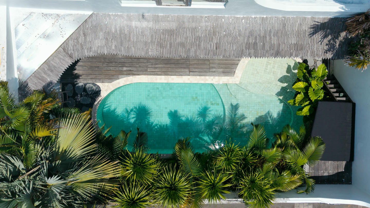 L'espace extérieur est une oasis privée entourée d'une verdure luxuriante. Une piscine élégante longe la villa, complétée par des plantes tropicales et une façade blanche et épurée. Le niveau supérieur bénéficie d'une perspective verdoyante apaisante, renforçant le sentiment d'intimité et de détente.