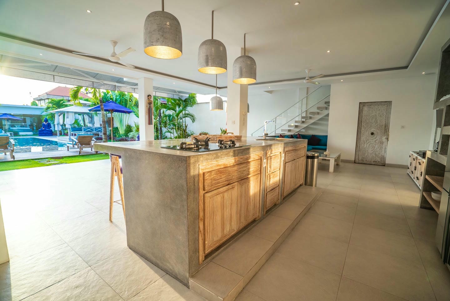 Les espaces extérieurs sont pensés dans un esprit resort, avec une impressionnante piscine de 17 x 6 mètres entourée de transats, de jardins paysagers et de plusieurs espaces de détente.