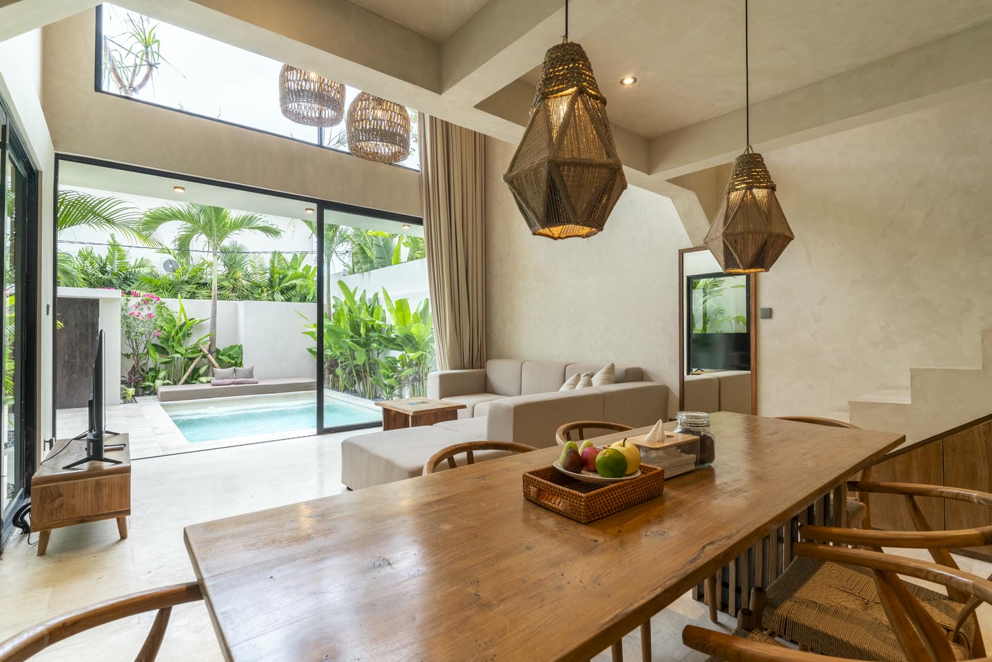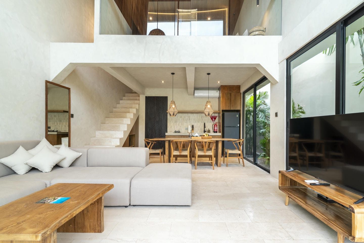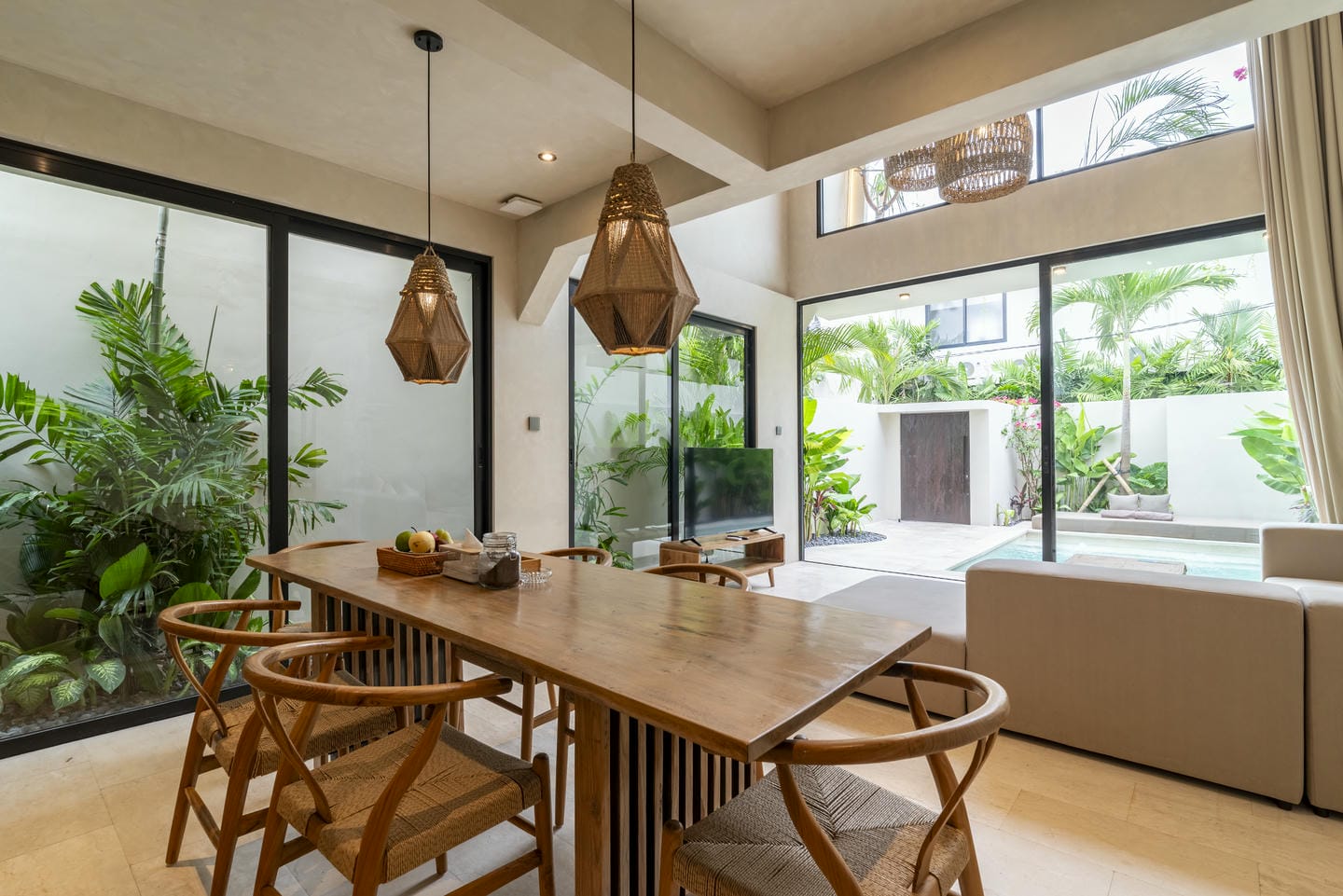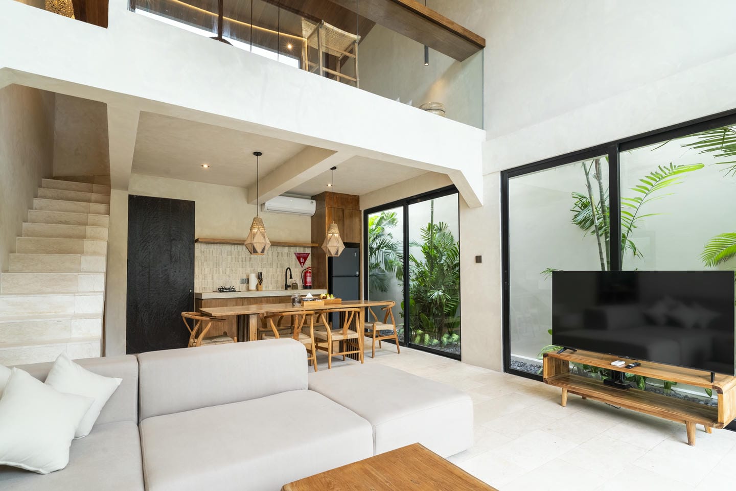 À l’intérieur, la villa arbore un style tropical moderne avec des tons neutres et doux, des finitions en bois chaleureuses et une lumière naturelle abondante grâce à de grandes baies vitrées. L’espace de vie ouvert s’intègre harmonieusement à la salle à manger et à la cuisine, conçues pour le confort et l’élégance.