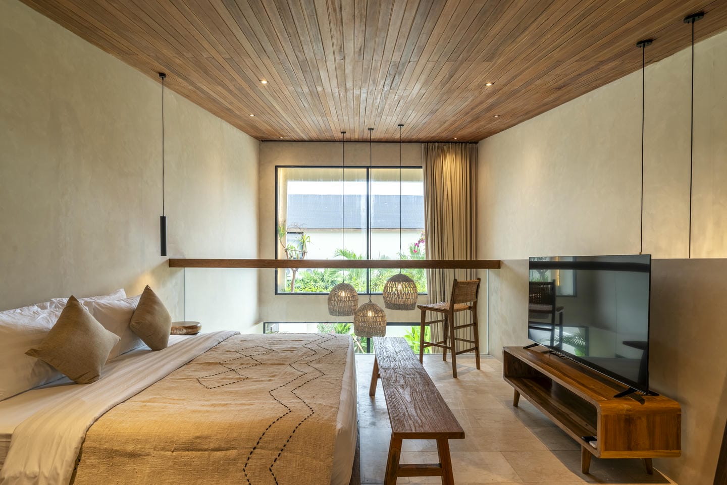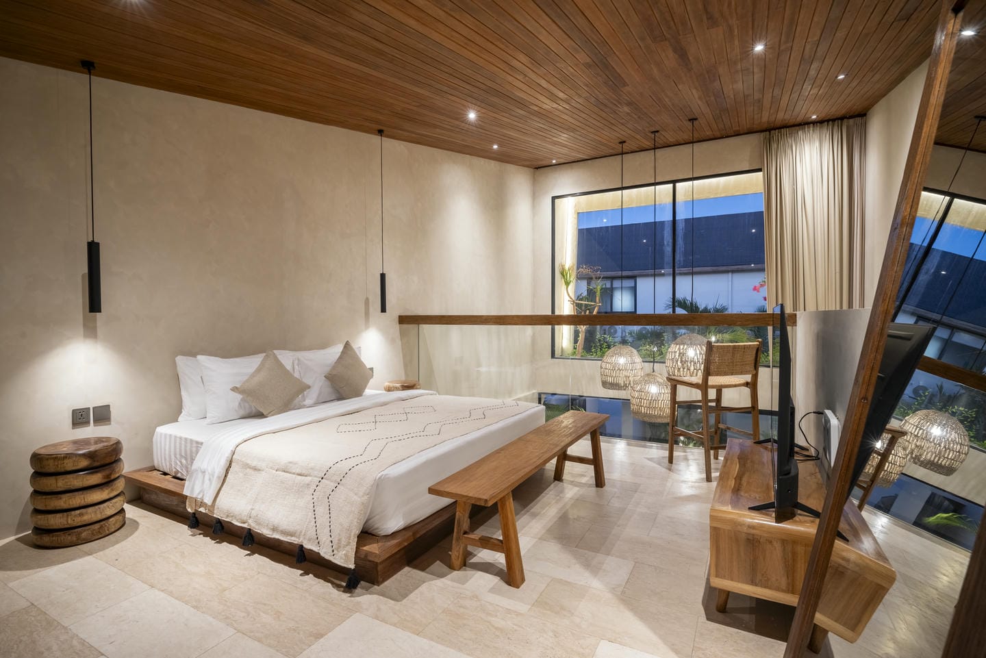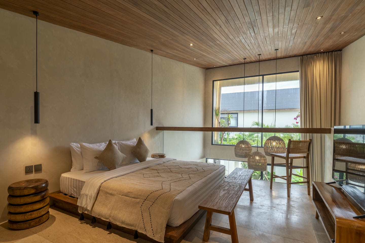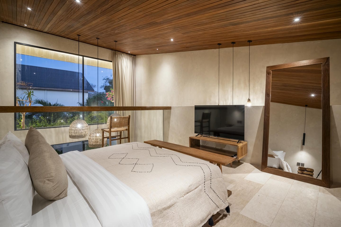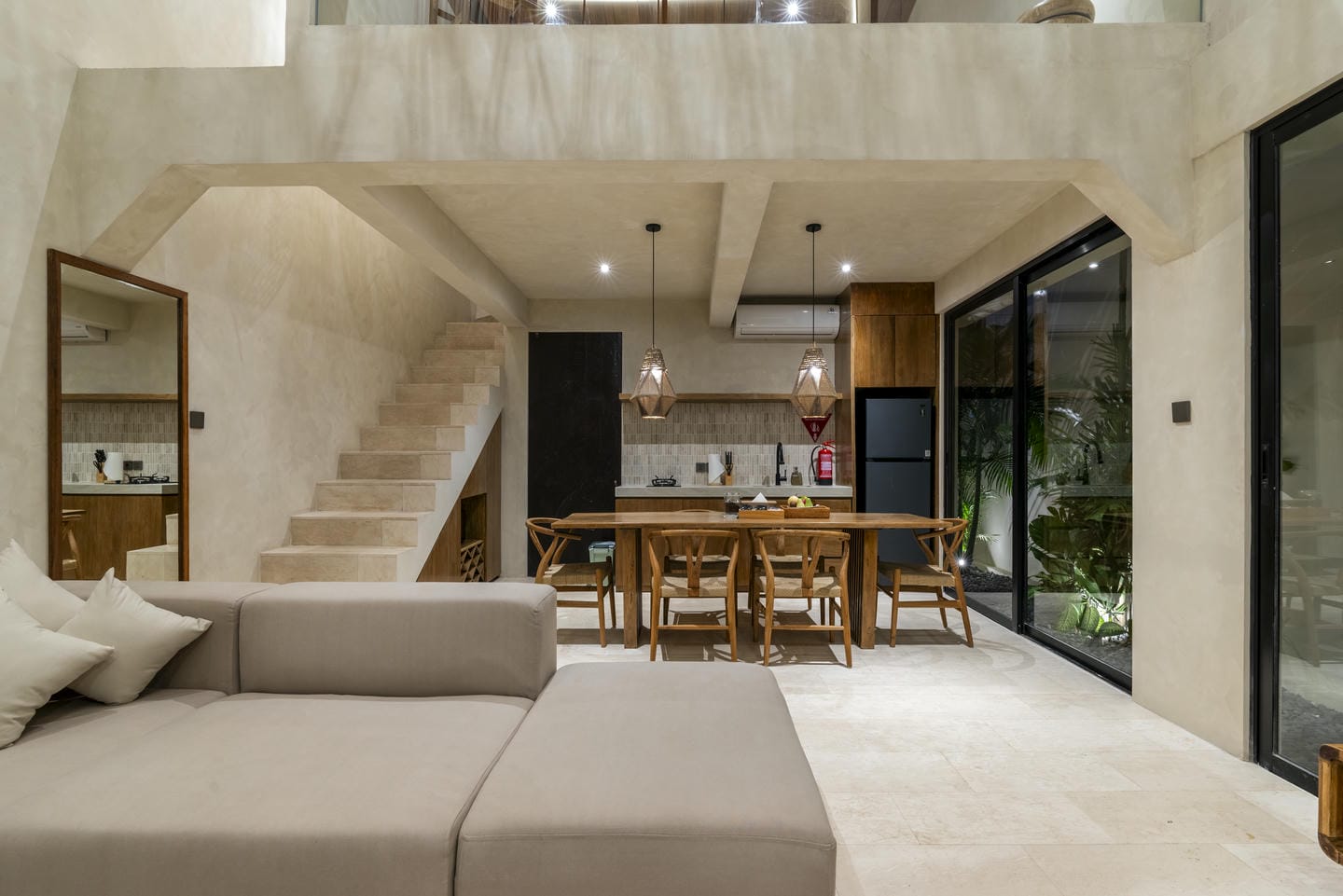 À l’intérieur, la villa arbore un style tropical moderne avec des tons neutres et doux, des finitions en bois chaleureuses et une lumière naturelle abondante grâce à de grandes baies vitrées. L’espace de vie ouvert s’intègre harmonieusement à la salle à manger et à la cuisine, conçues pour le confort et l’élégance.