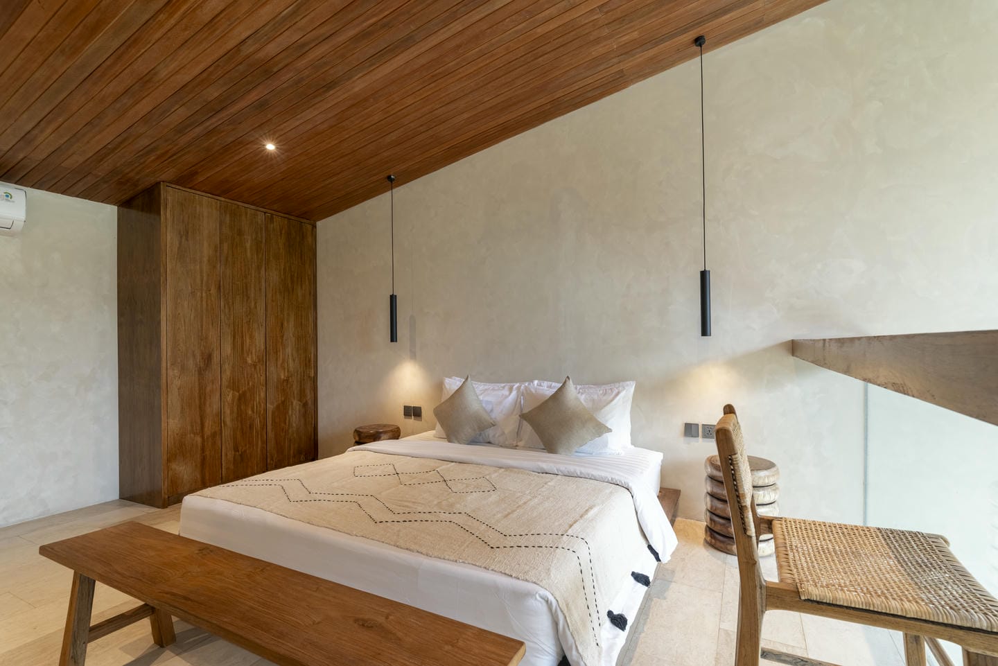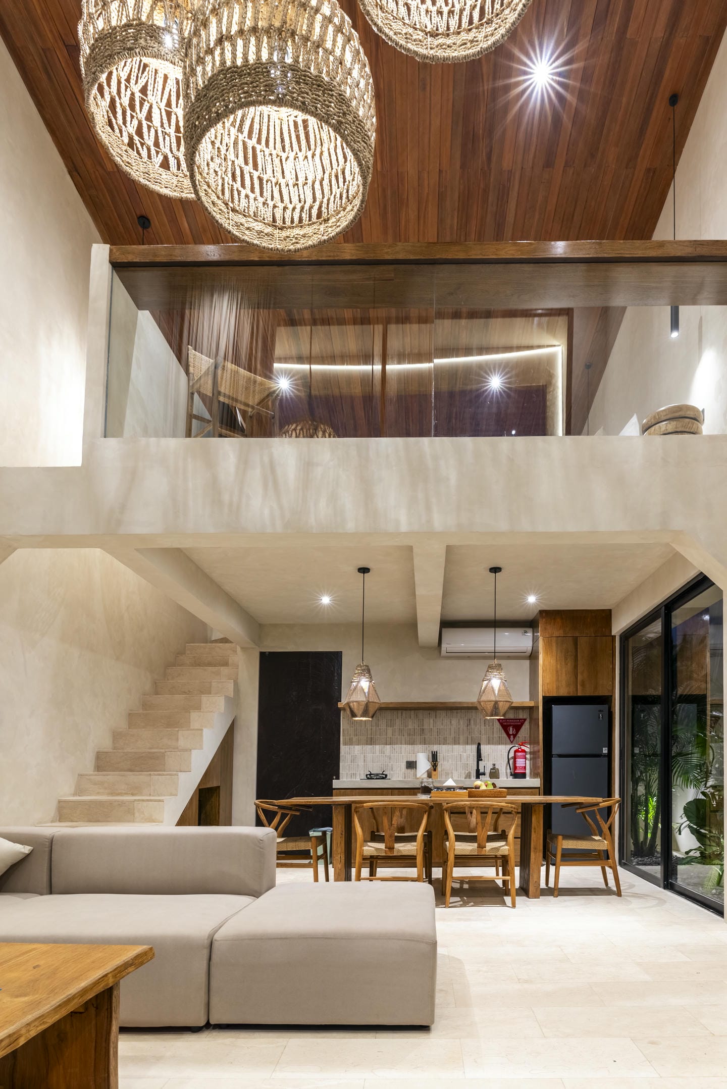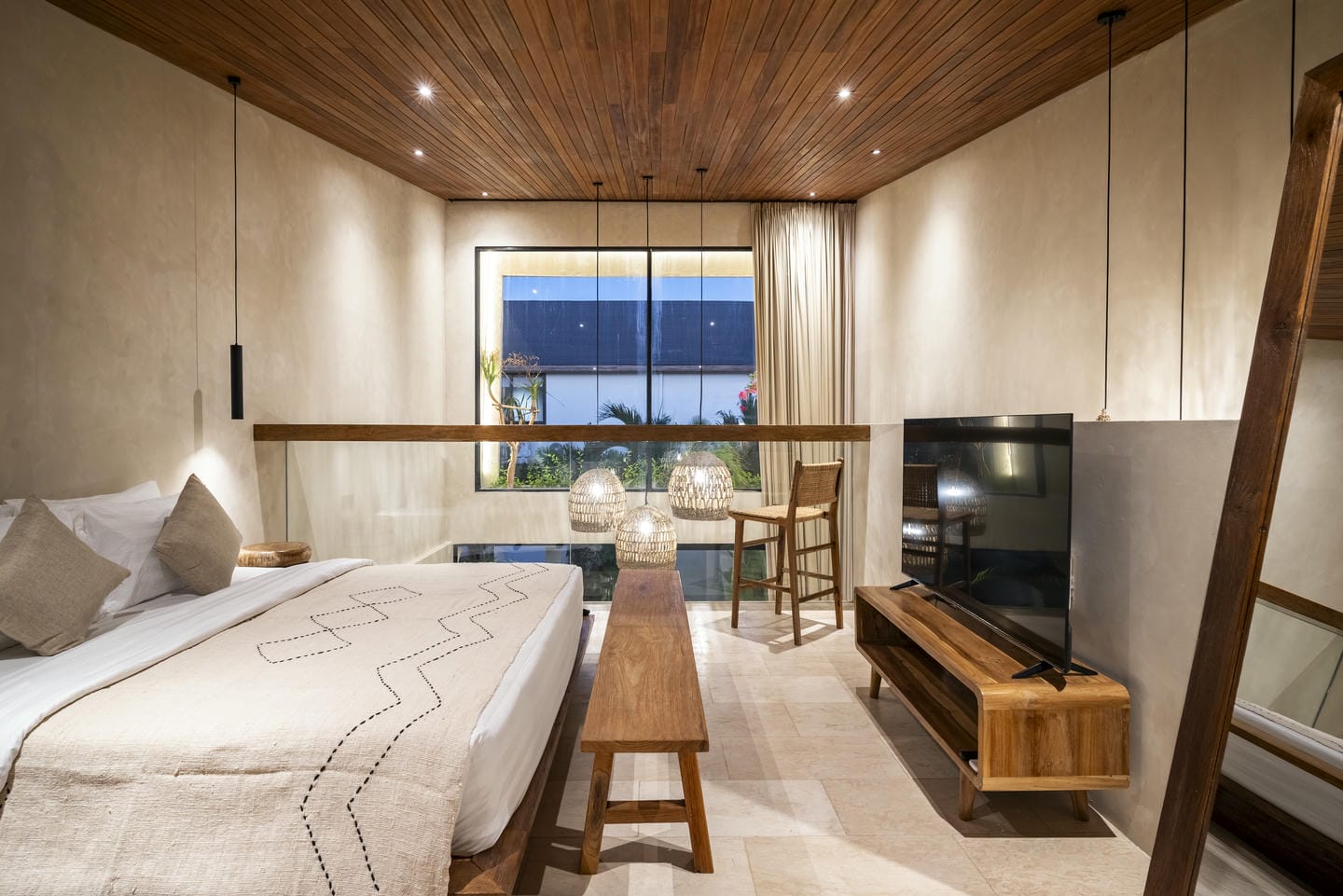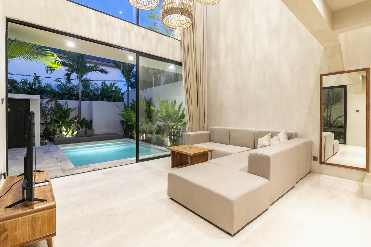 À l’intérieur, la villa arbore un style tropical moderne avec des tons neutres et doux, des finitions en bois chaleureuses et une lumière naturelle abondante grâce à de grandes baies vitrées. L’espace de vie ouvert s’intègre harmonieusement à la salle à manger et à la cuisine, conçues pour le confort et l’élégance.