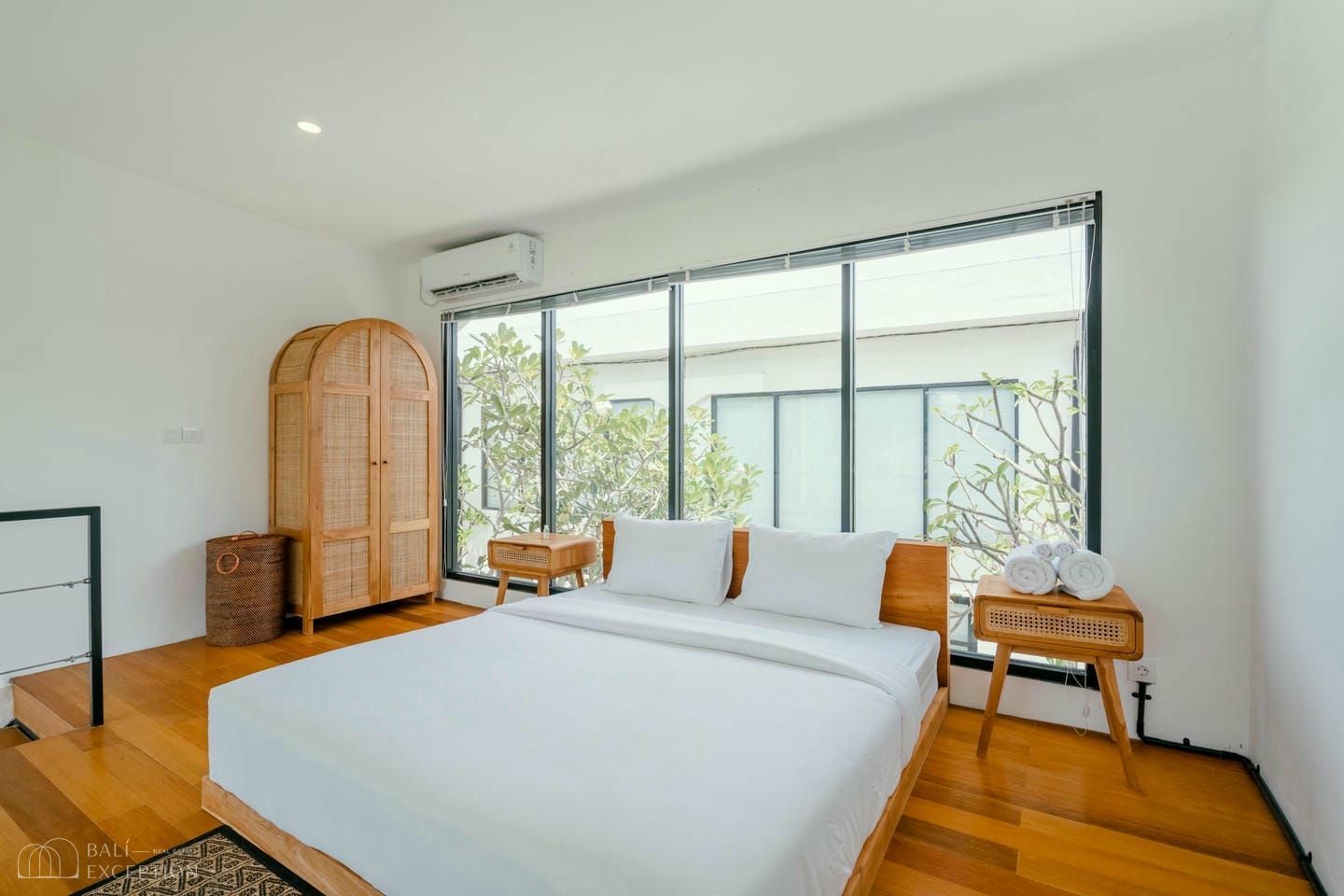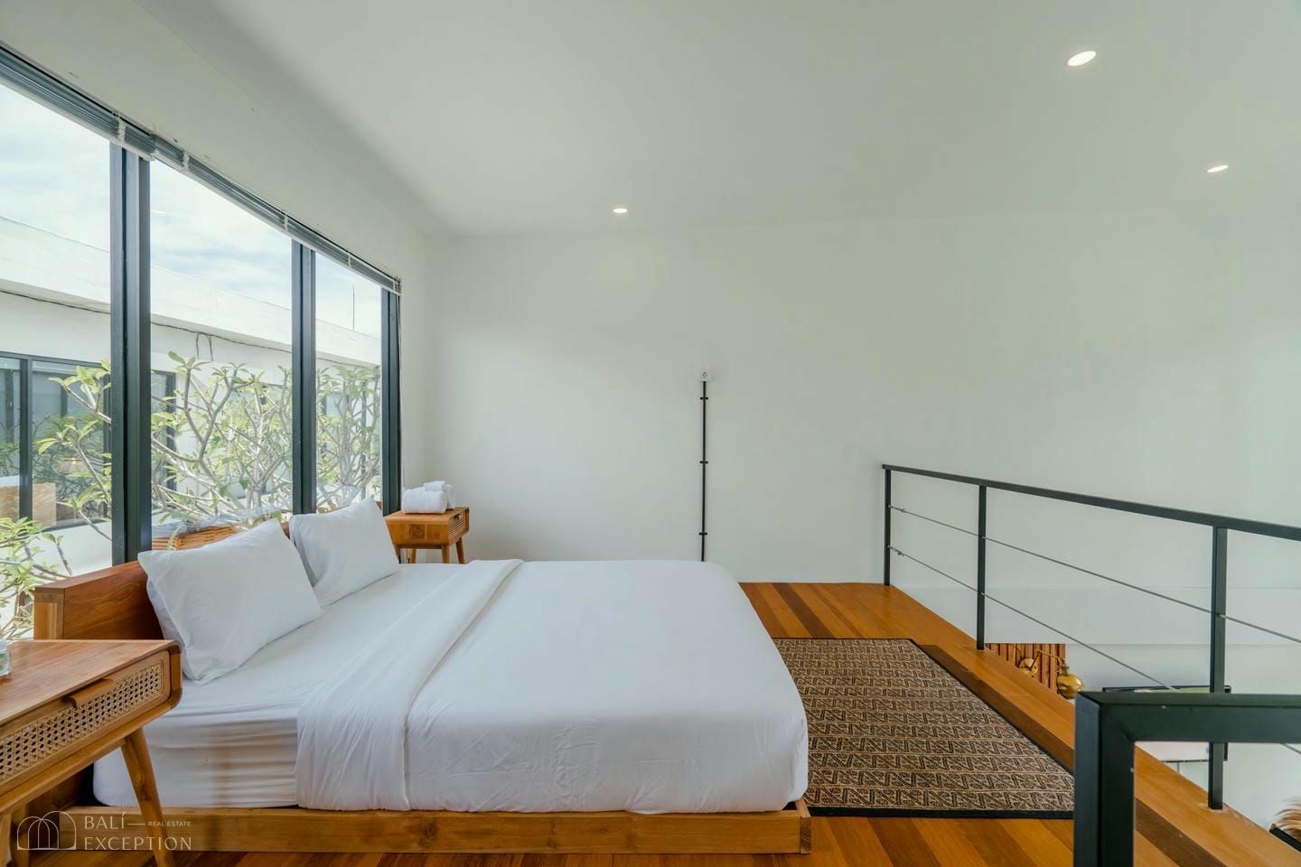 Cette villa présente un design loft tropical moderne avec de hauts plafonds et un espace de vie lumineux en open space, à la fois spacieux et accueillant. L’intérieur associe des tons blancs épurés à des touches de bois chaleureux, créant une ambiance minimaliste et cosy. De grandes baies vitrées laissent entrer la lumière naturelle et relient harmonieusement l’espace de vie à la piscine extérieure, tandis que la mezzanine apporte une touche architecturale élégante, complétée par un aménagement bien pensé avec une chambre.