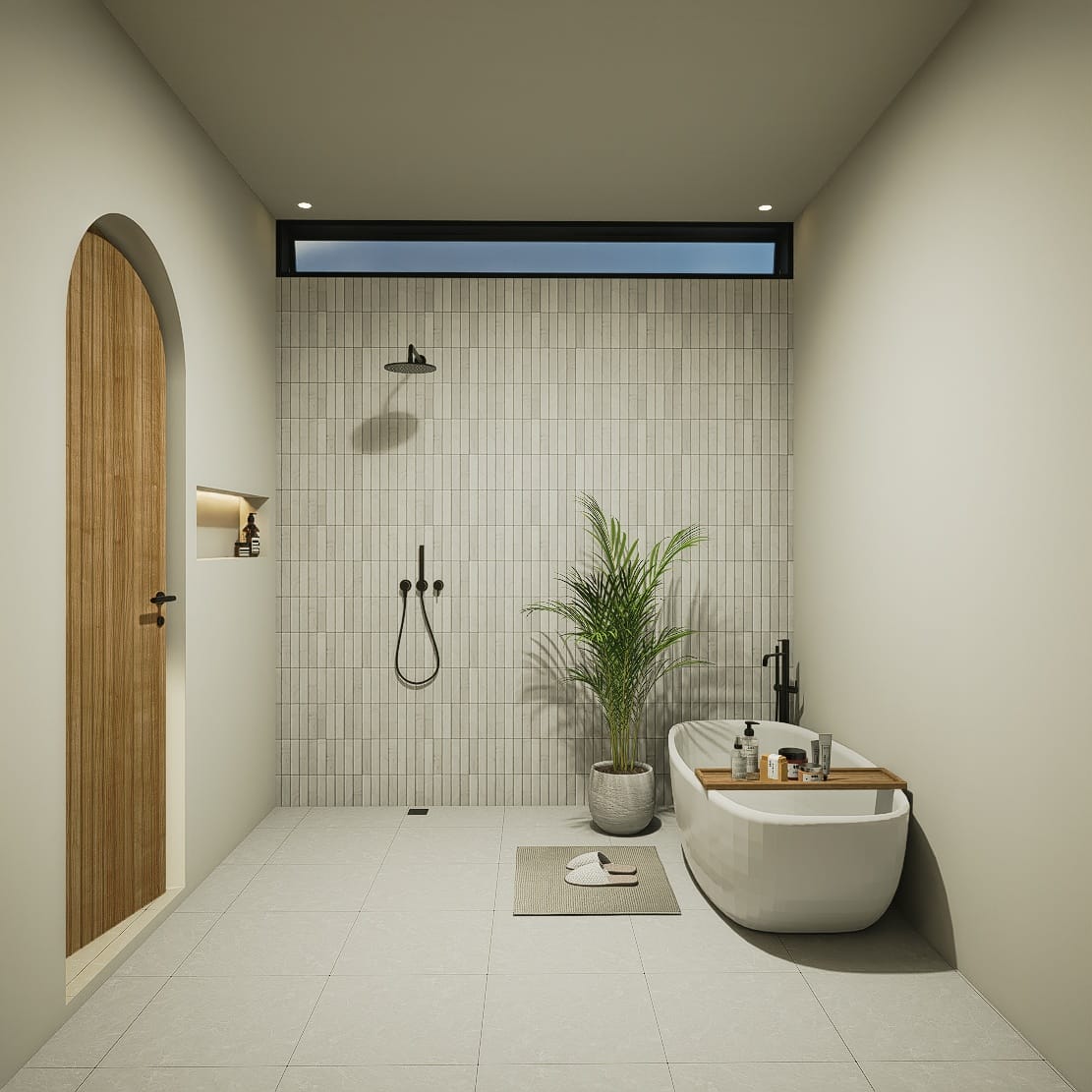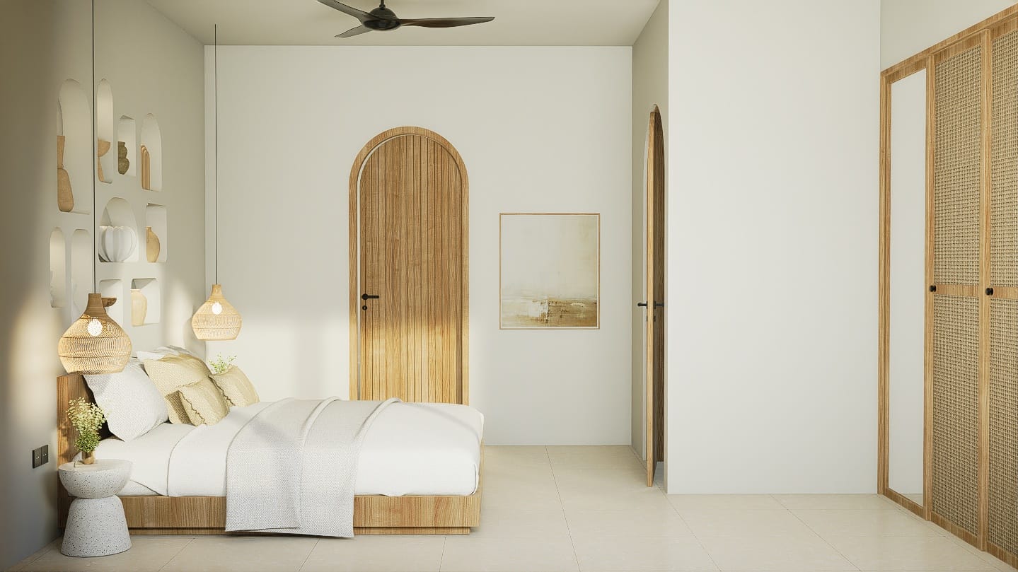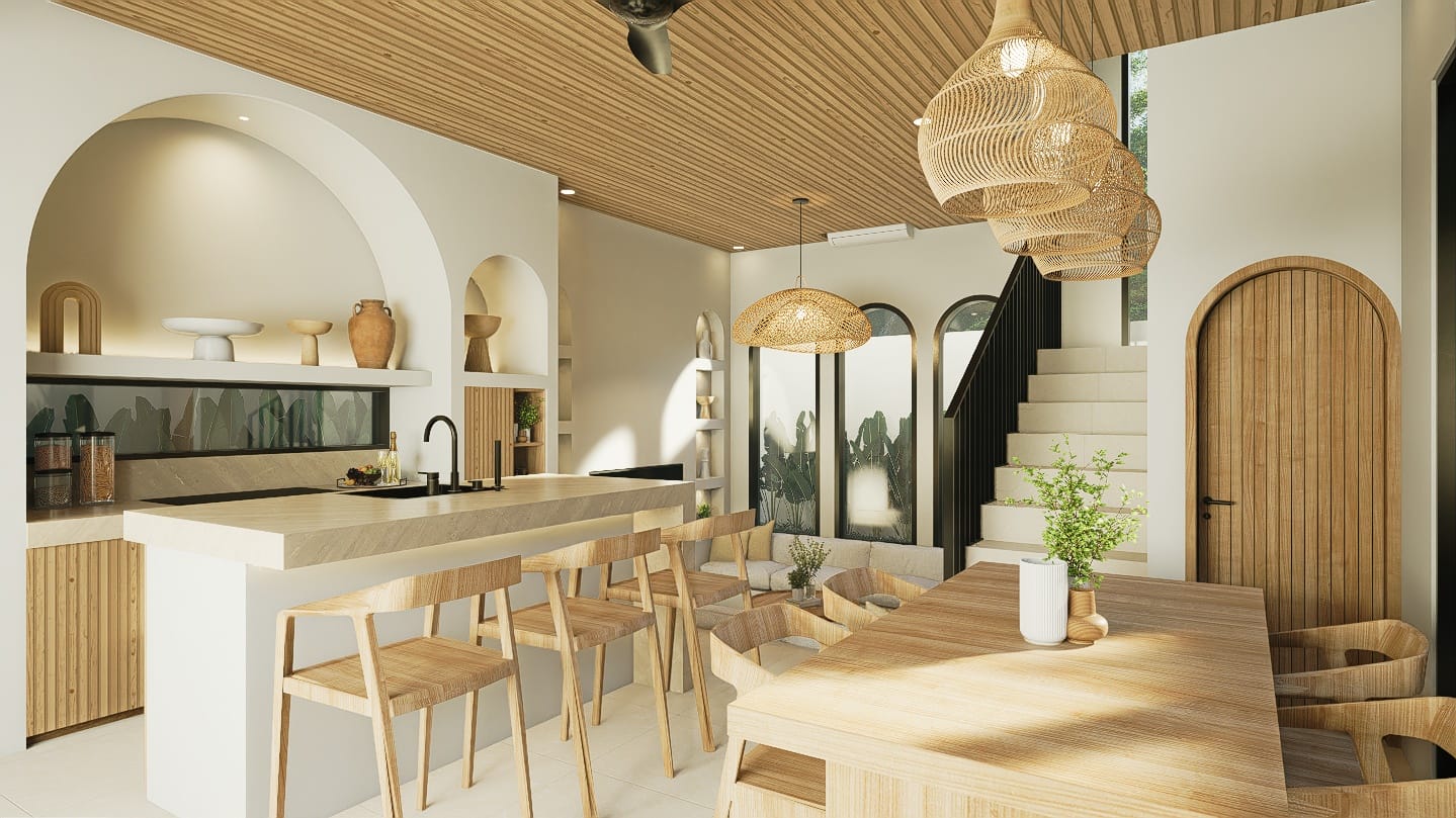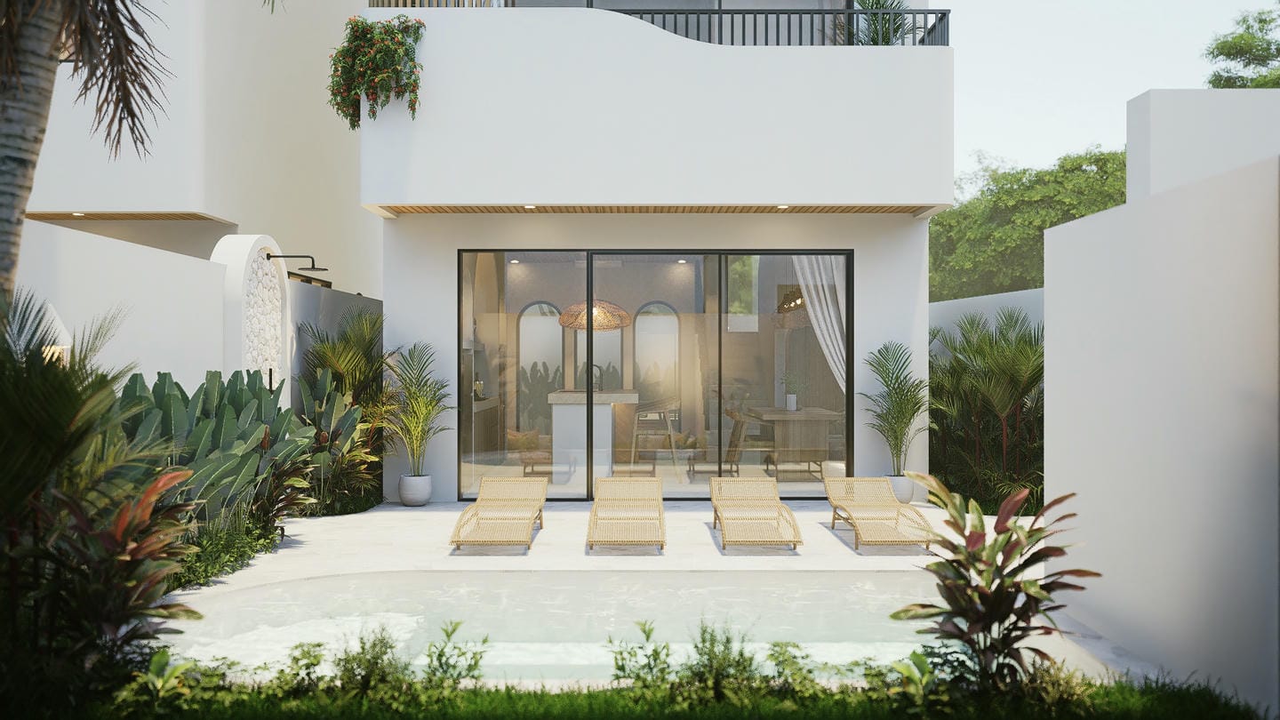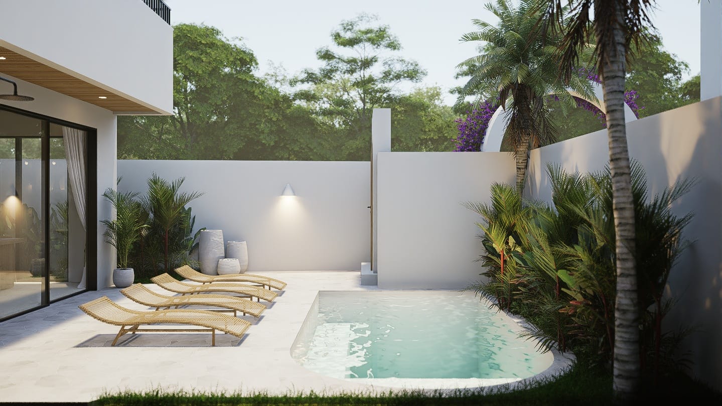 L’espace extérieur est pensé pour un art de vivre côtier détendu, avec une piscine privée dotée d’une plage peu profonde et d’une douche extérieure. La villa comprend également un rooftop avec la possibilité d’ajouter un bassin froid, un jacuzzi ou un sauna.
