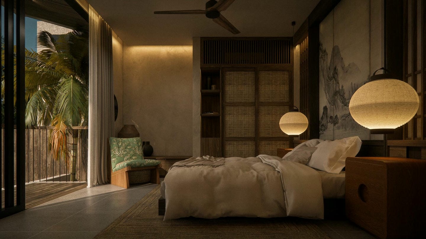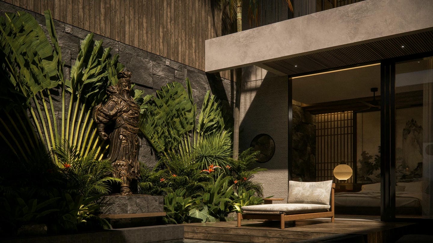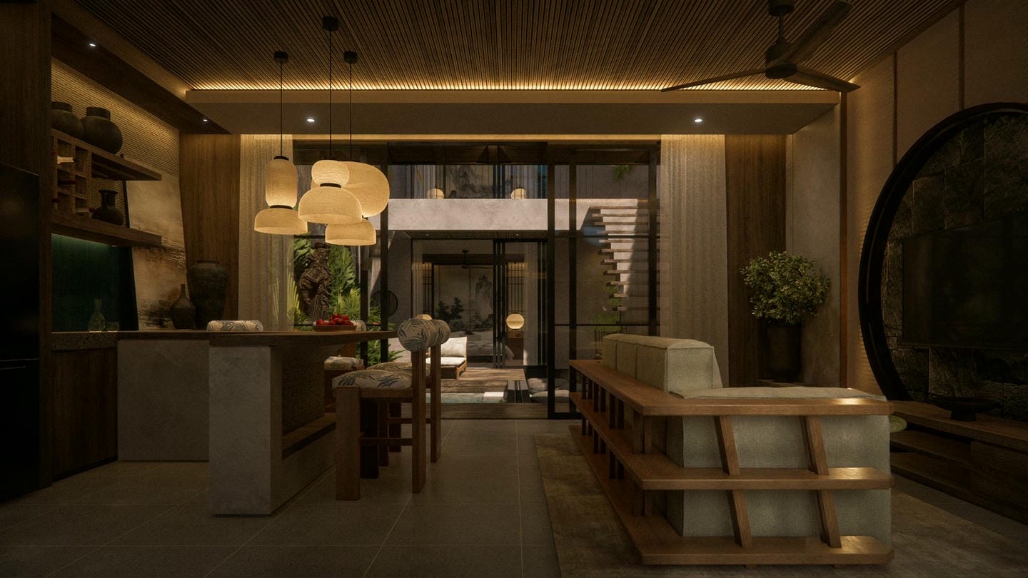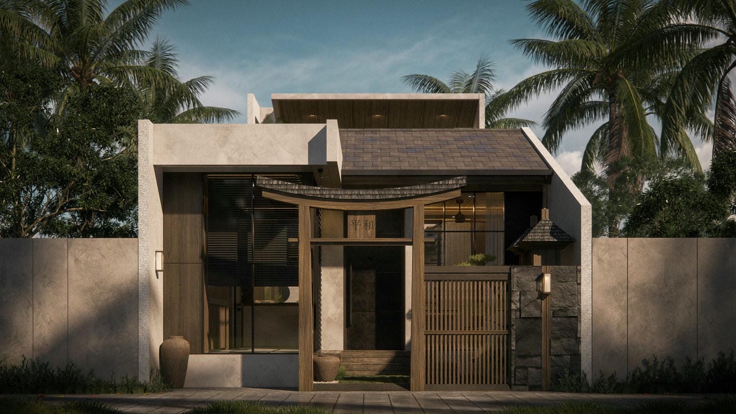 À l’entrée, une élégante statue Japandi vous accueille. Cette villa au design Japandi dispose de 2 chambres avec salles de bain privatives, d’un toilette invités, et d’un salon lumineux et ouvert avec de grandes fenêtres laissant entrer la lumière naturelle toute la journée. Entièrement meublée avec une décoration minimaliste aux tons naturels chaleureux, elle marie avec harmonie la simplicité japonaise et la fonctionnalité scandinave. La cuisine est entièrement équipée et prête à l’emploi.