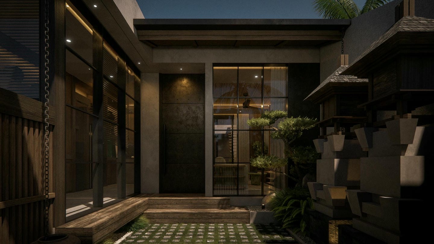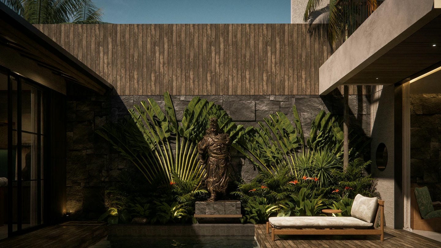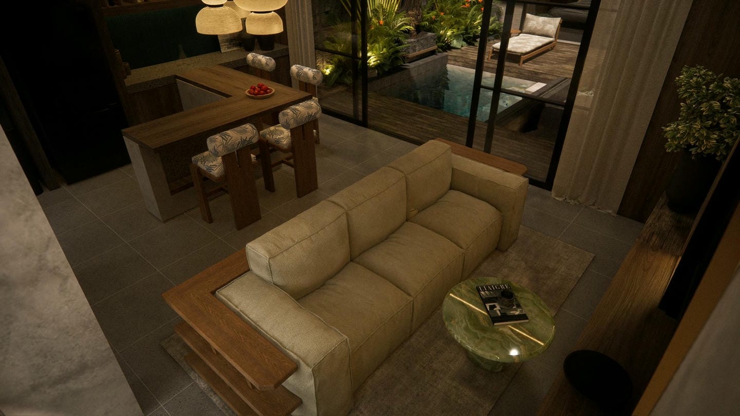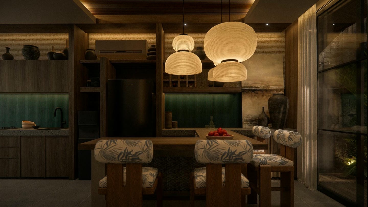 À l’entrée, une élégante statue Japandi vous accueille. Cette villa au design Japandi dispose de 2 chambres avec salles de bain privatives, d’un toilette invités, et d’un salon lumineux et ouvert avec de grandes fenêtres laissant entrer la lumière naturelle toute la journée. Entièrement meublée avec une décoration minimaliste aux tons naturels chaleureux, elle marie avec harmonie la simplicité japonaise et la fonctionnalité scandinave. La cuisine est entièrement équipée et prête à l’emploi.
