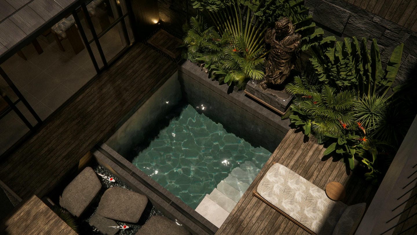 À l’extérieur, profitez de votre piscine privée avec transats, d’un coin lounge zen parfait pour se détendre ou recevoir des invités, ainsi que d’un parking privé pour plus de confort.