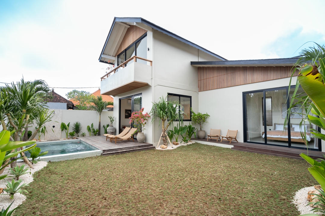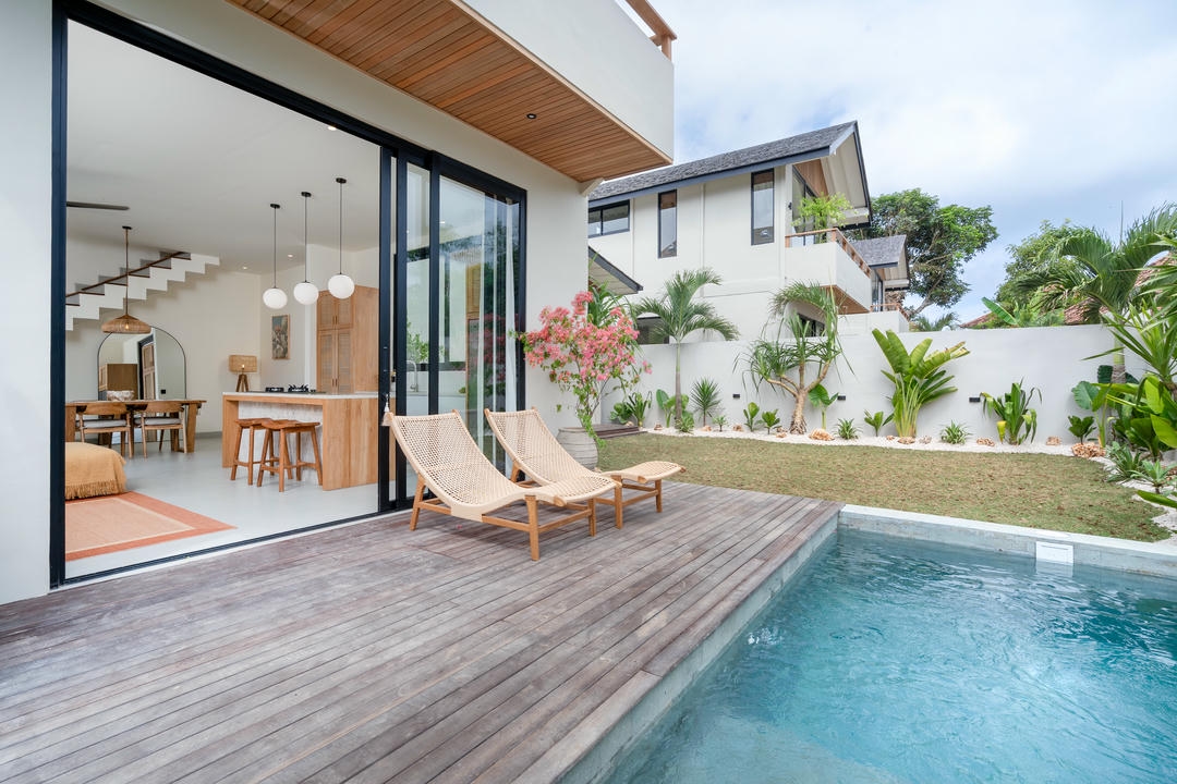 À l’extérieur, profitez d’une piscine privée avec transats, entourée d’un jardin, créant une atmosphère tropicale détendue.