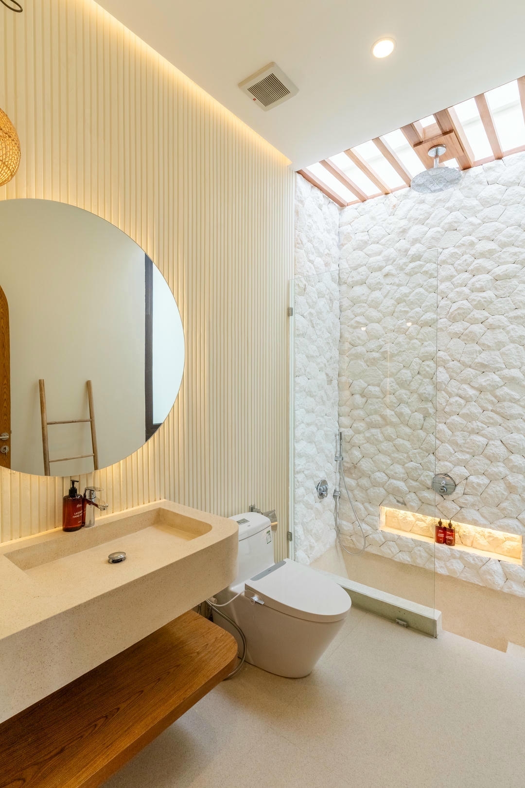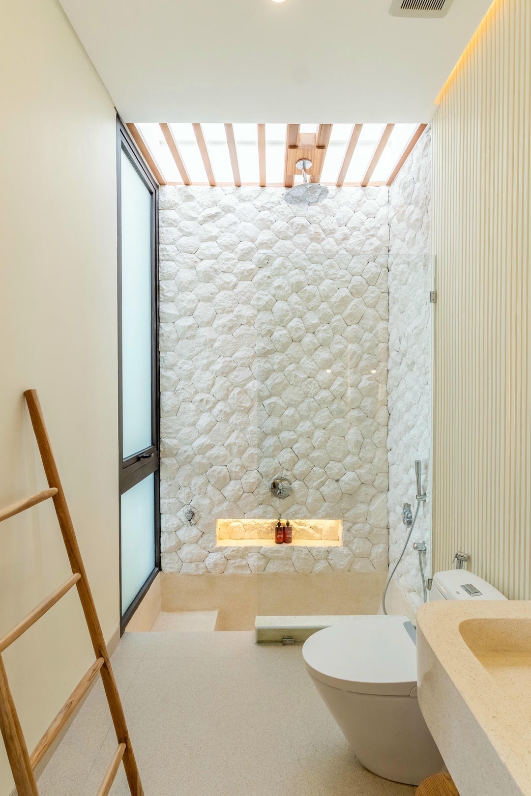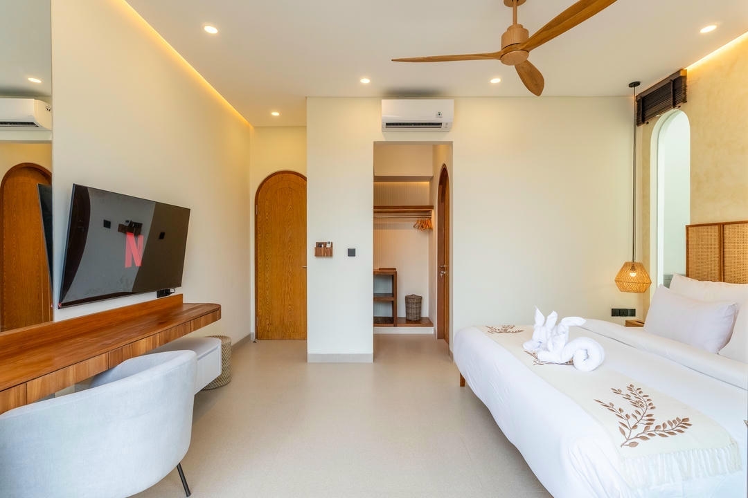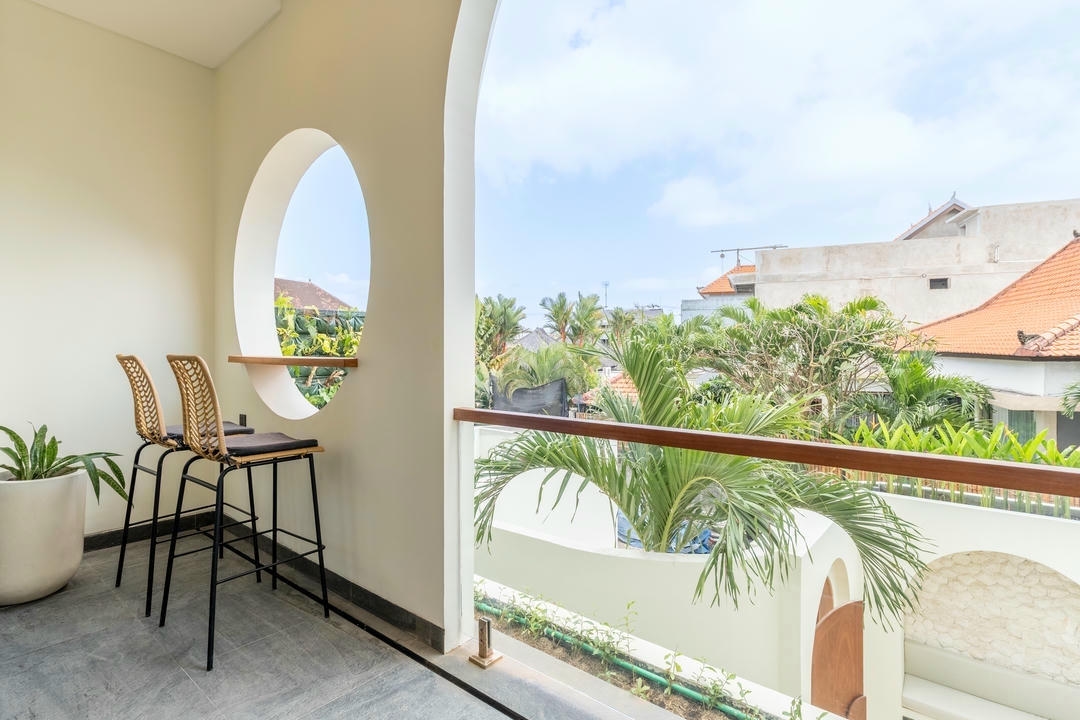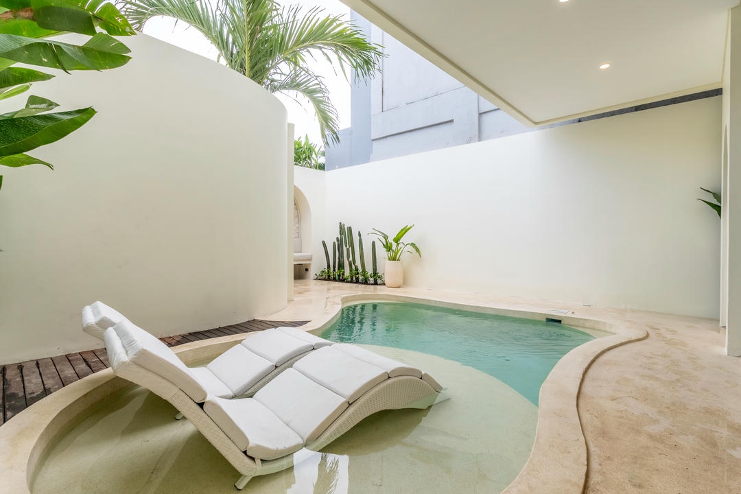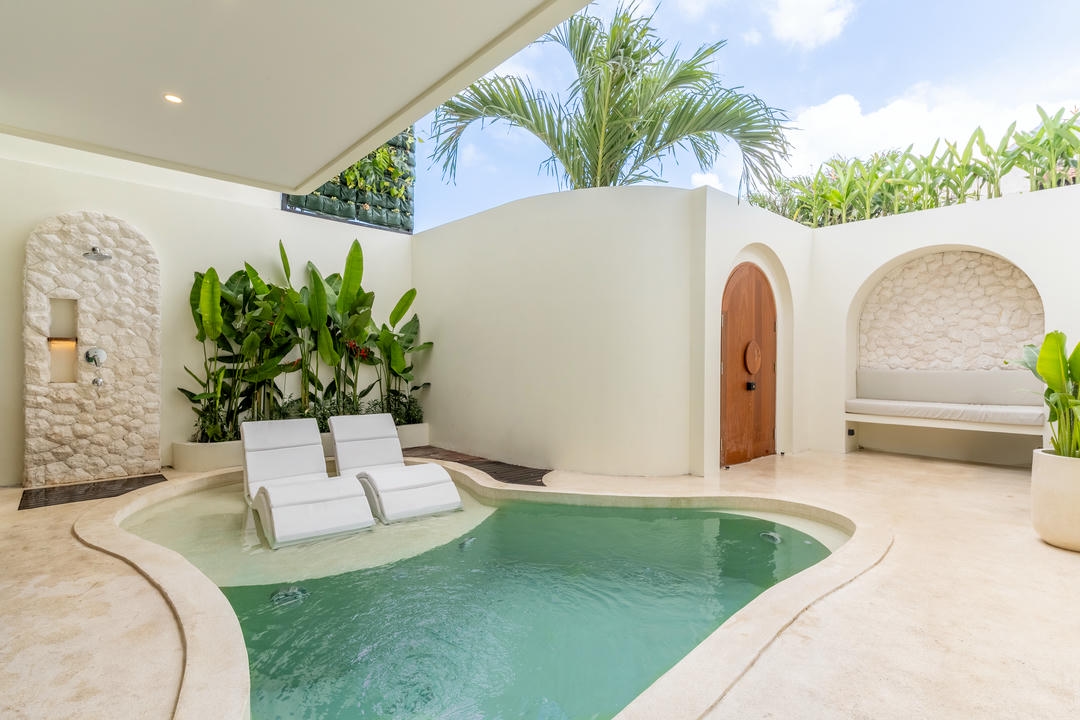 À l’extérieur, vous profiterez d’une piscine privée avec bains de soleil et d’une douche extérieure, tandis que le balcon aménagé avec un espace lounge constitue l’endroit idéal pour se détendre et apprécier l’ambiance unique de Canggu.