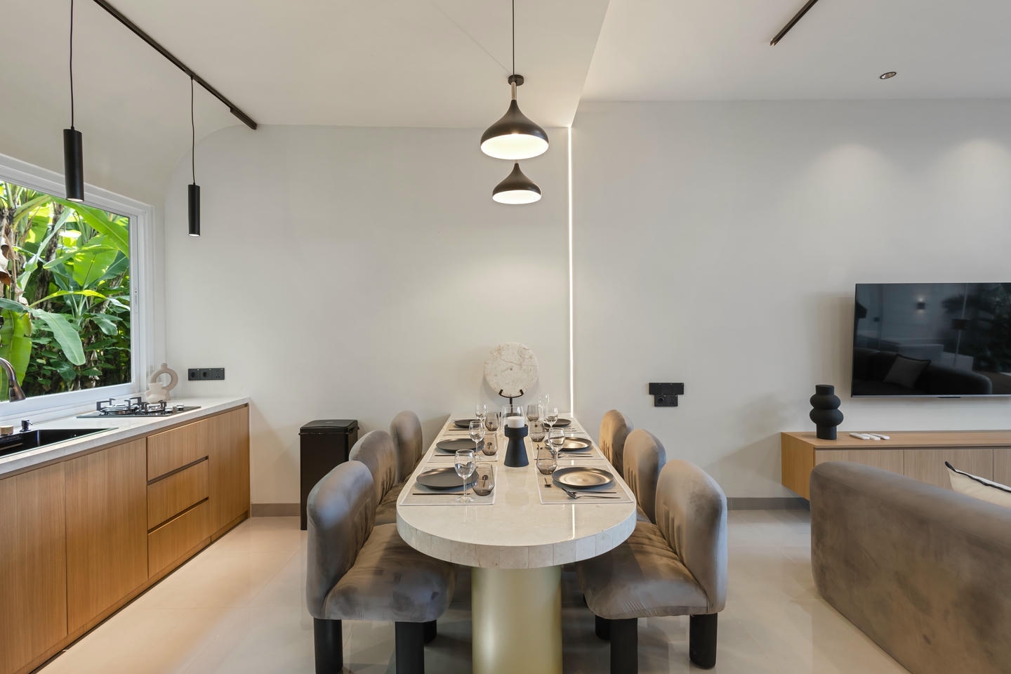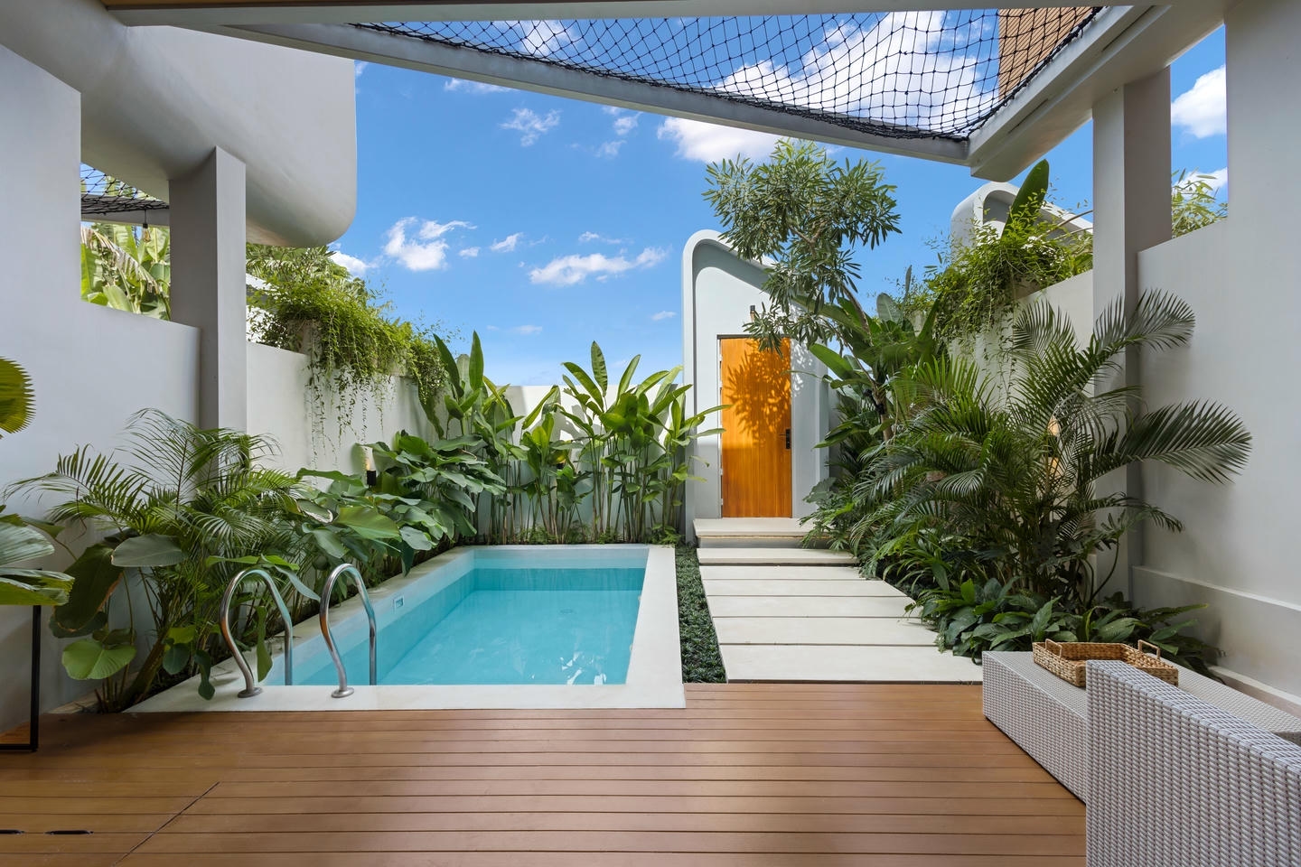 À l’extérieur, profitez d’une piscine privée avec un agréable espace lounge, idéale pour se détendre ou recevoir. À l’étage, la terrasse rooftop aménagée avec bains de soleil et coin salon offre un espace convivial pour se relaxer, recevoir des invités ou admirer les couchers de soleil balinais.