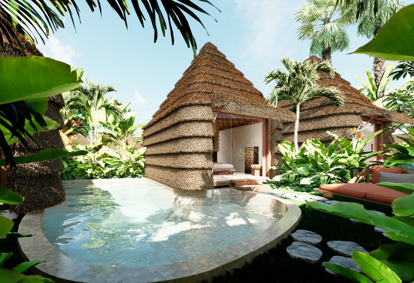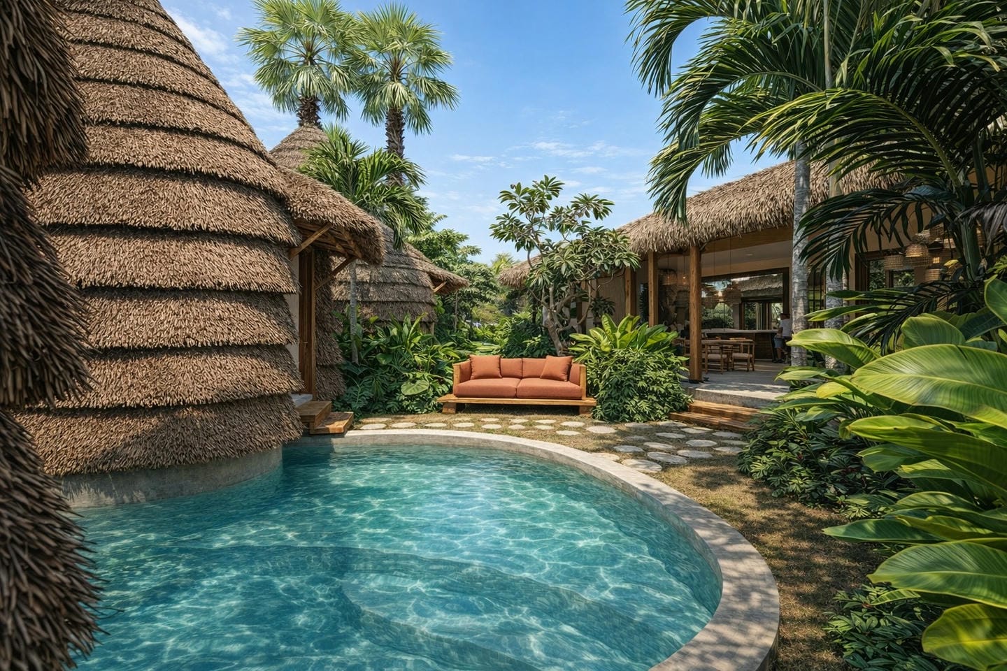 À l’extérieur, profitez d’une piscine privée et d’un espace lounge confortable, le tout dans un cadre tropical paisible.