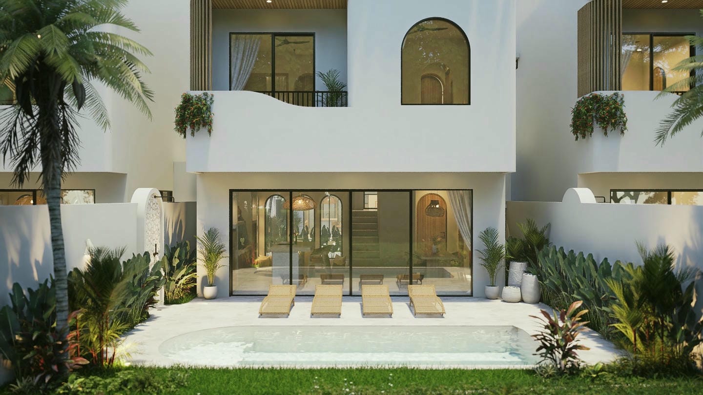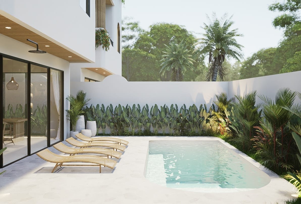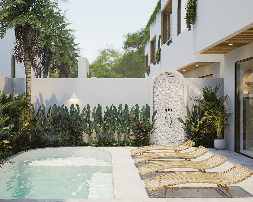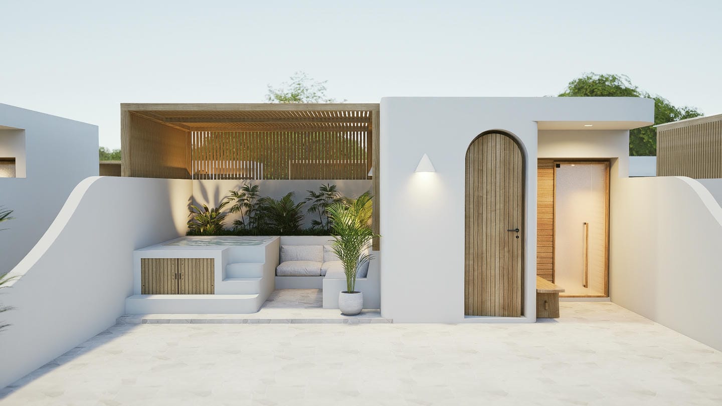 L’espace extérieur est pensé pour un art de vivre côtier détendu, avec une piscine privée dotée d’une plage peu profonde et d’une douche extérieure. La villa comprend également un rooftop avec la possibilité d’ajouter un bassin froid, un jacuzzi ou un sauna.