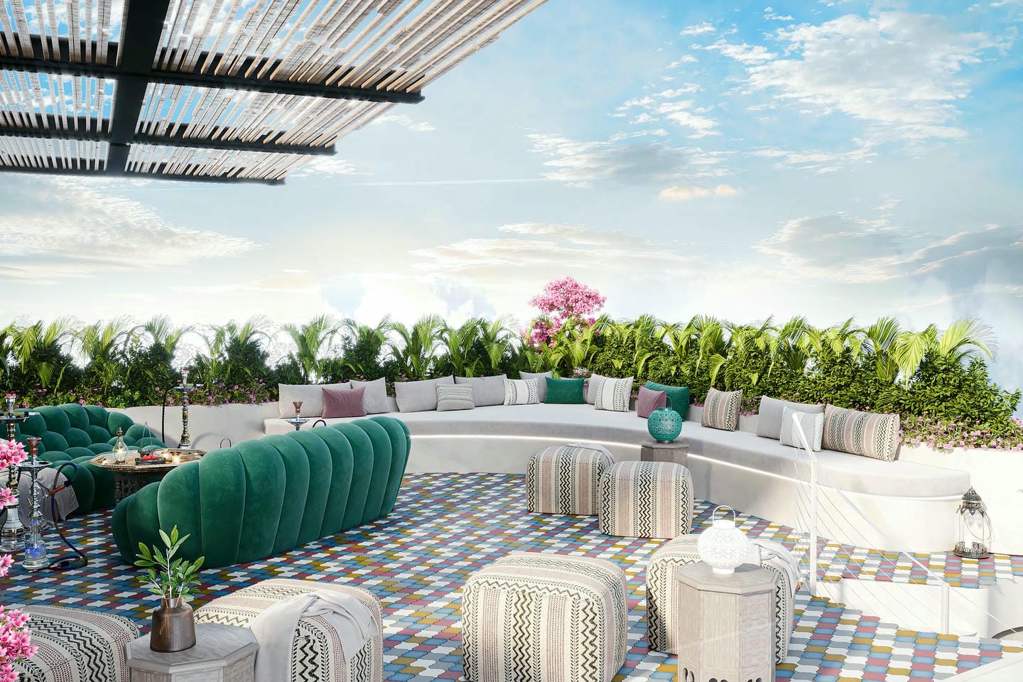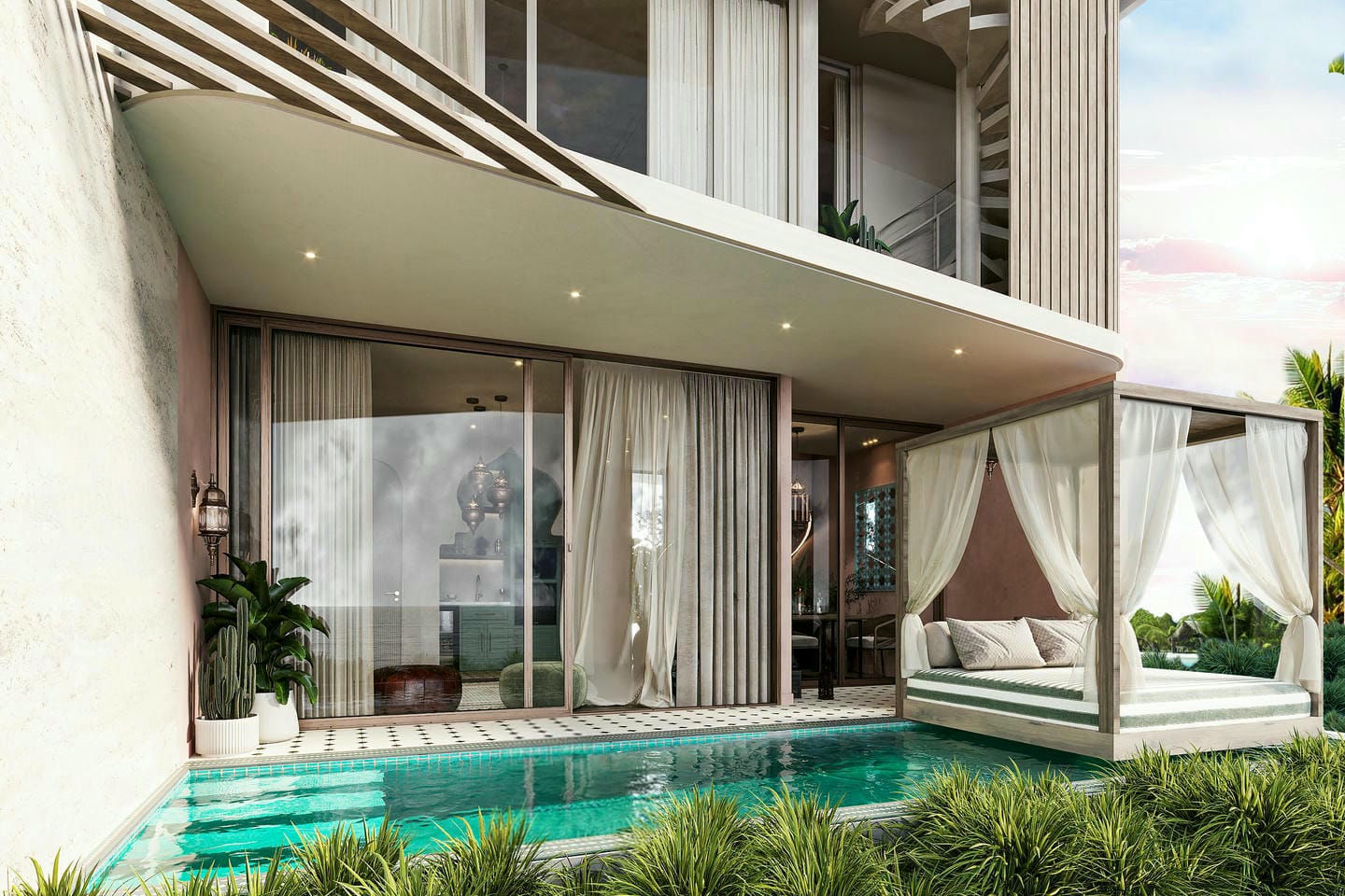 L’espace extérieur est conçu pour le confort et la détente, avec une piscine privée entourée de verdure luxuriante et un espace lounge ombragé avec daybed, parfait pour se relaxer. La terrasse sur le toit propose des assises élégantes et une vue dégagée sur l’horizon, créant un cadre idéal pour profiter des couchers de soleil, recevoir des invités ou simplement se détendre dans un magnifique environnement tropical. Le complexe résidentiel est complété par des installations entièrement équipées, comprenant une salle de sport moderne, un espace yoga, un spa et un cinéma, offrant une expérience de vie complète axée sur le bien-être et les loisirs.