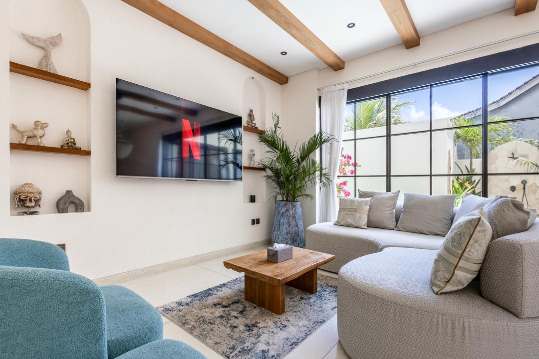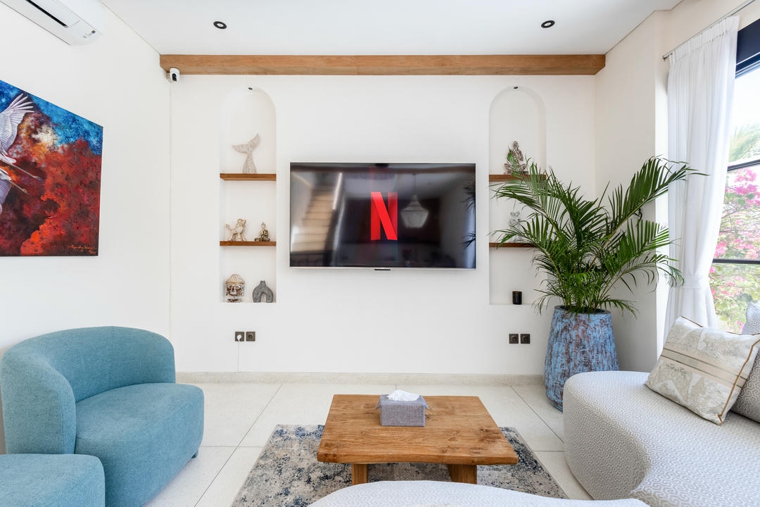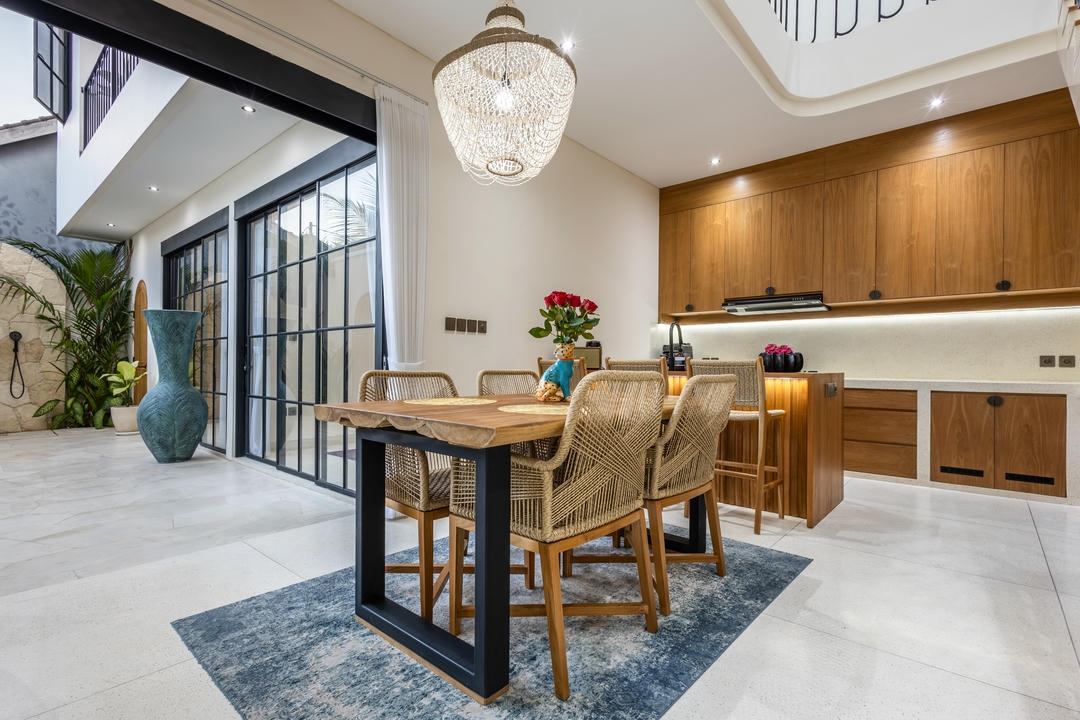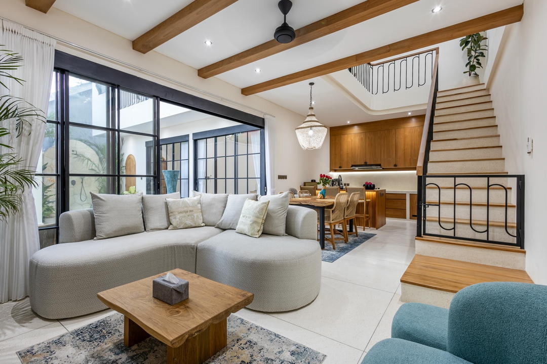 Cette villa à deux niveaux comprend 3 chambres avec salles de bain attenantes, un salon fermé avec de grandes baies vitrées et des plafonds hauts, et est entièrement meublée avec une cuisine moderne entièrement équipée. Un espace de travail dédié rend cette villa idéale pour y vivre ou travailler à distance.