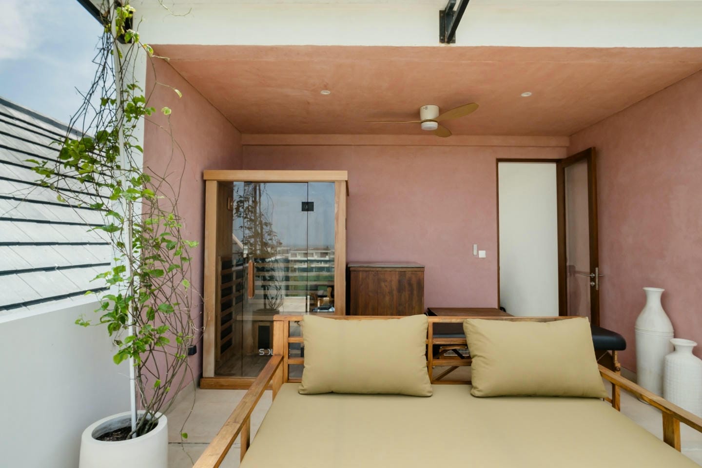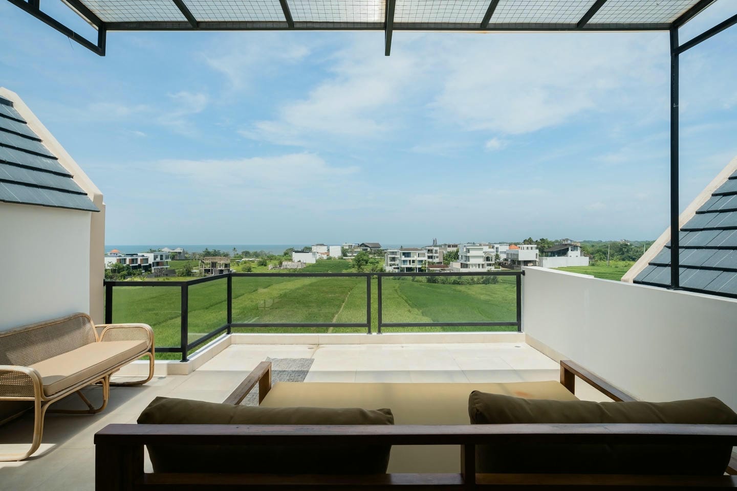 À l’extérieur, vous découvrirez un vaste espace avec une grande piscine, parfait pour se détendre ou recevoir. La terrasse sur le toit offre une vue dégagée sur les rizières protégées et l’océan, et comprend également un sauna et un bain glacé dédiés à la récupération et au bien-être.