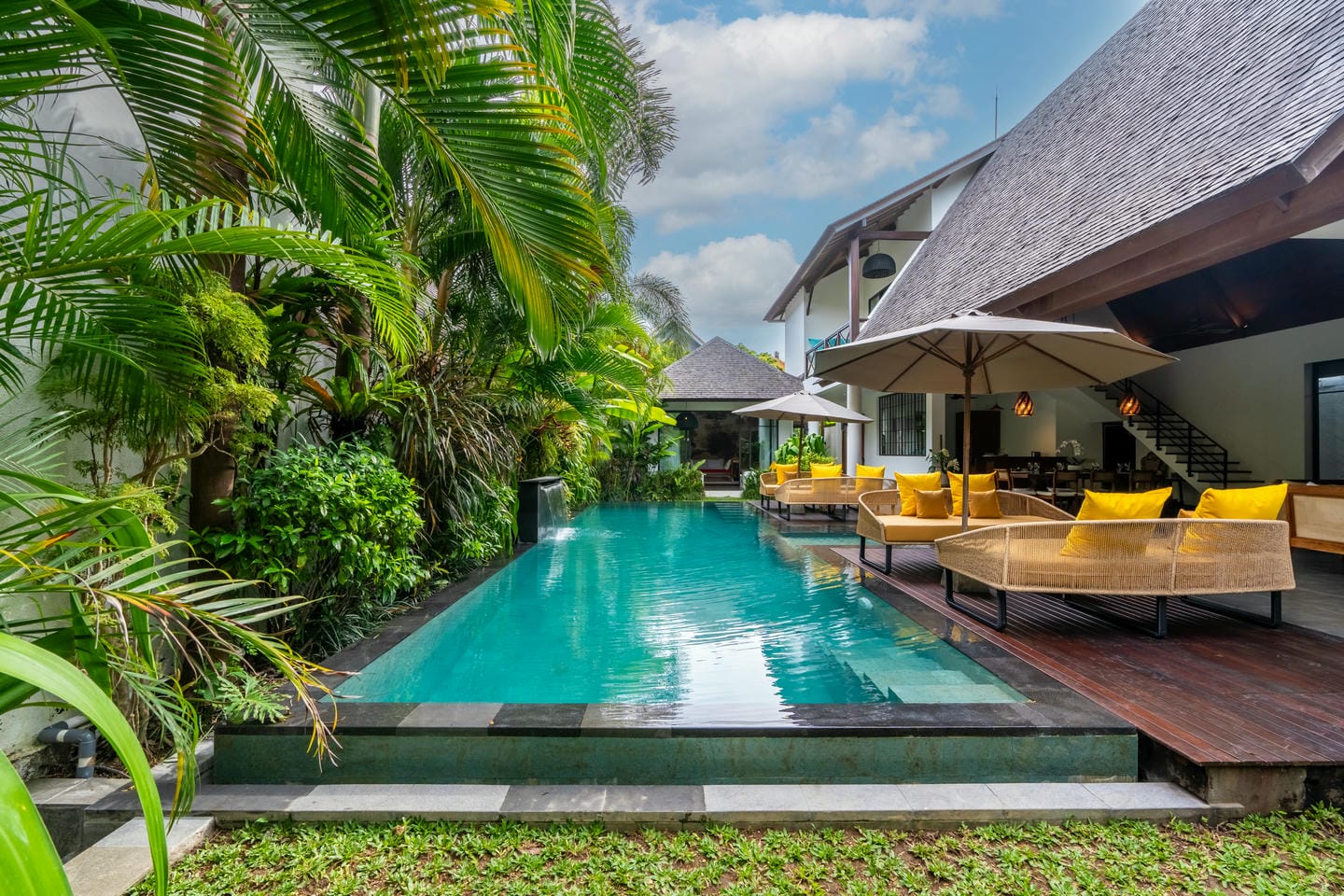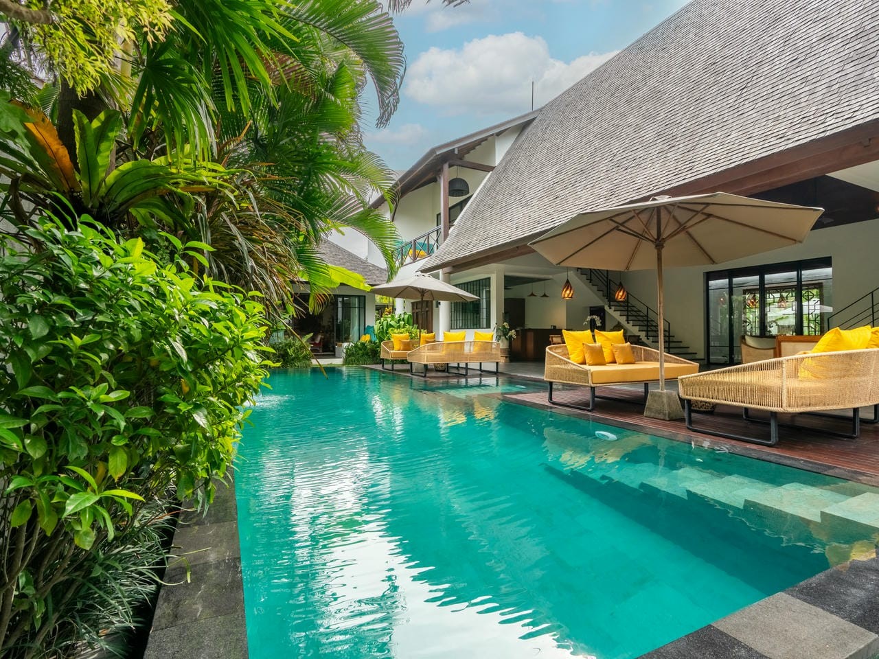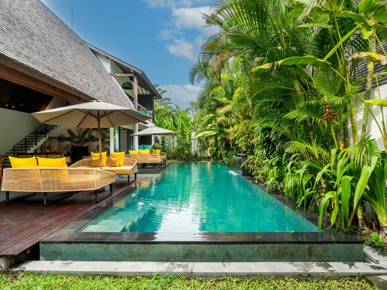 Une piscine de 48 m² constitue le cœur de la villa, agrémentée de canapés-lounge confortables, parfaits pour se détendre sous le soleil balinais.