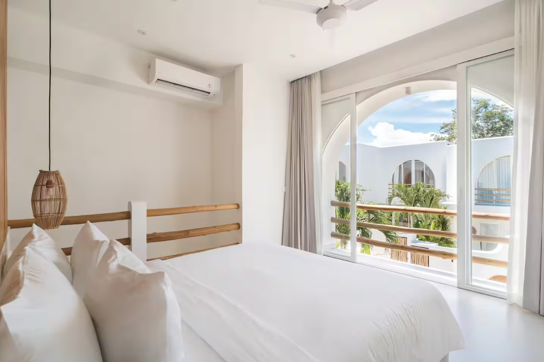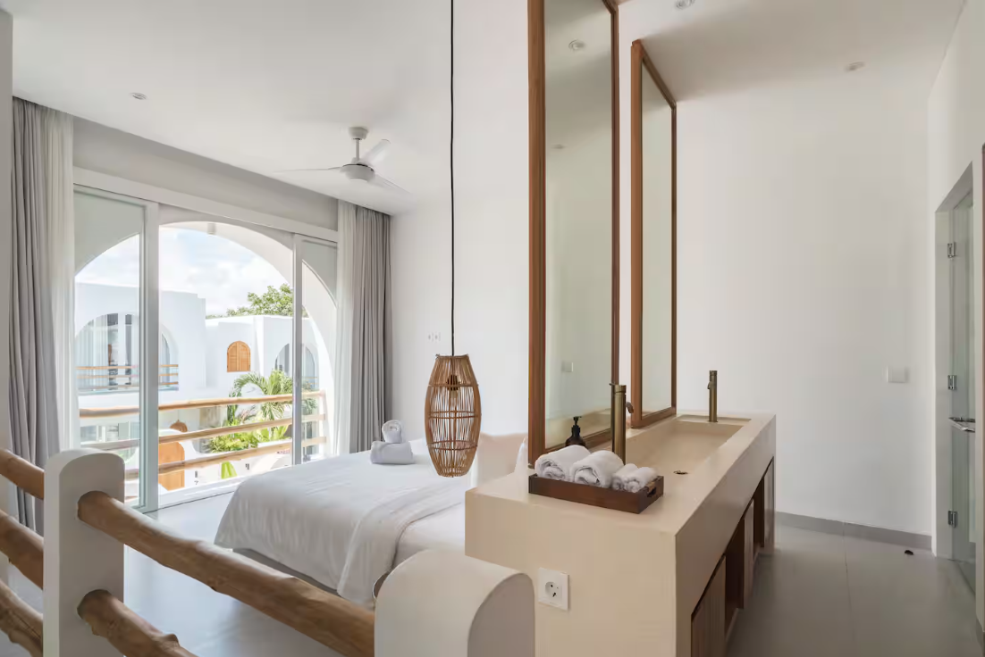 Conçue sur deux niveaux, la villa comprend une spacieuse chambre avec salle de bain attenante, un salon fermé et une cuisine entièrement équipée, ainsi qu’une salle d’eau pour les invités.