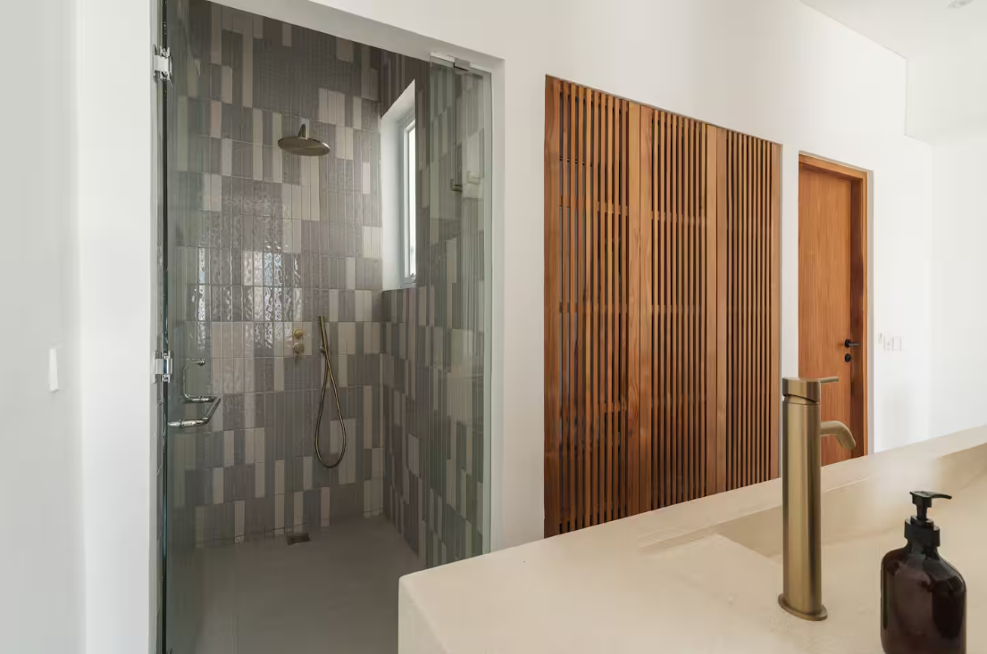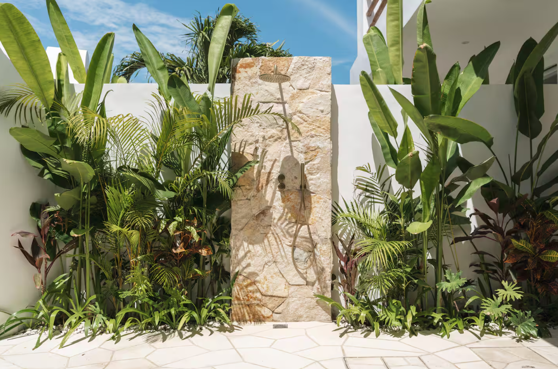 À l’extérieur, profitez de votre piscine privée avec espace lounge et douche extérieure — parfaite pour se rafraîchir après une journée à la plage.