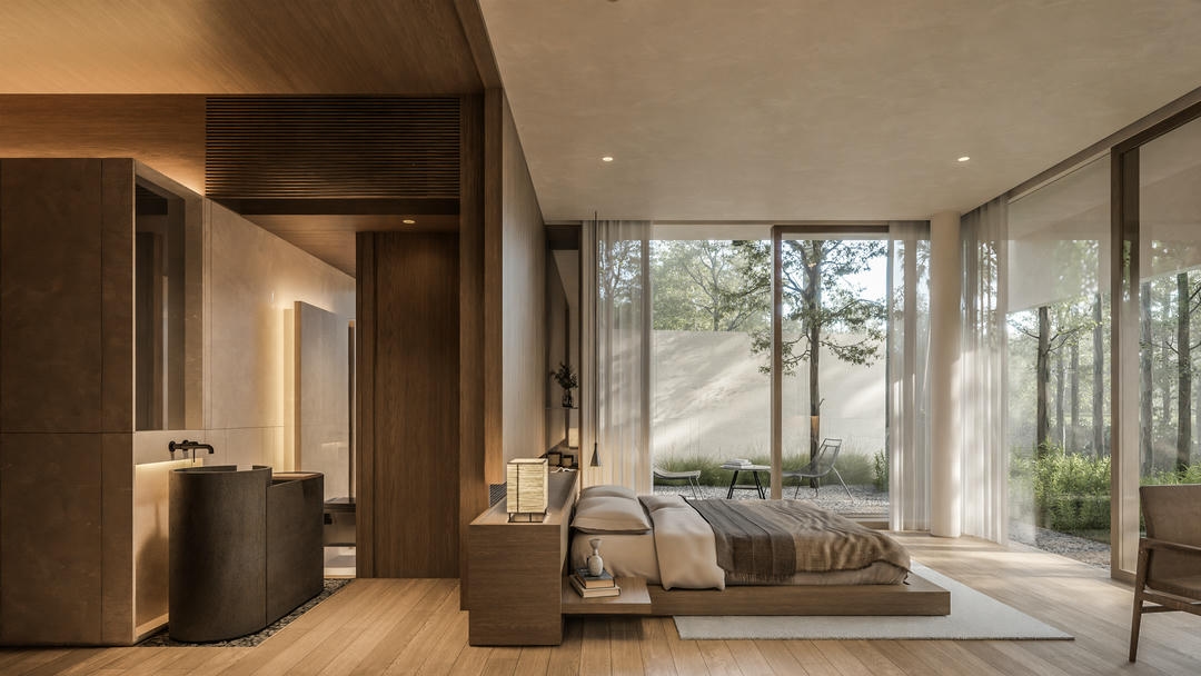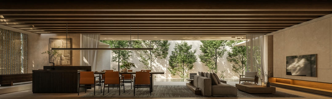 À l’extérieur, profitez d’une piscine privée, d’un salon en contrebas (sunken lounge) et d’un environnement verdoyant bordé d’arbres majestueux, offrant à la fois intimité et sérénité.