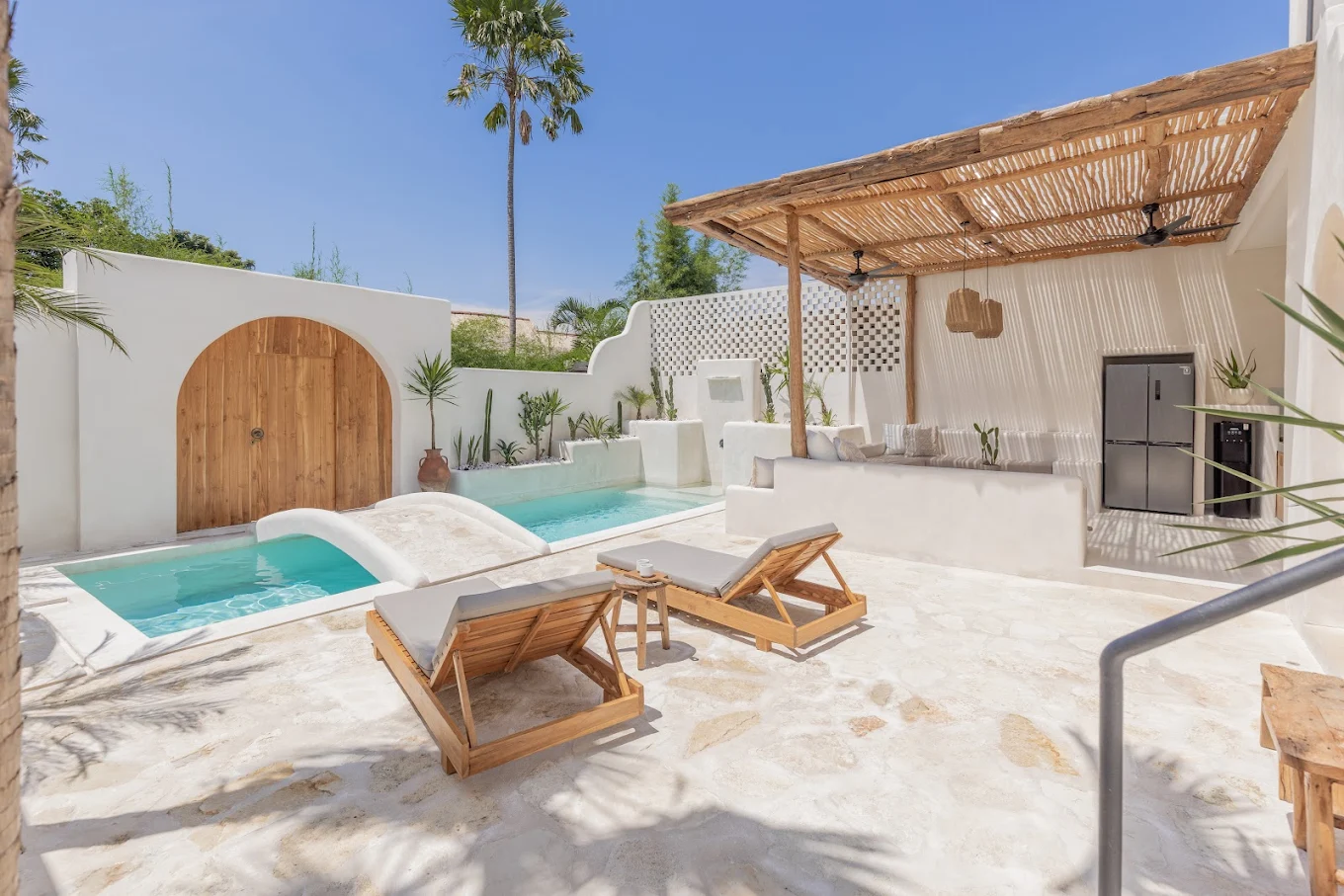 L’intérieur présente un design bohème minimaliste avec des touches de bois naturel, des murs blanchis à la chaux et des détails soignés qui créent une atmosphère chaleureuse et accueillante. Chaque espace est lumineux, aéré et conçu pour un séjour confortable.