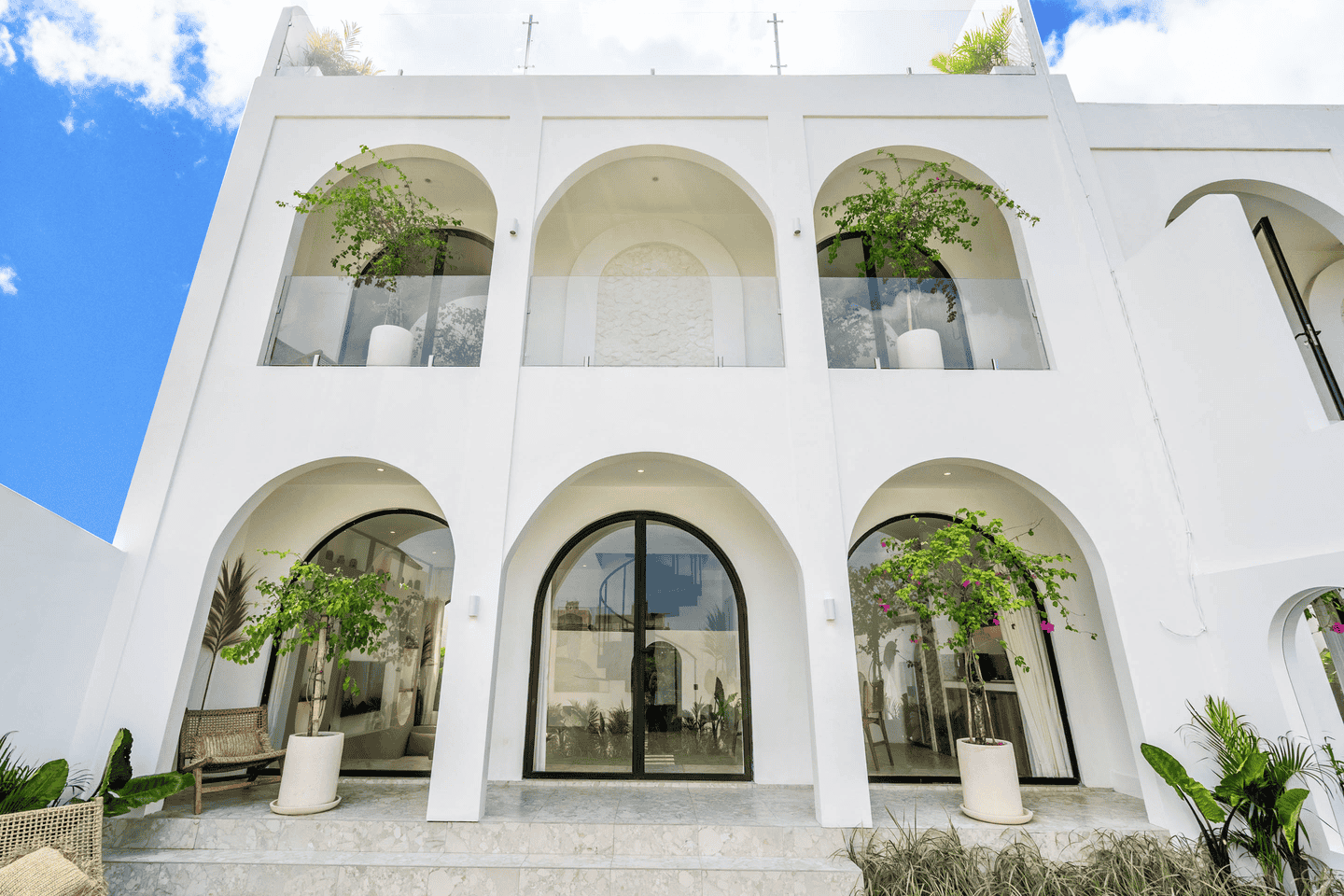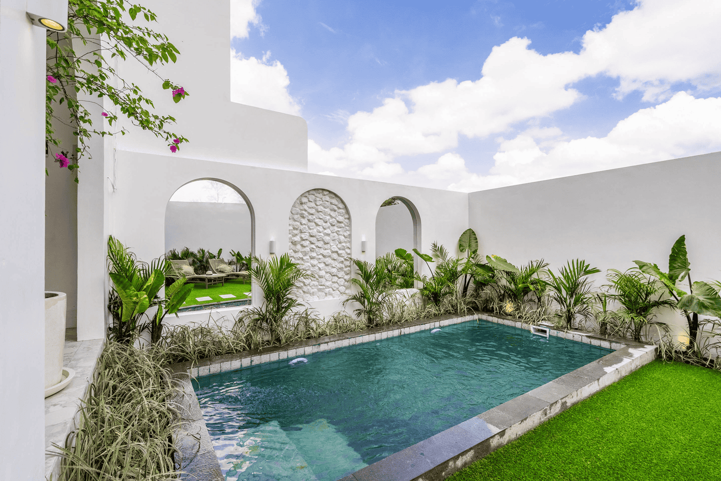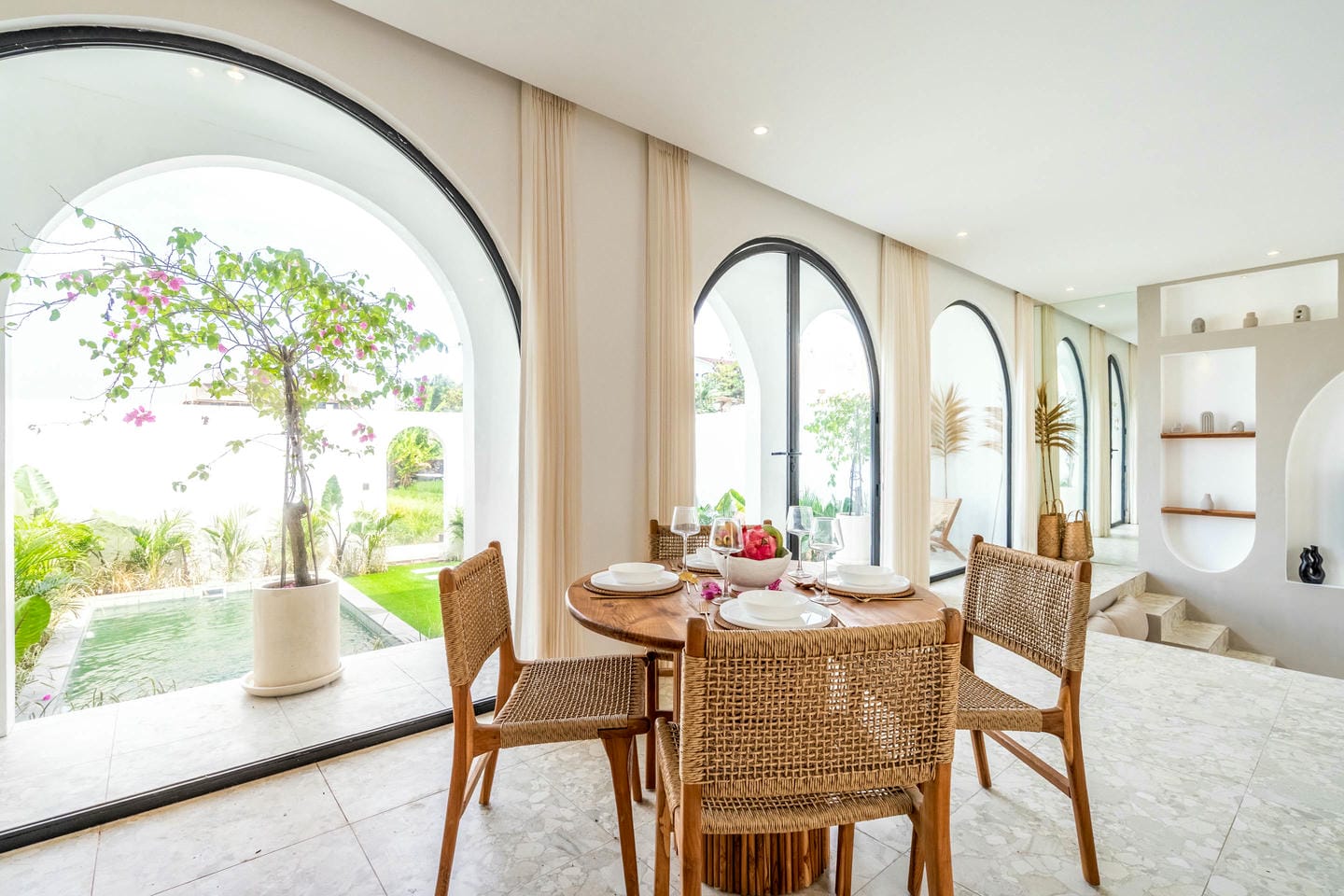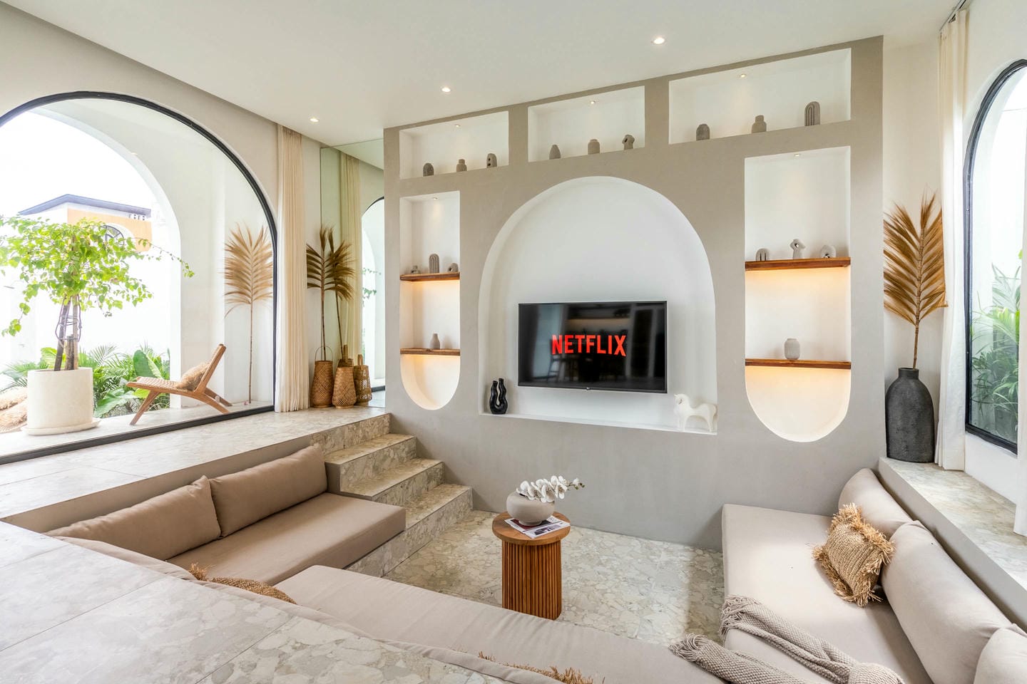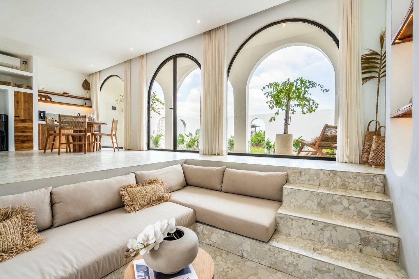 La villa présente un design lumineux et aéré d’inspiration méditerranéenne, avec des tons neutres et doux, des textures naturelles et d’élégantes portes cintrées qui créent une esthétique intemporelle. Le salon ouvert communique harmonieusement avec les espaces extérieurs, créant une atmosphère chaleureuse et accueillante.