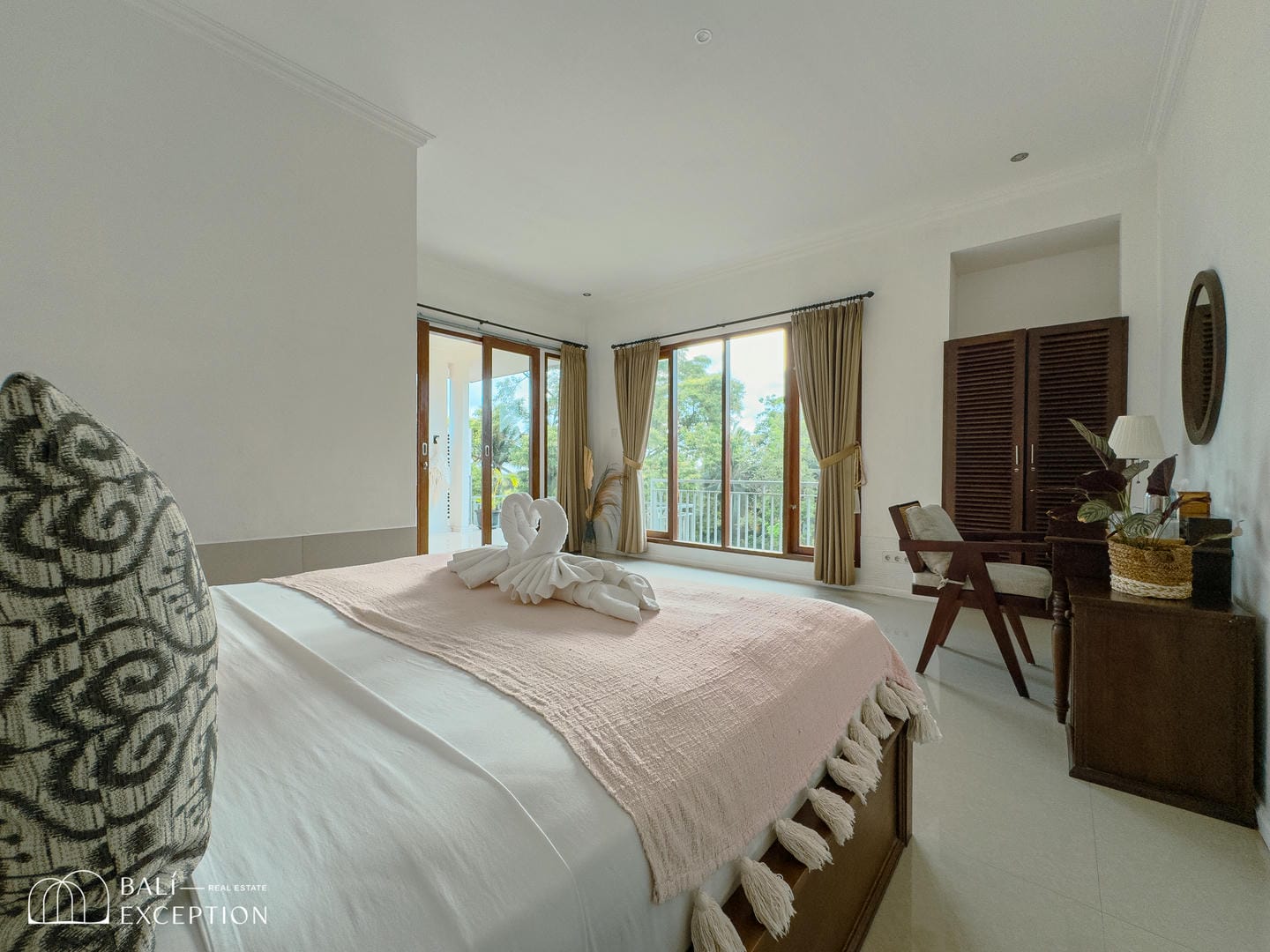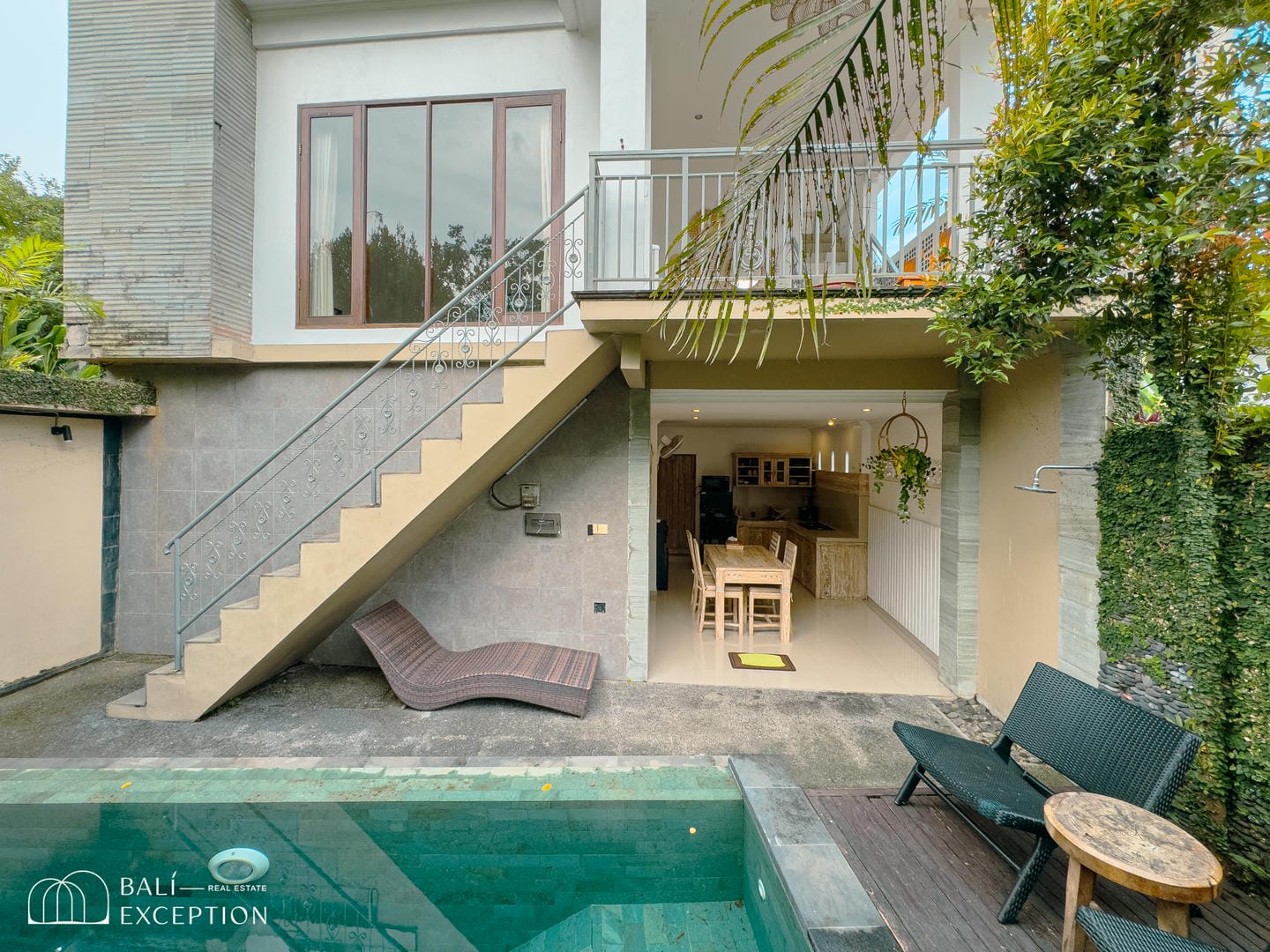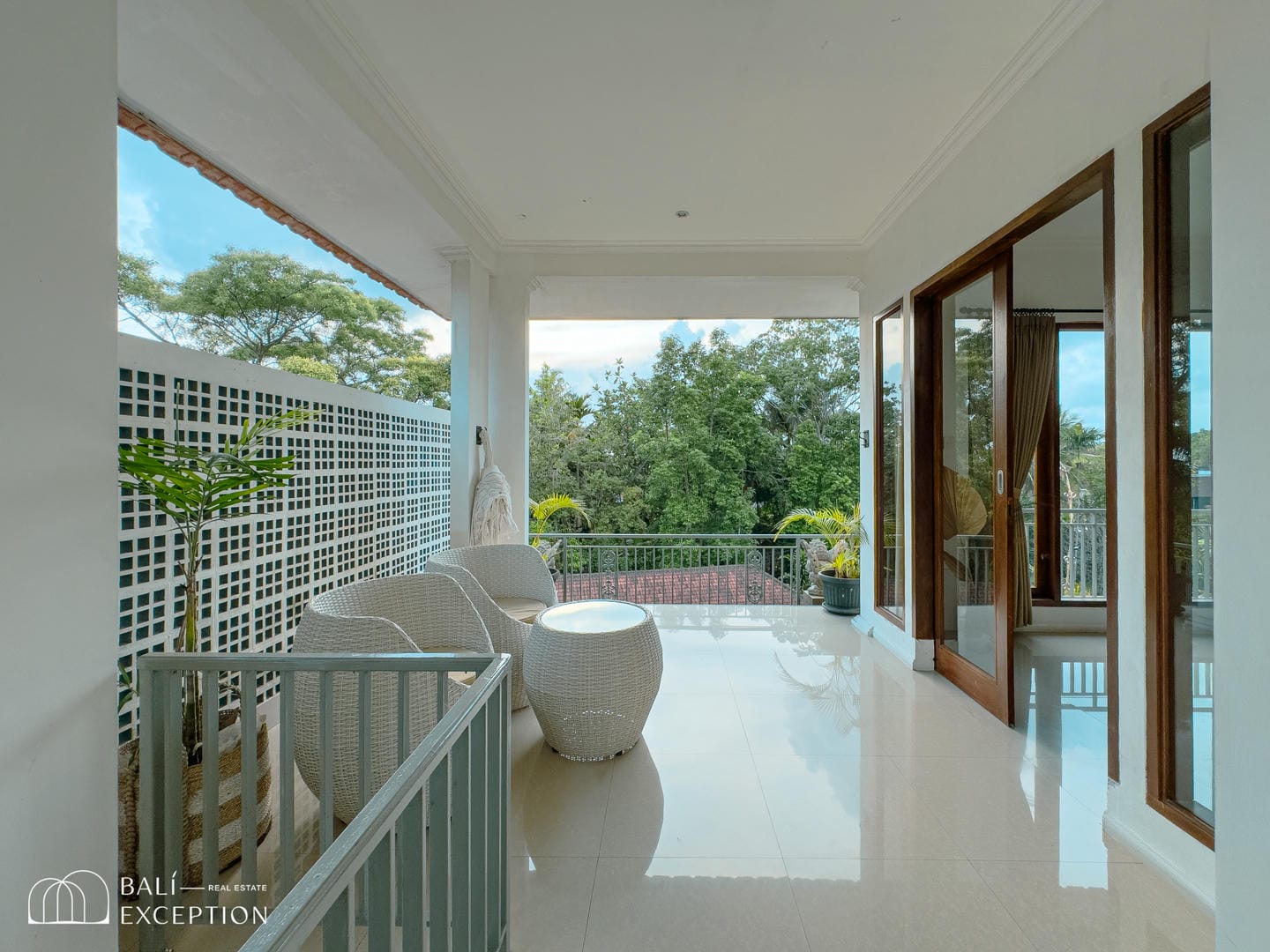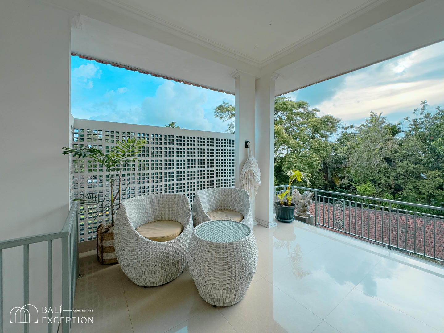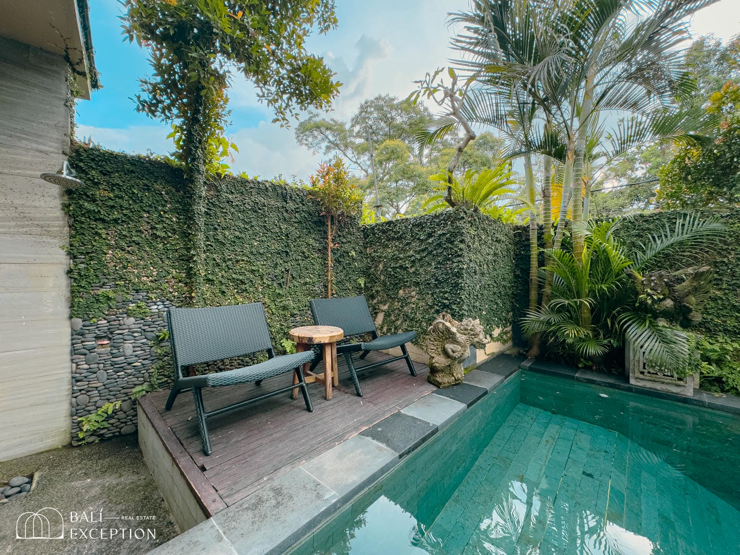 Pour parfaire l’expérience, la villa est dotée de sa propre piscine privée. Le balcon offre une vue apaisante sur les jardins luxuriants et la piscine scintillante.