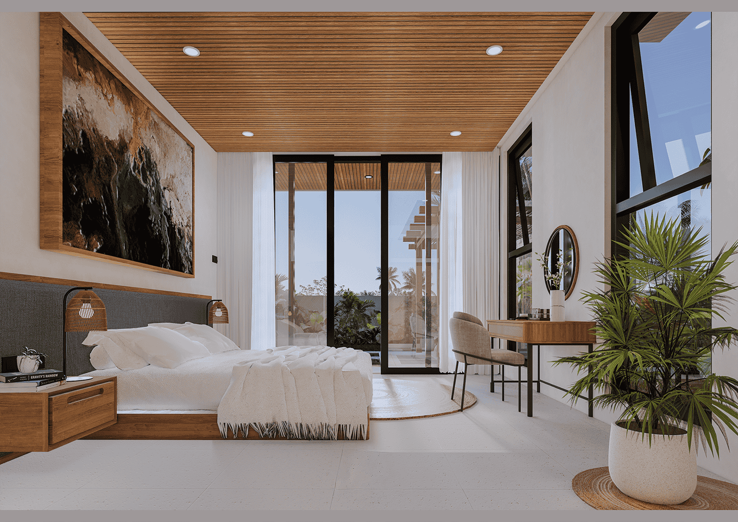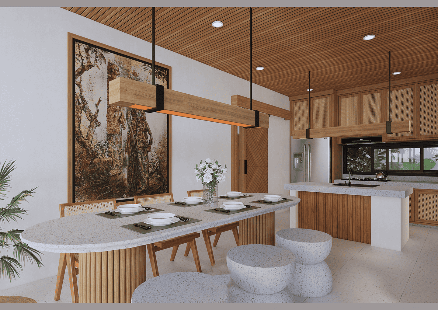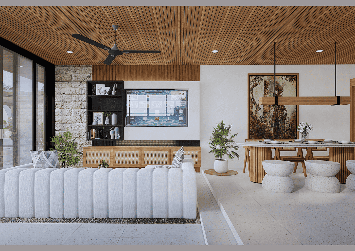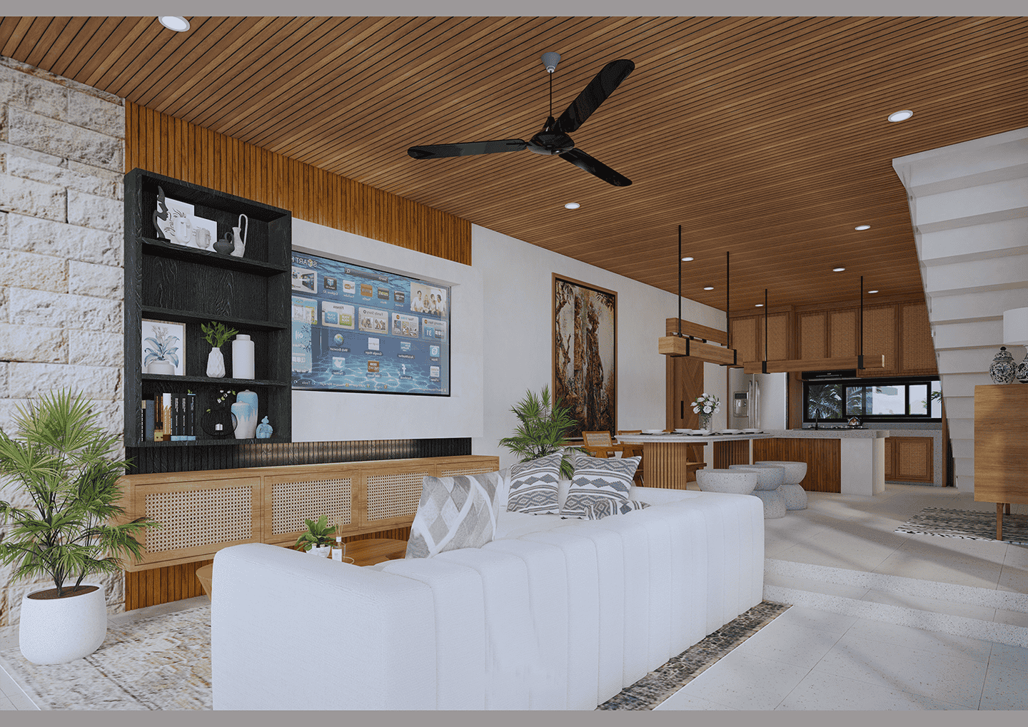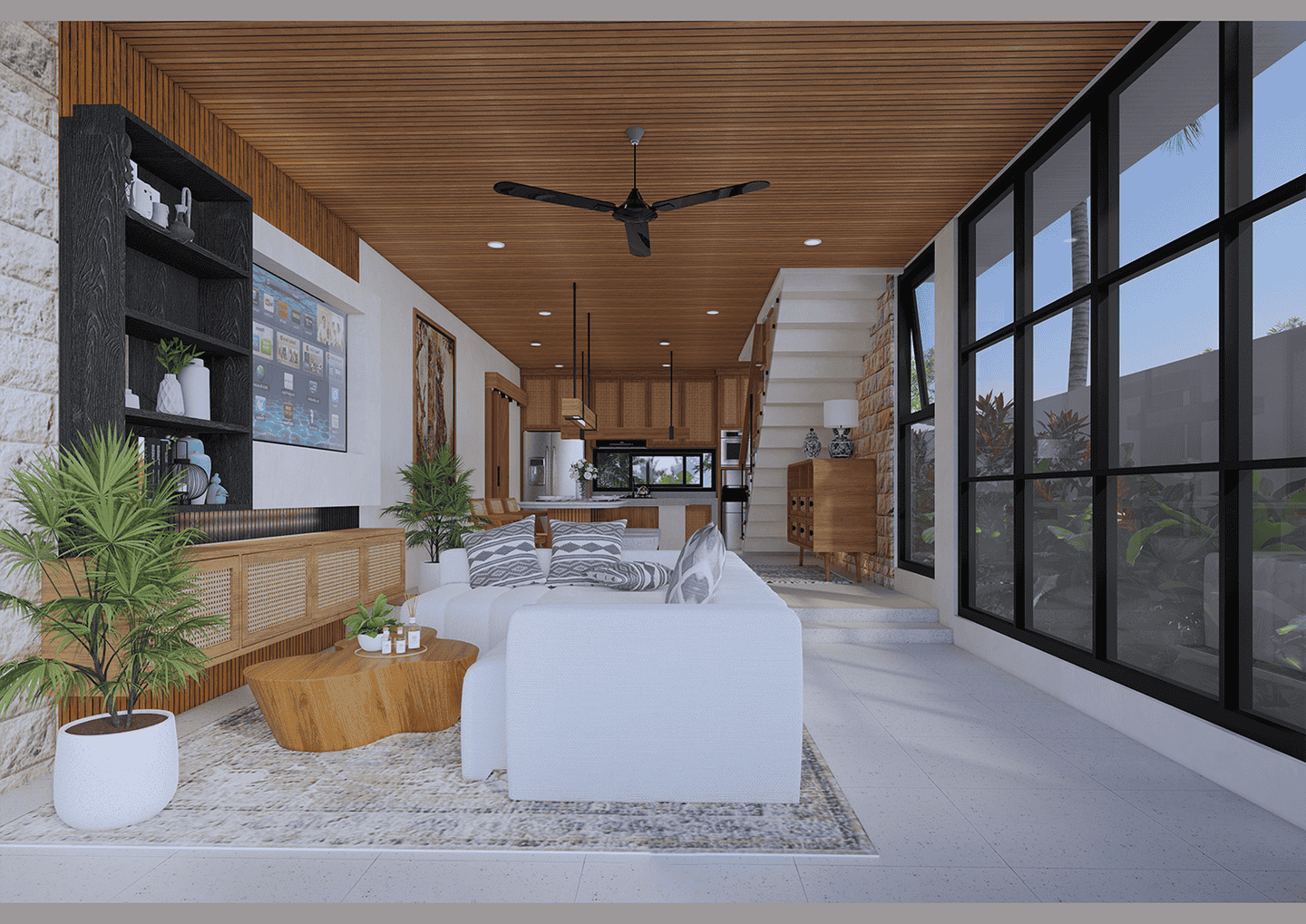 L’intérieur de la villa arbore un design tropical moderne avec une touche chaleureuse. De hauts plafonds, des finitions en bois naturel et de grandes baies vitrées créent une atmosphère aérée alliant confort intérieur et beauté extérieure. Chaque détail reflète un équilibre entre style et fonctionnalité, idéal pour la détente et la vie quotidienne.