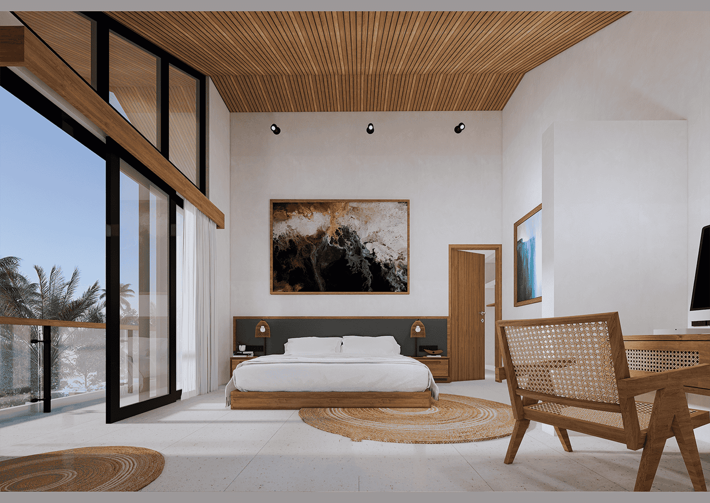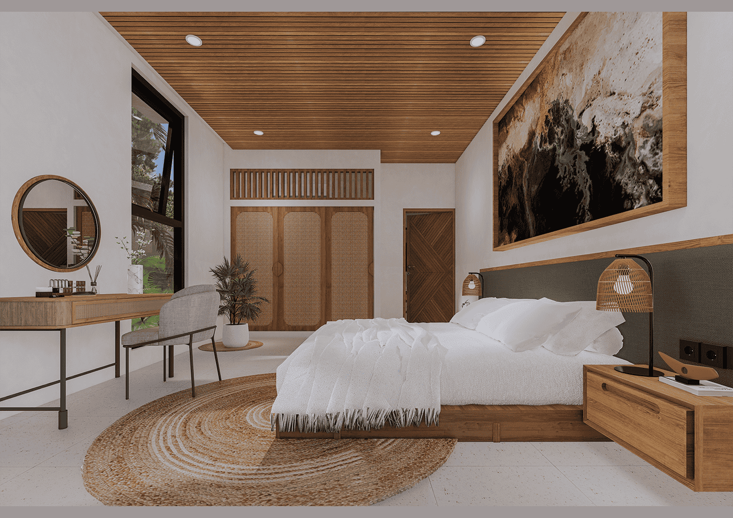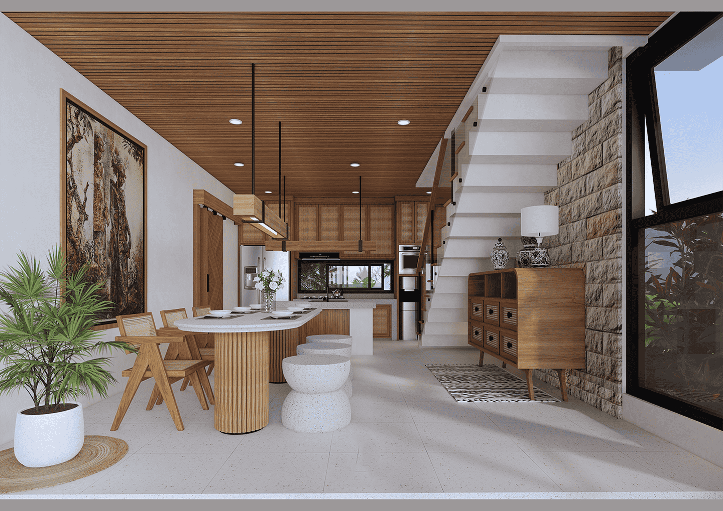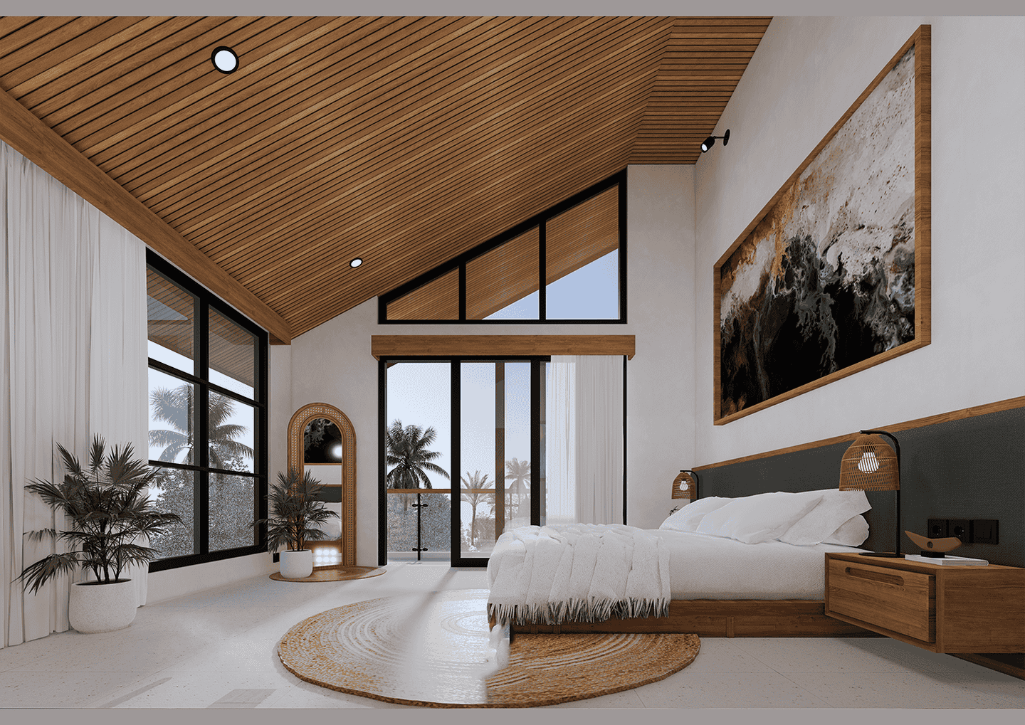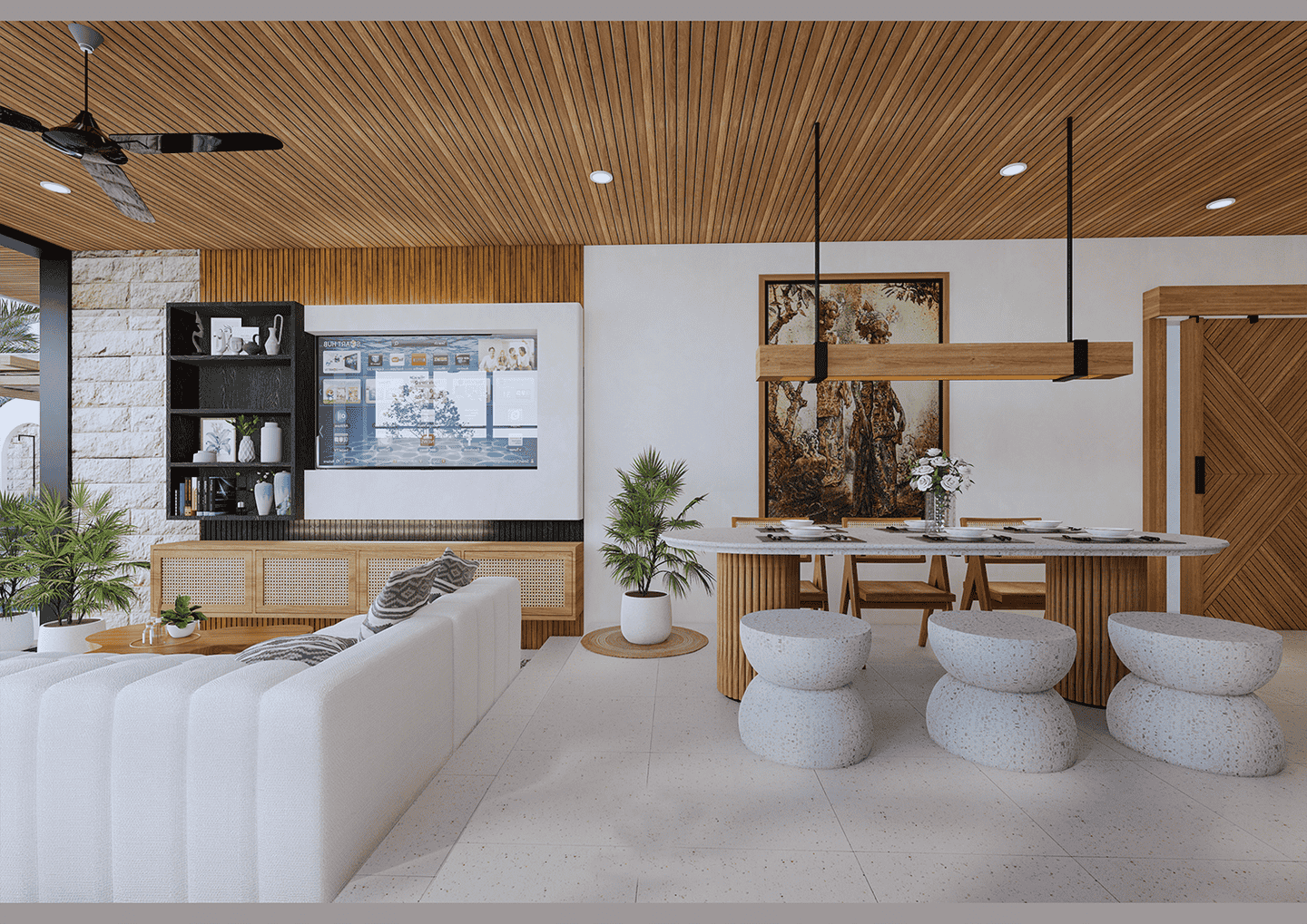 L’intérieur de la villa arbore un design tropical moderne avec une touche chaleureuse. De hauts plafonds, des finitions en bois naturel et de grandes baies vitrées créent une atmosphère aérée alliant confort intérieur et beauté extérieure. Chaque détail reflète un équilibre entre style et fonctionnalité, idéal pour la détente et la vie quotidienne.