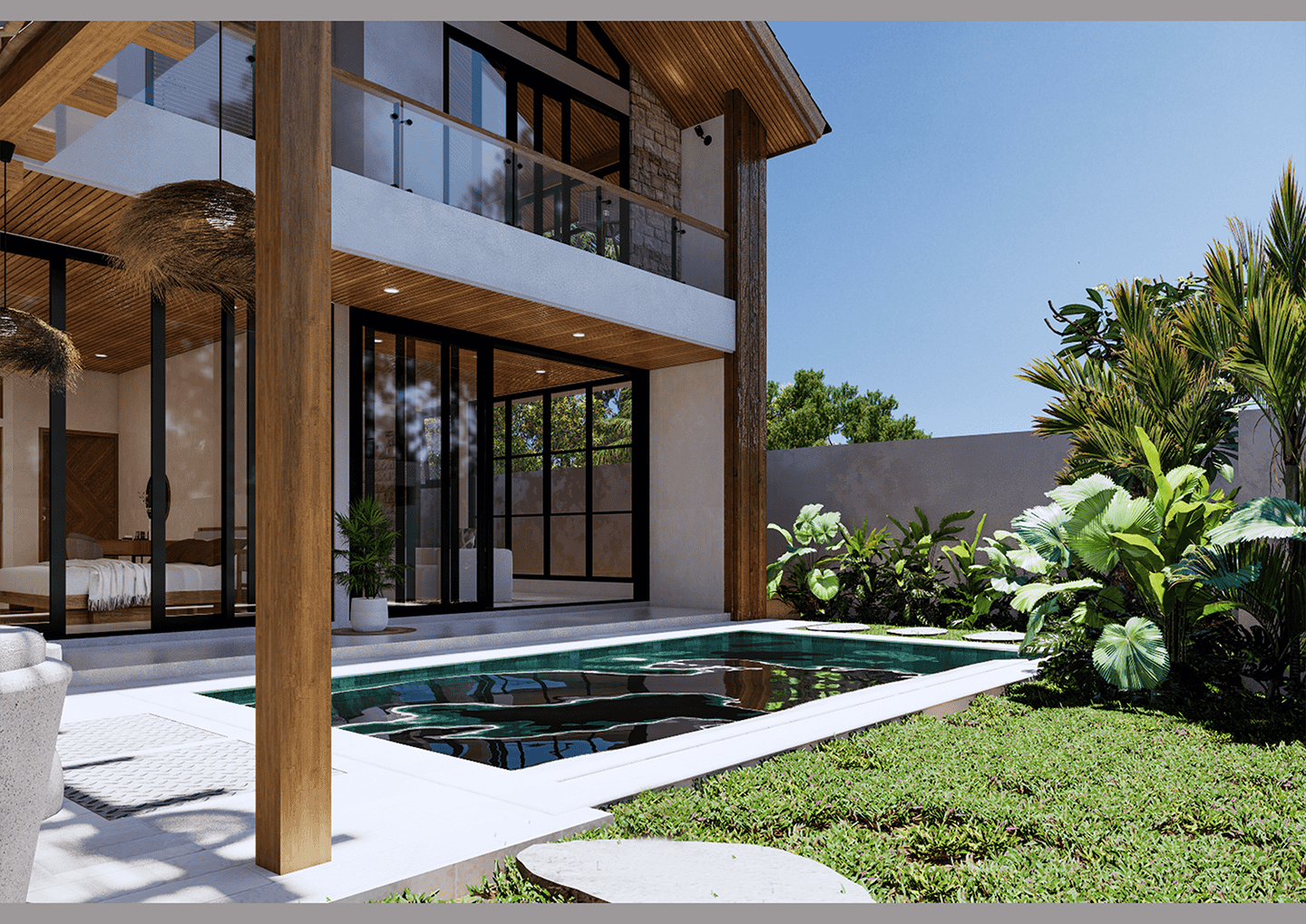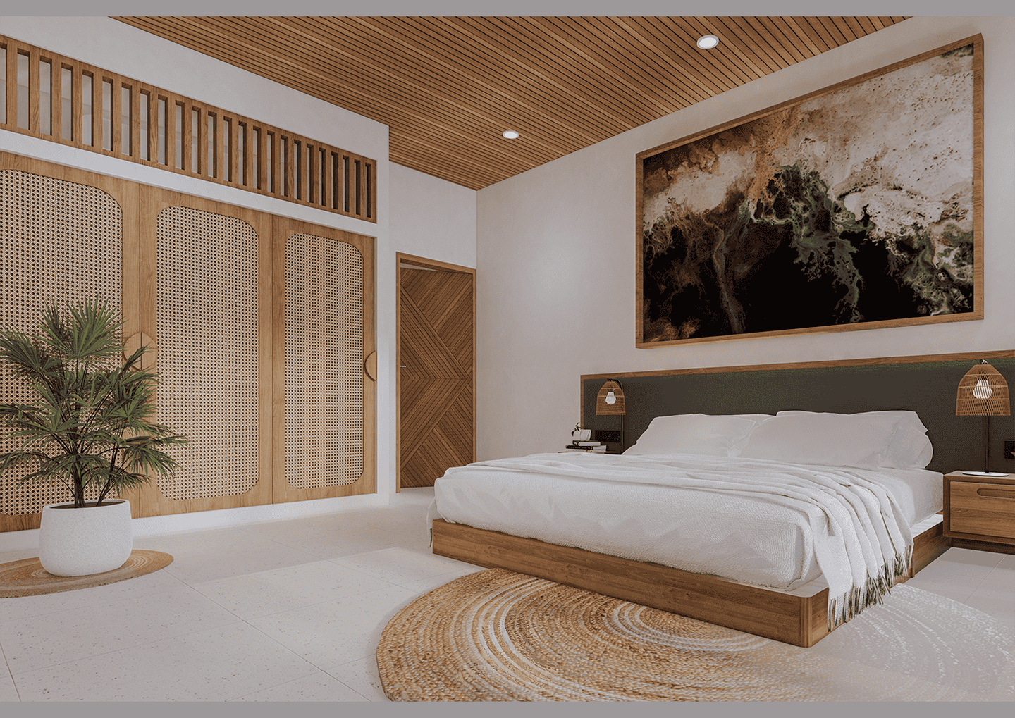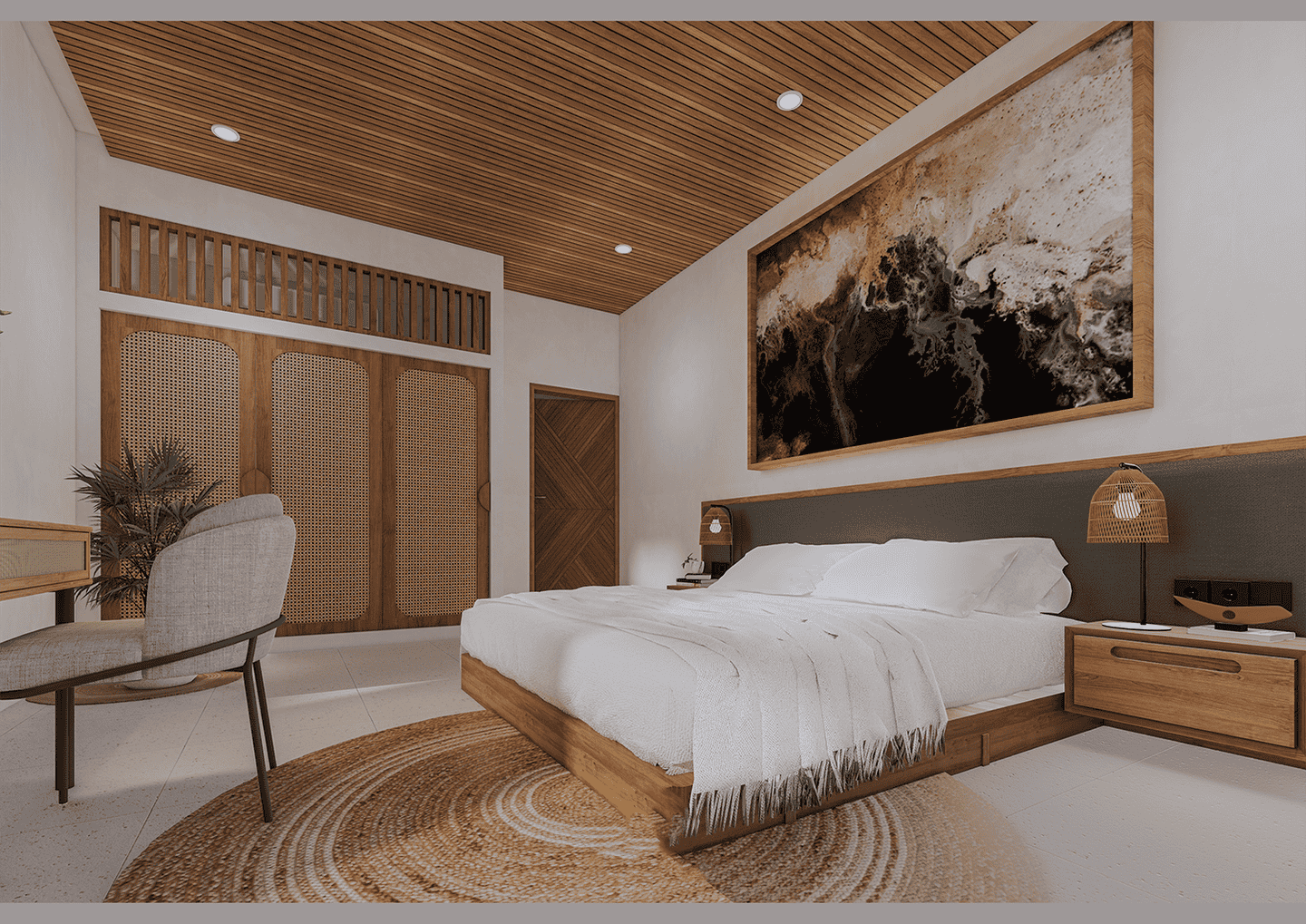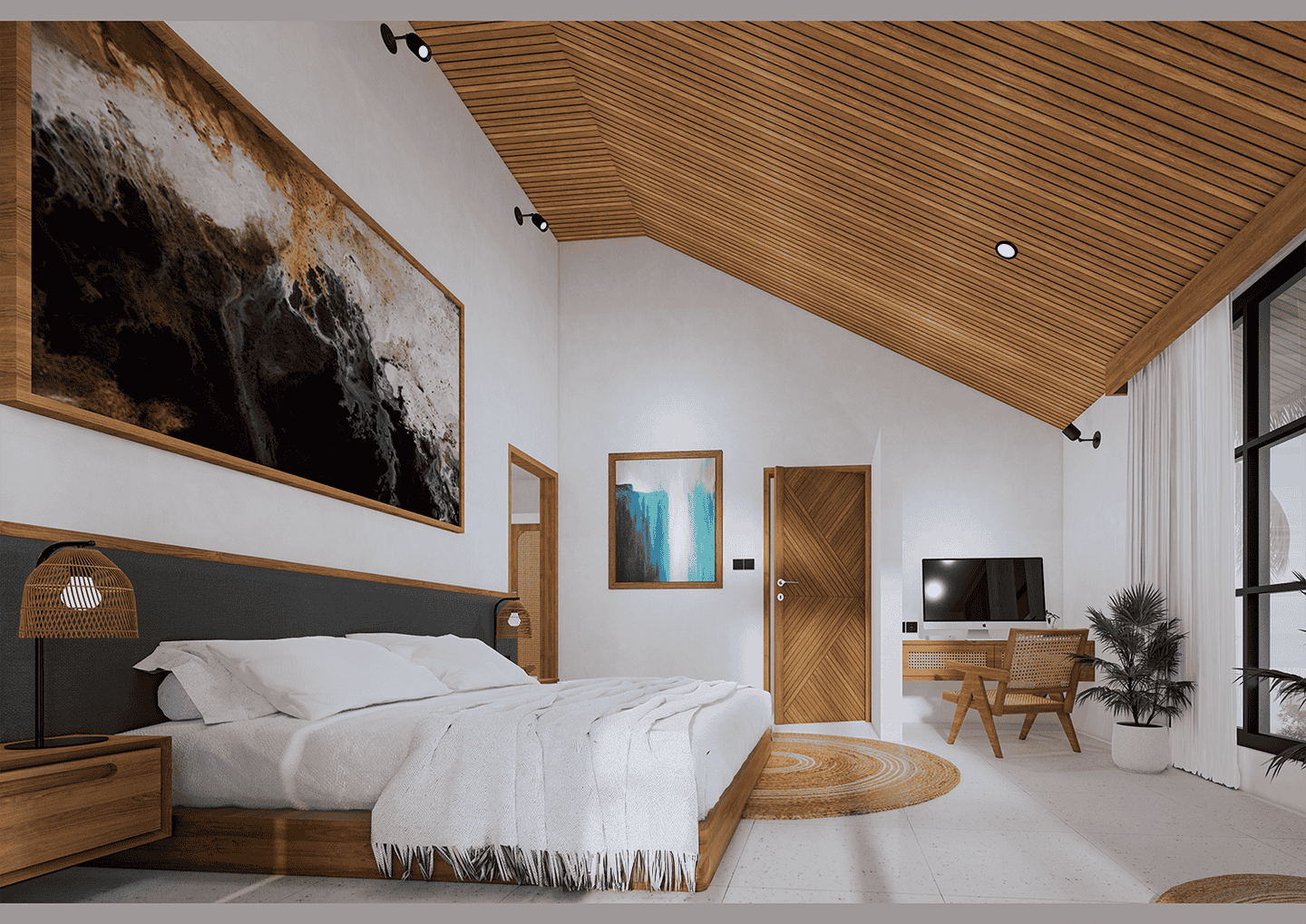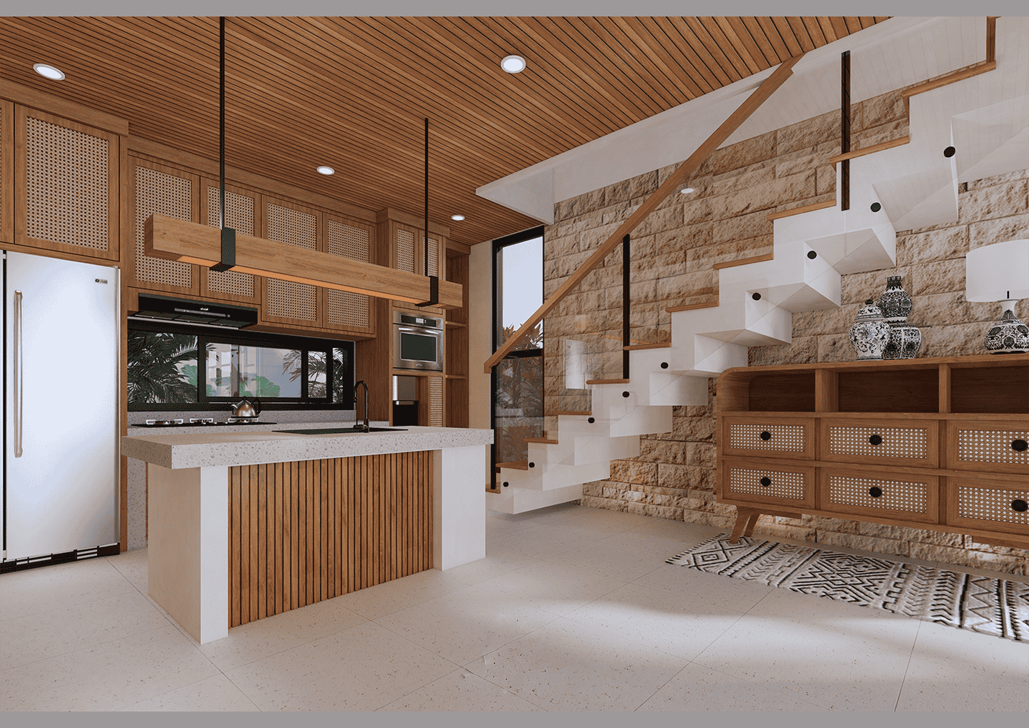L’intérieur de la villa arbore un design tropical moderne avec une touche chaleureuse. De hauts plafonds, des finitions en bois naturel et de grandes baies vitrées créent une atmosphère aérée alliant confort intérieur et beauté extérieure. Chaque détail reflète un équilibre entre style et fonctionnalité, idéal pour la détente et la vie quotidienne.