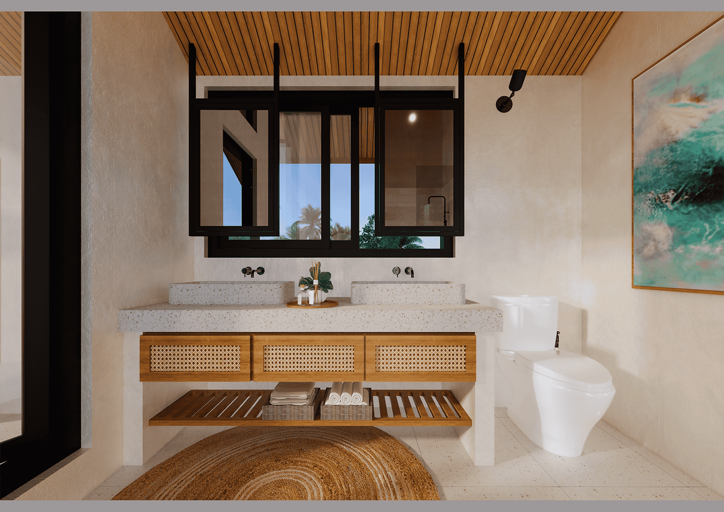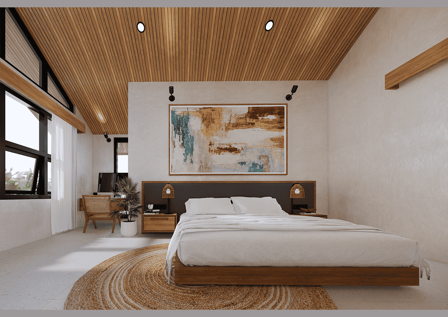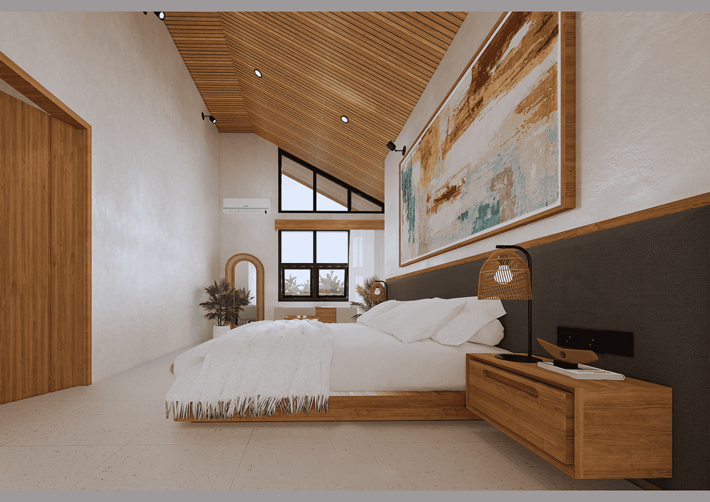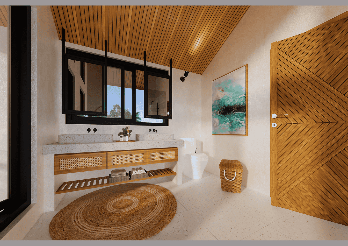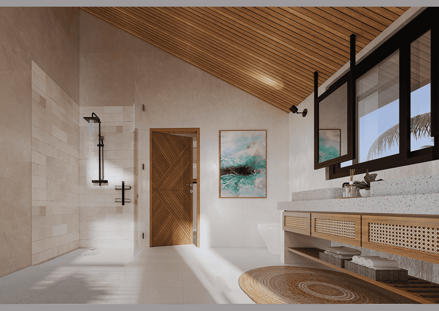 L’intérieur de la villa arbore un design tropical moderne avec une touche chaleureuse. De hauts plafonds, des finitions en bois naturel et de grandes baies vitrées créent une atmosphère aérée alliant confort intérieur et beauté extérieure. Chaque détail reflète un équilibre entre style et fonctionnalité, idéal pour la détente et la vie quotidienne.