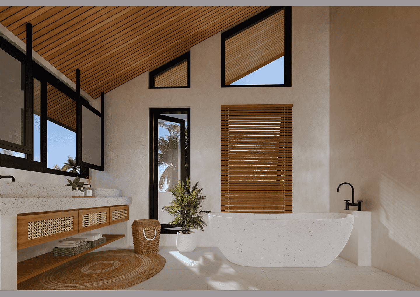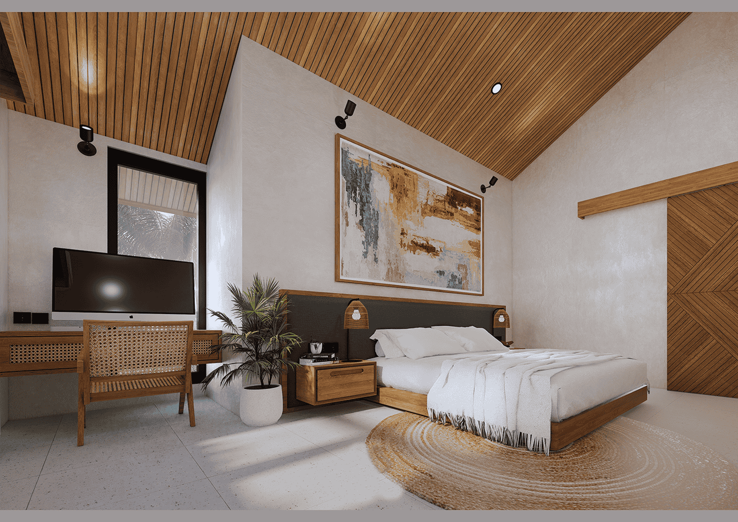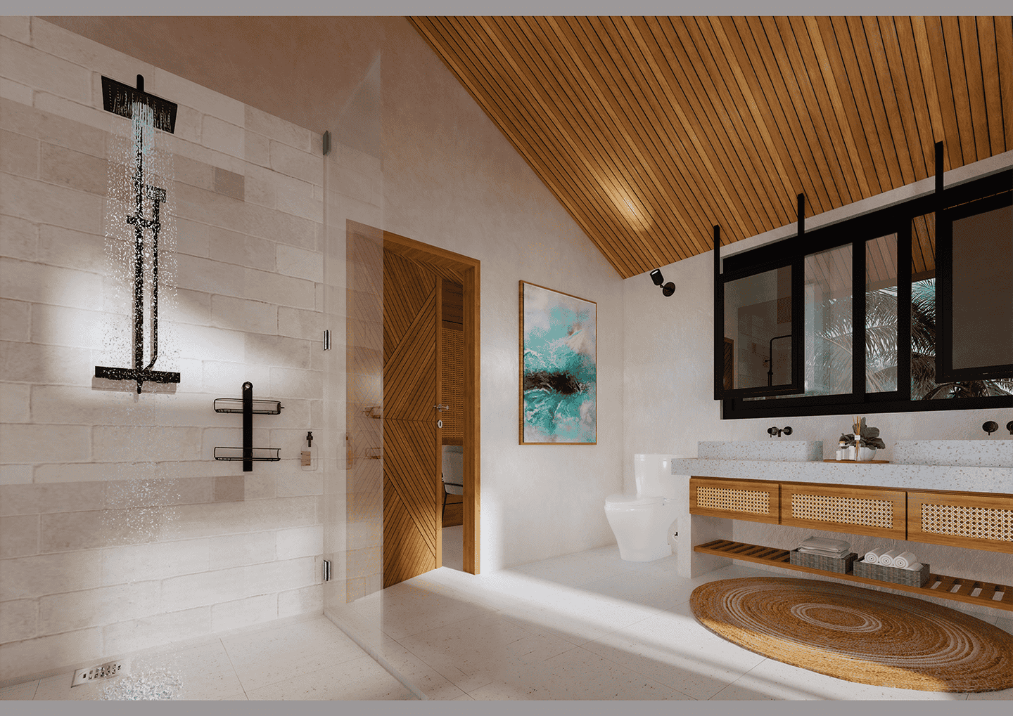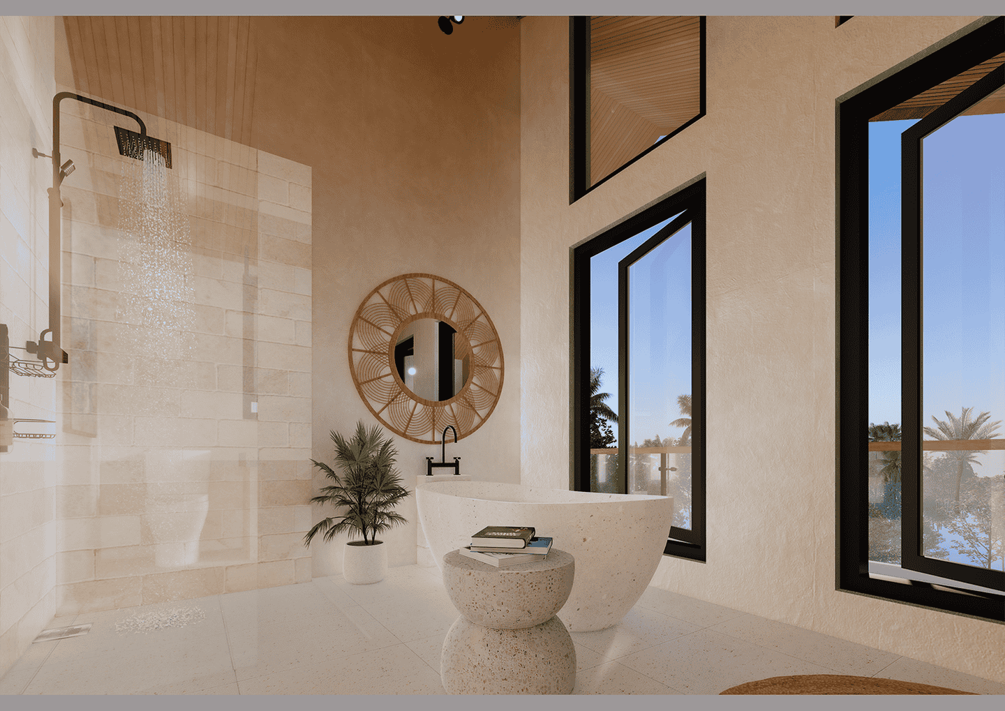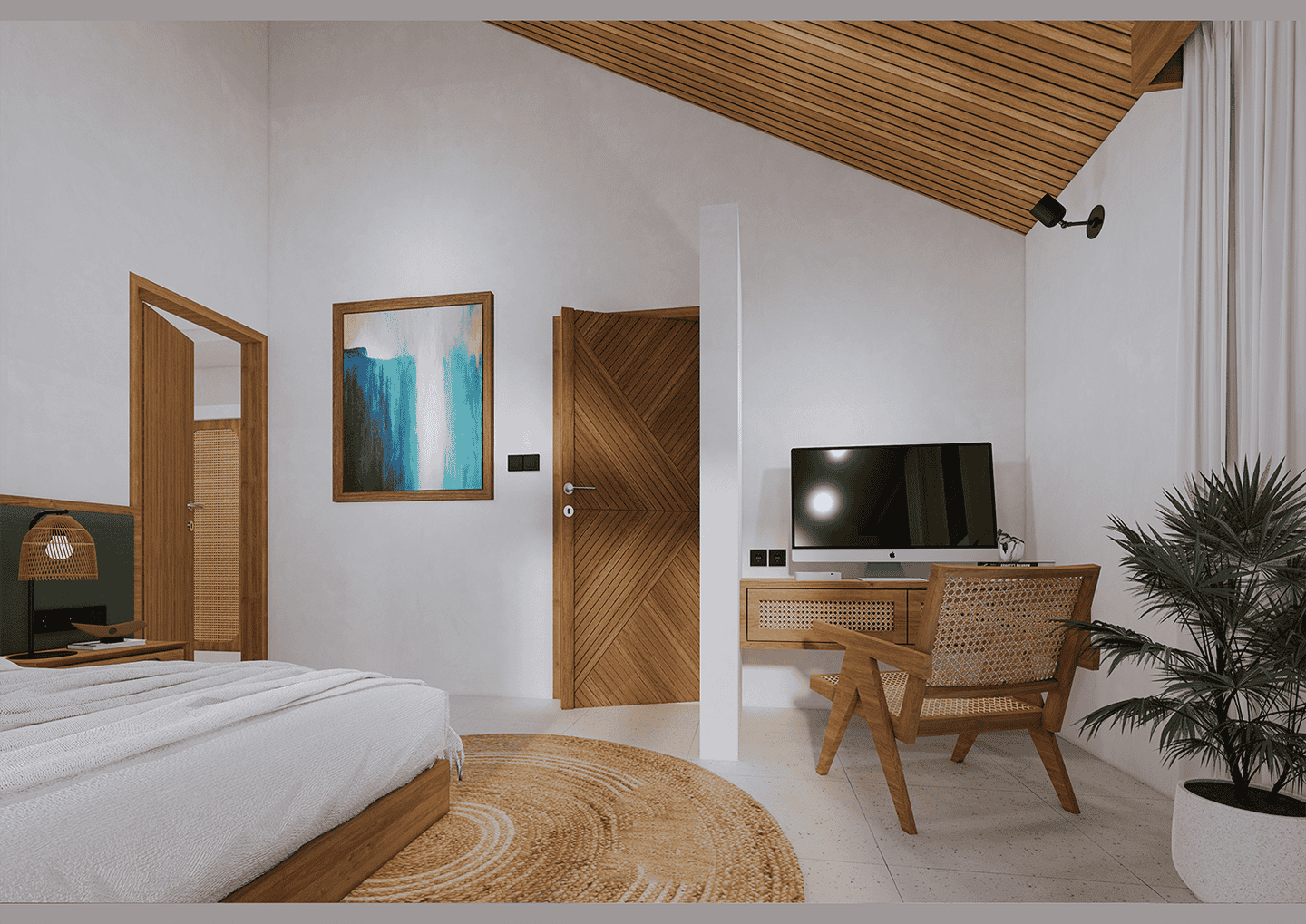 L’intérieur de la villa arbore un design tropical moderne avec une touche chaleureuse. De hauts plafonds, des finitions en bois naturel et de grandes baies vitrées créent une atmosphère aérée alliant confort intérieur et beauté extérieure. Chaque détail reflète un équilibre entre style et fonctionnalité, idéal pour la détente et la vie quotidienne.