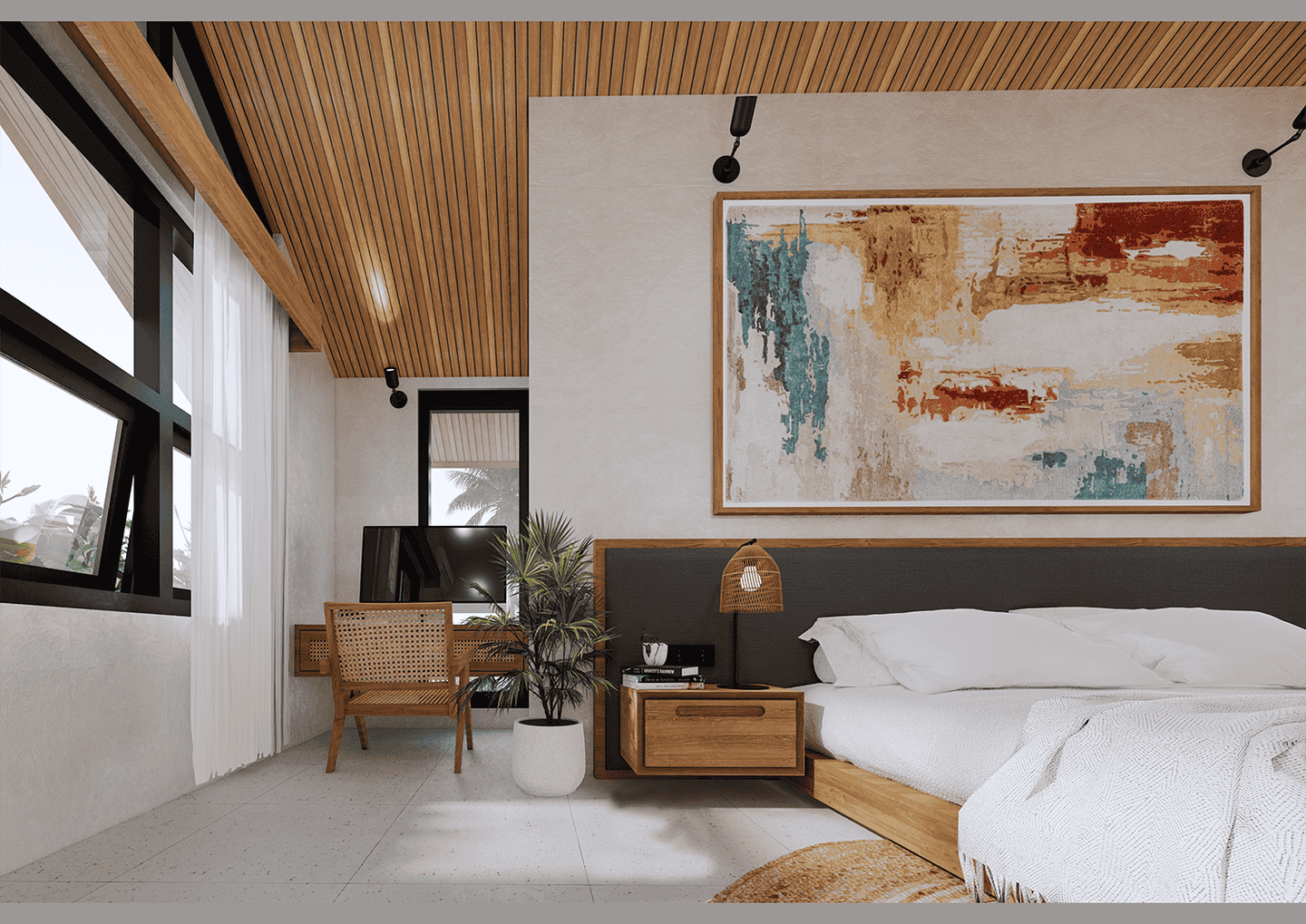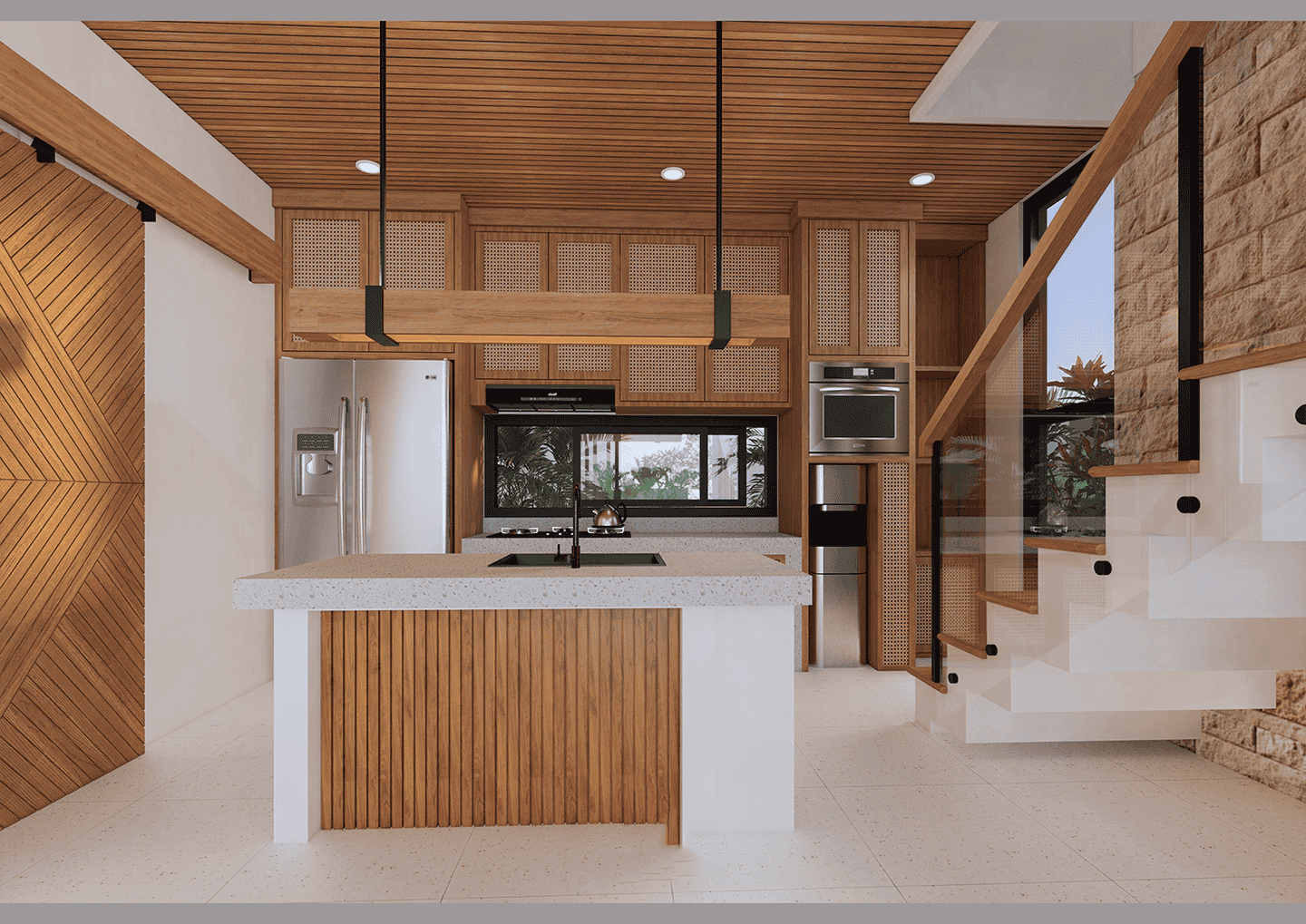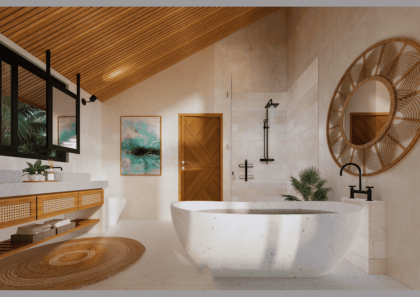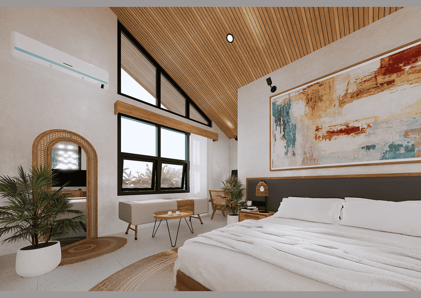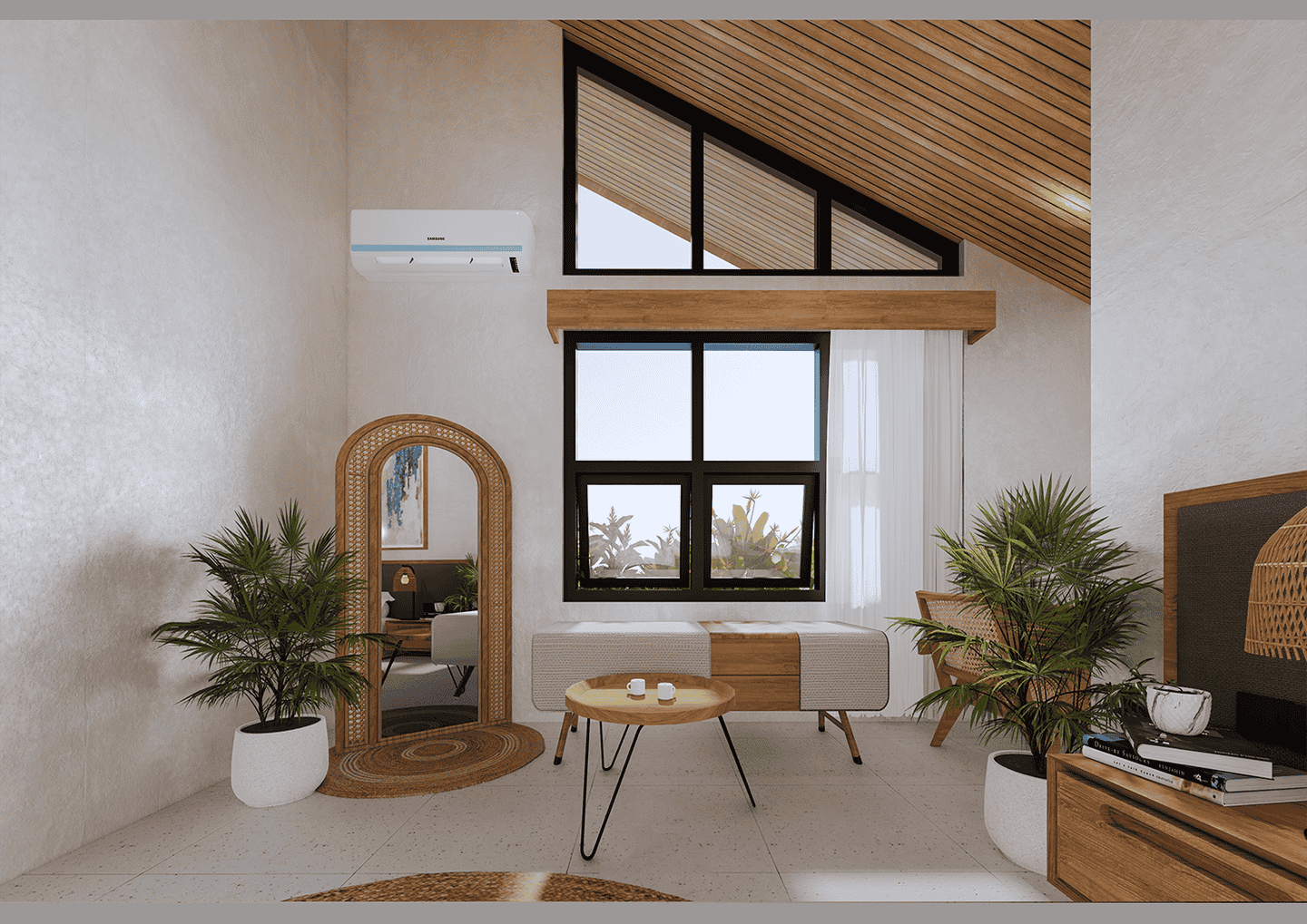 L’intérieur de la villa arbore un design tropical moderne avec une touche chaleureuse. De hauts plafonds, des finitions en bois naturel et de grandes baies vitrées créent une atmosphère aérée alliant confort intérieur et beauté extérieure. Chaque détail reflète un équilibre entre style et fonctionnalité, idéal pour la détente et la vie quotidienne.